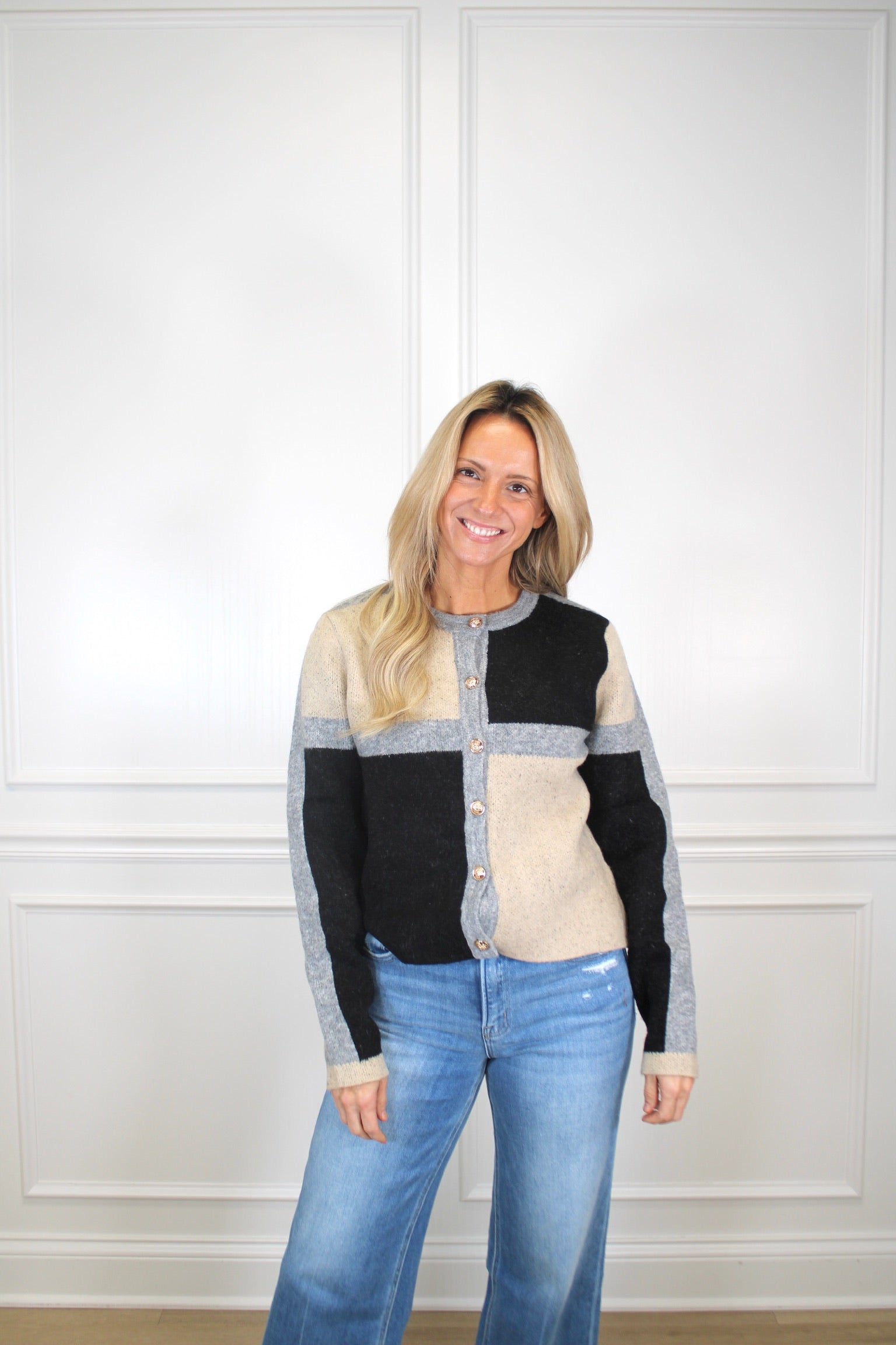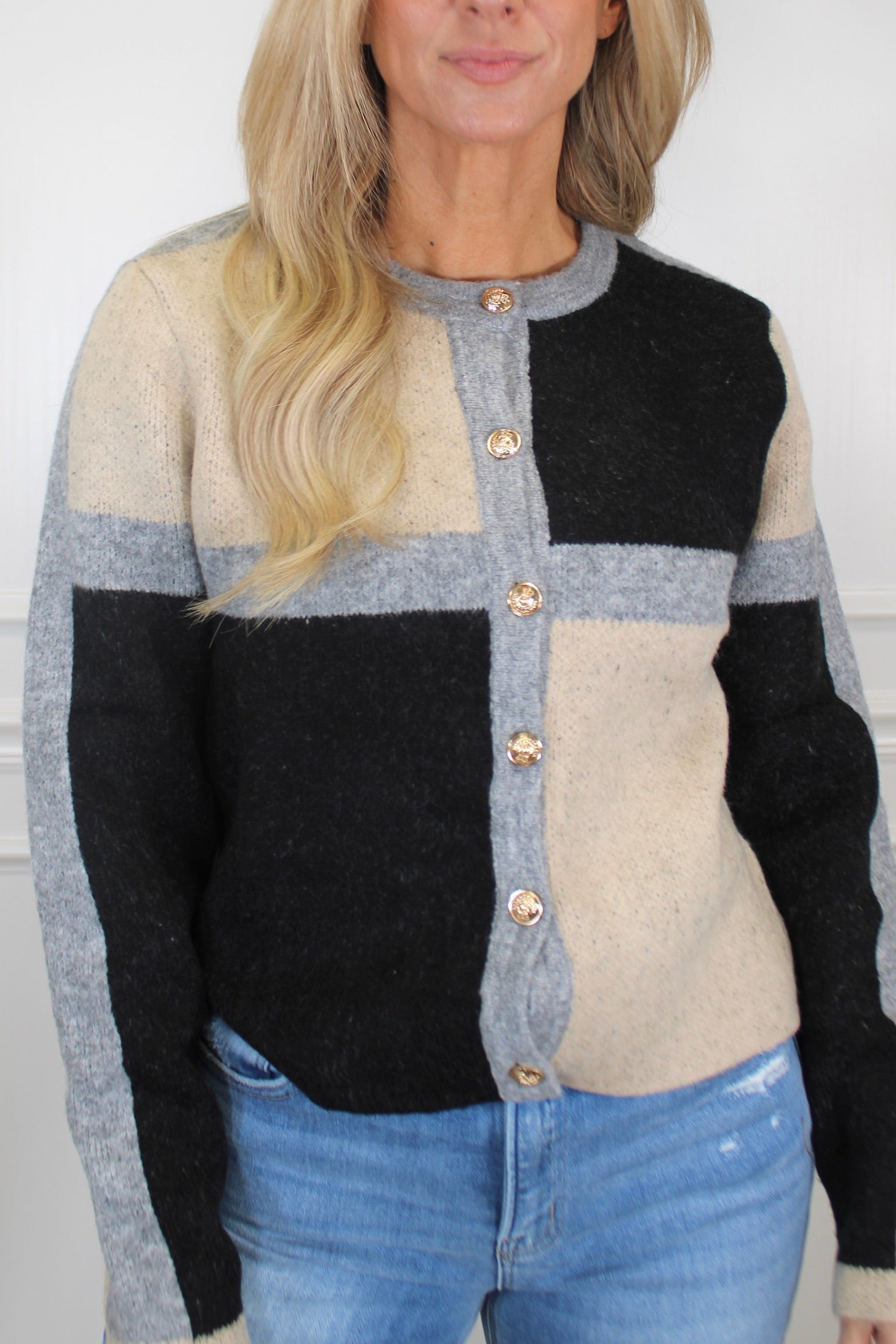 Wrap yourself in cozy sophistication with this Everyday Elevated Cardigan. Crafted from thick, heavyweight material that feels as luxurious as it looks, this long-sleeve beauty features a striking color block pattern that keeps things visually interesting. Elegant gold buttons cascade down the front, adding that perfect touch of polish to elevate your everyday style. Whether you're layering over a dress or pairing with your favorite jeans, this cardigan proves that comfort and chic don't have to choose sides.
