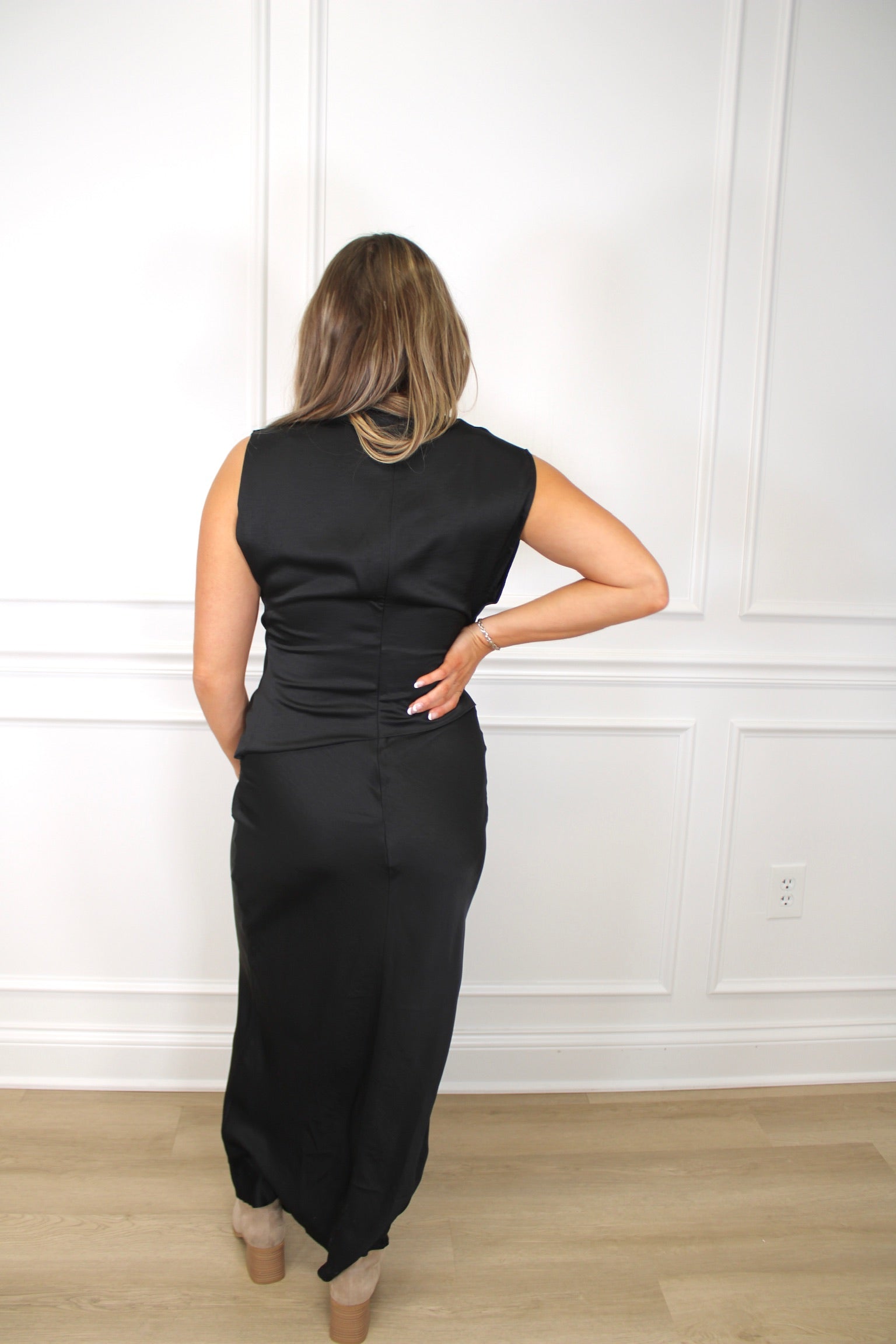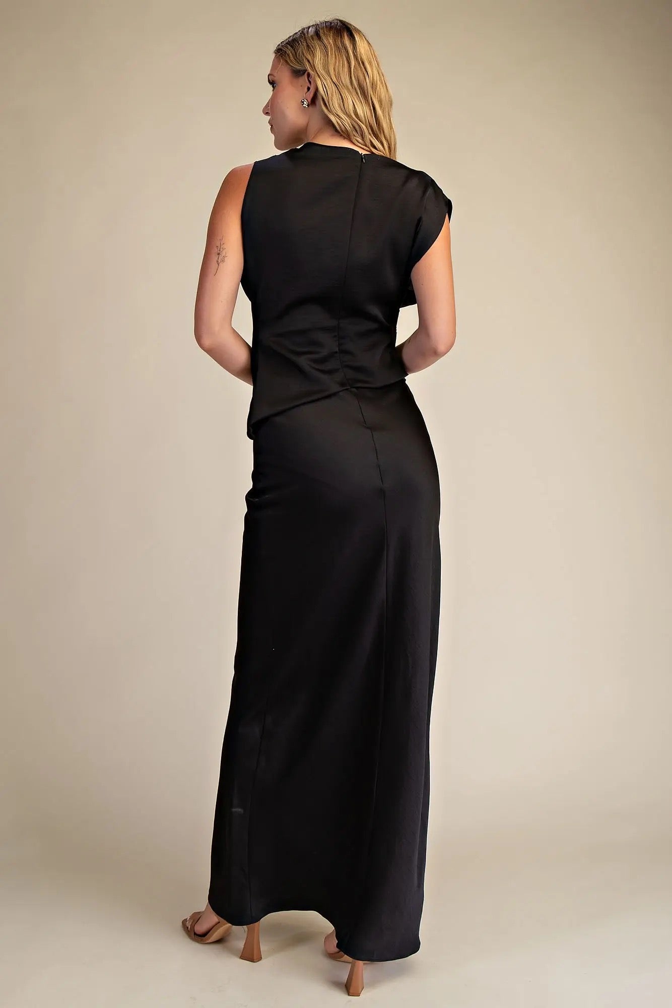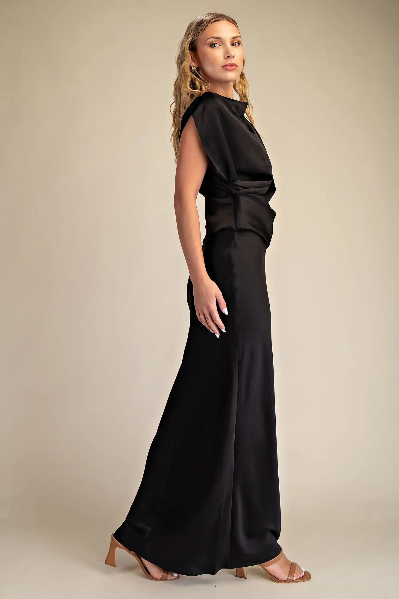 Slip into elegance with this stunning mock neck column dress that glides all the way to your ankles. The silky satin fabric drapes beautifully, creating a sleek silhouette that's perfect for everything from cocktail parties to special dinners. The mock neck adds a touch of sophistication while keeping things modern and chic. Whether you're dressing up for date night or turning heads at an event, this timeless piece proves that sometimes the simplest styles make the biggest impact. Pure satin sophistication, ready to steal the show.