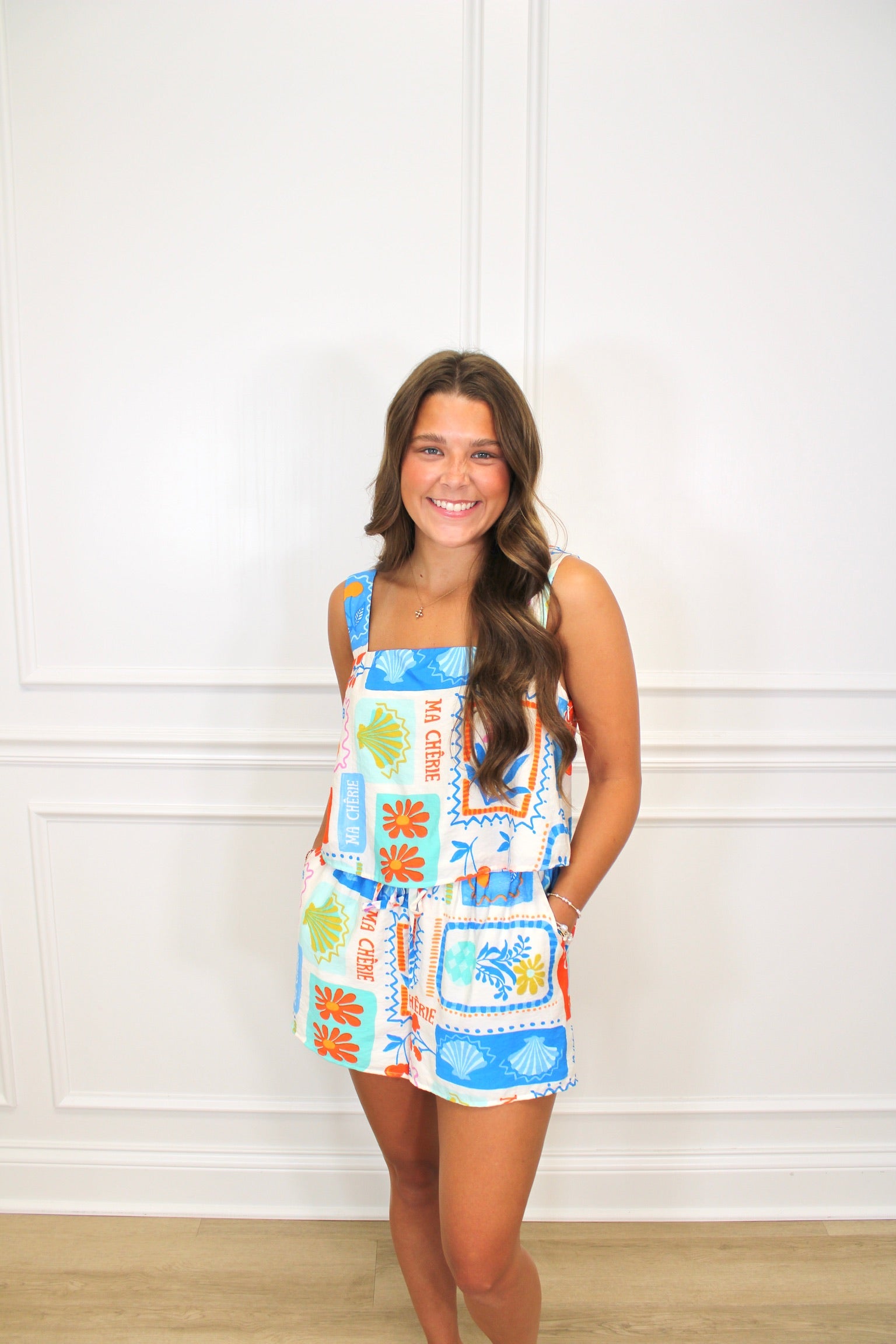 Get ready for sunny days with the Seaside Set! This playful sleeveless tank top and shorts combo features a vibrant tropical print bursting with multi-color fun. Perfect for beach trips or casual outings, it keeps you cool and stylish while embracing the carefree spirit of summer.