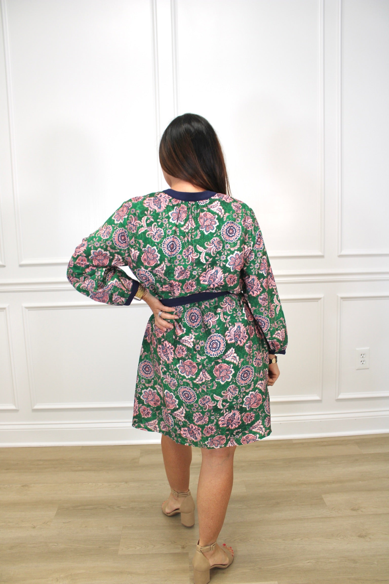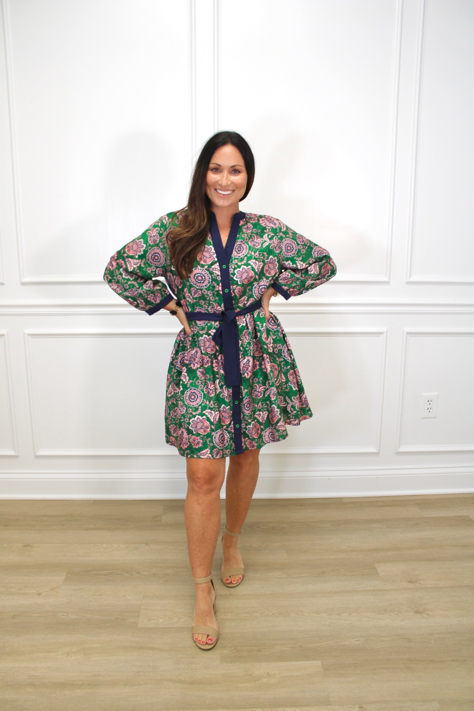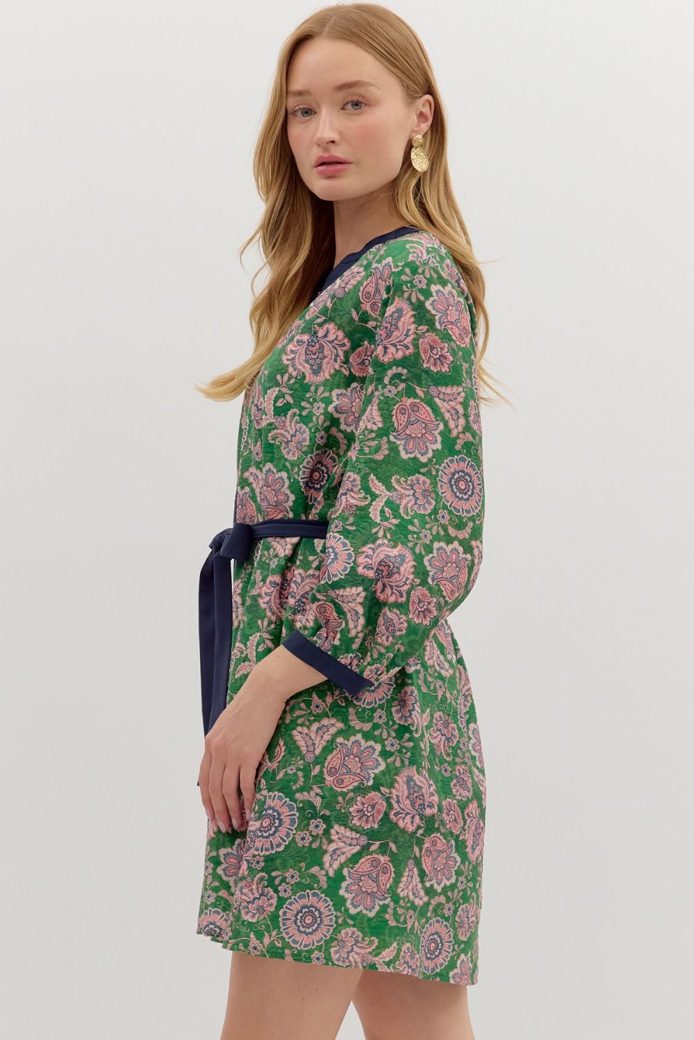 This playful paisley mini dress brings charm with its ¾ sleeves and a contrast-accented round V-neck band collar. The button-front closure and removable belt let you customize your look, while the lightweight woven fabric keeps you comfortable all day. Fully lined and non-sheer, it’s perfect for twirling through any occasion with ease and style.