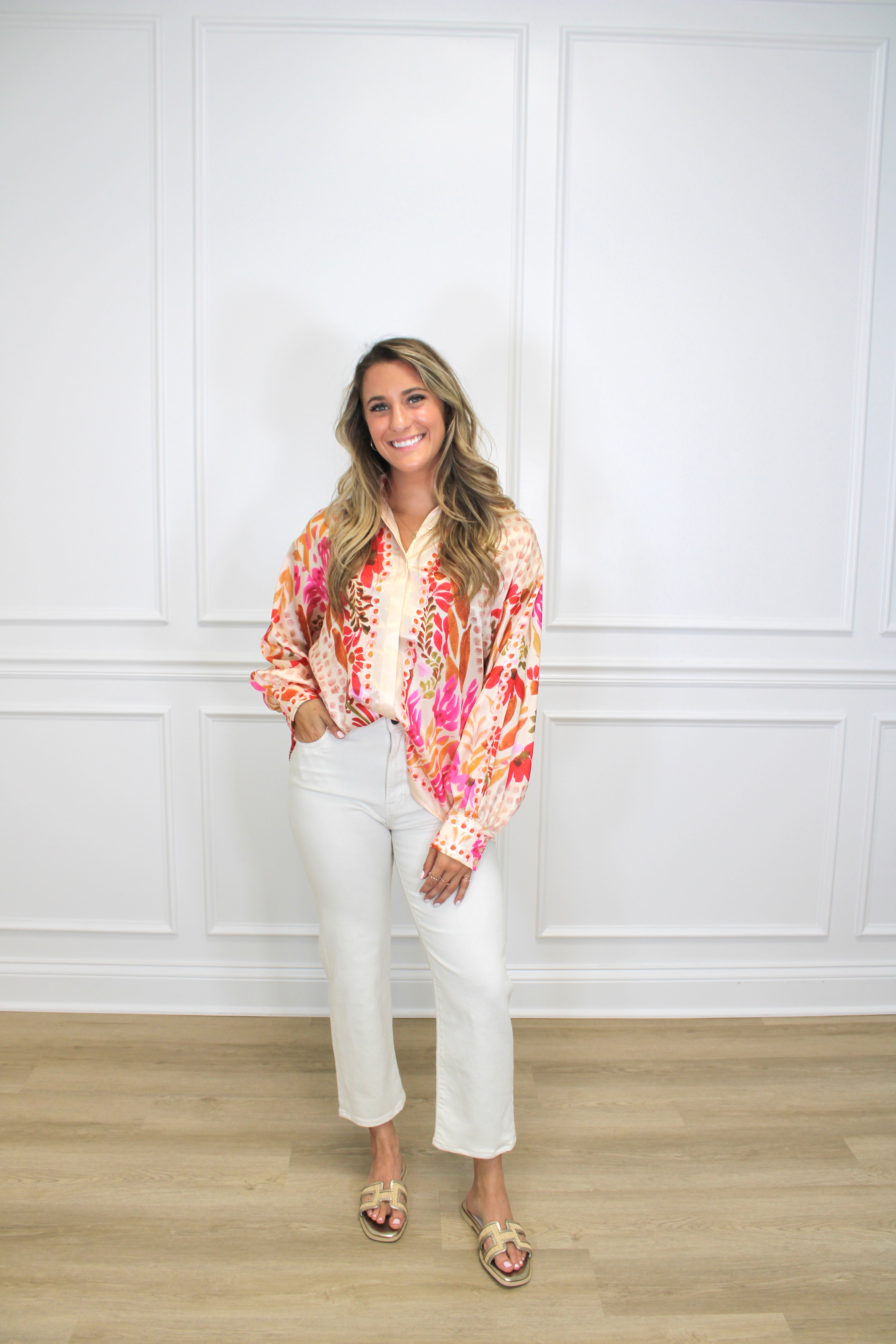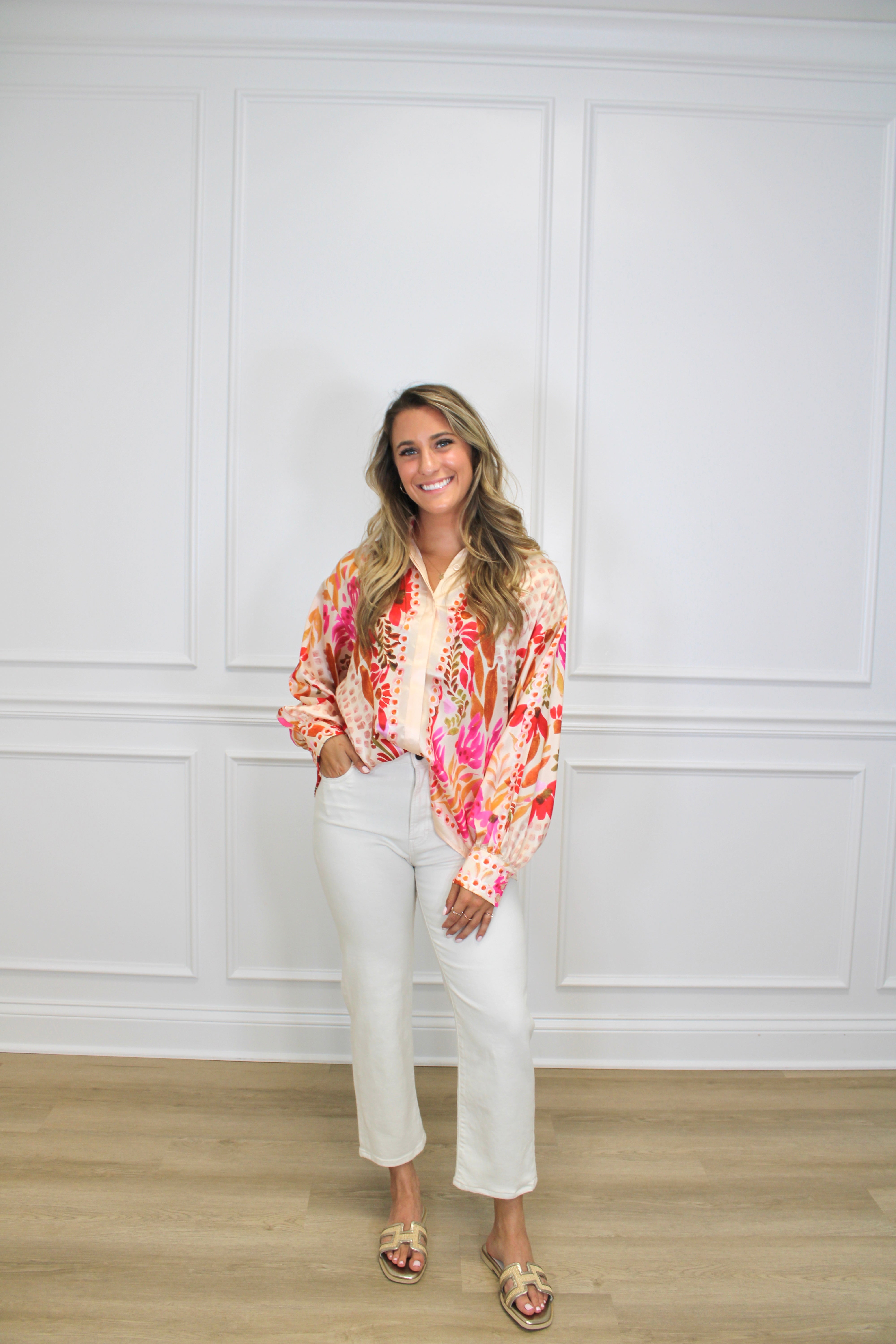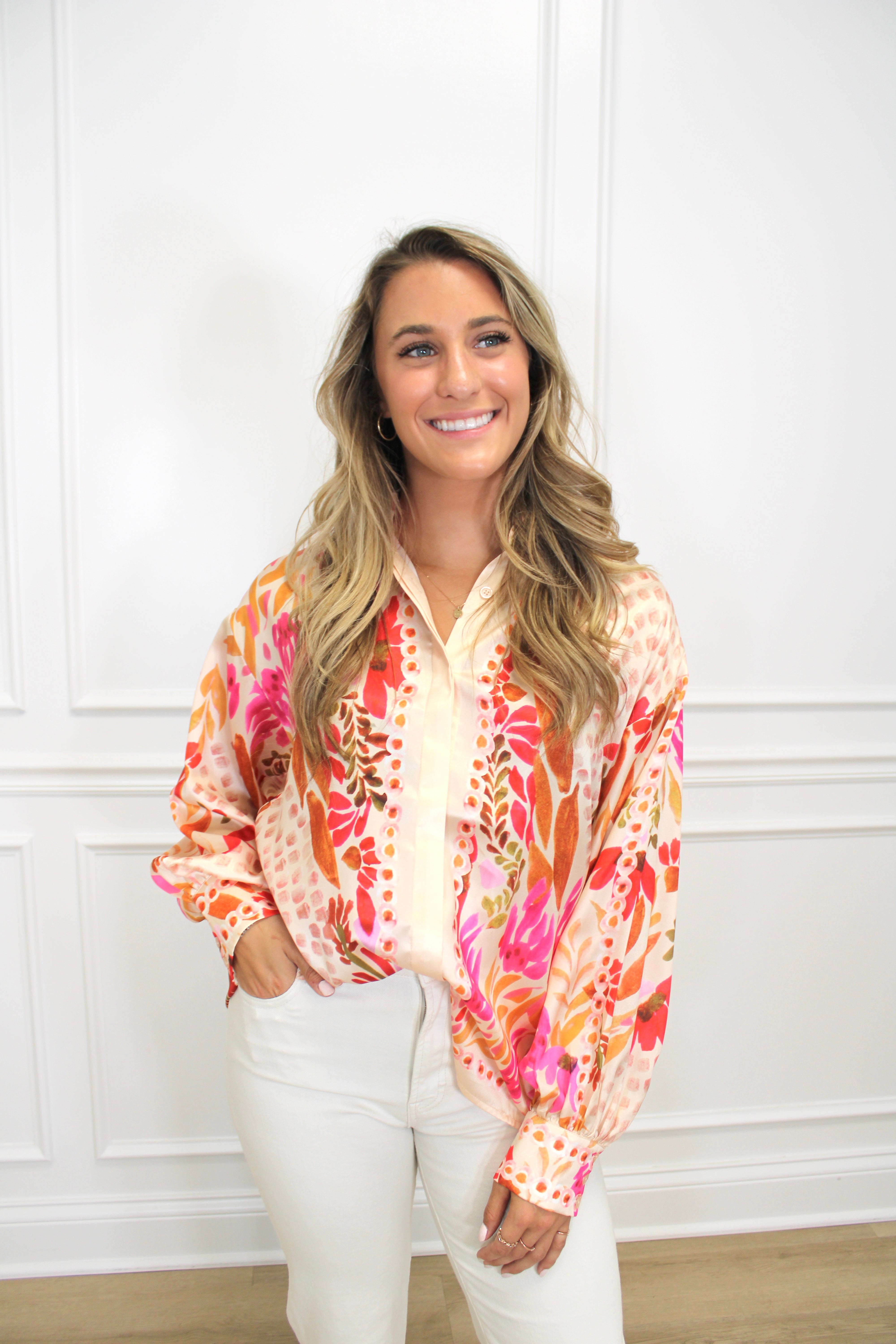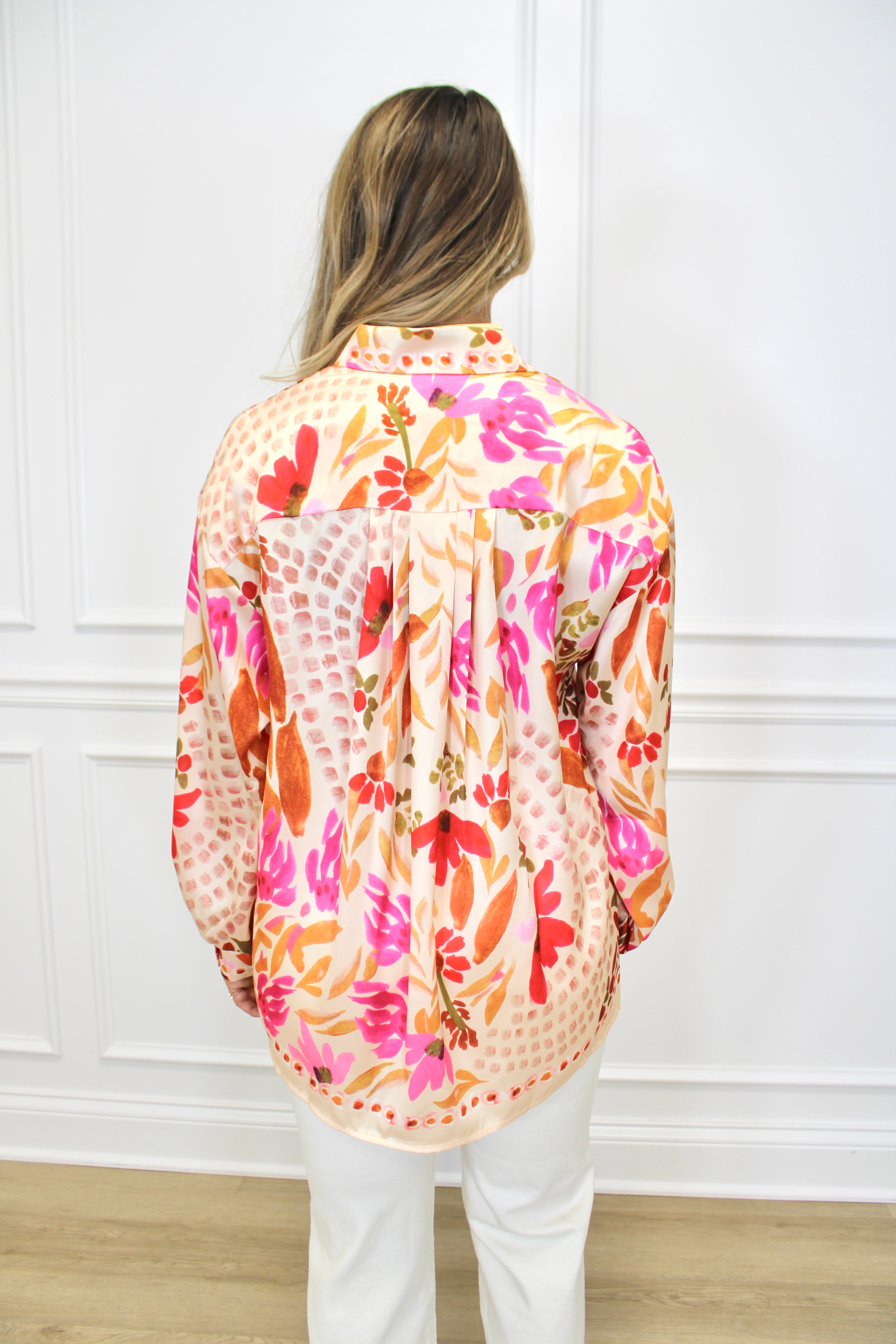 Step into a garden of style with the Fresh off the Print Blouse. This oversized silk shirt blooms with vibrant floral patterns, bringing a playful pop to your wardrobe. Its silky smooth fabric feels like a gentle breeze, perfect for effortless days and lively nights. Embrace comfort and charm in one fabulous piece!