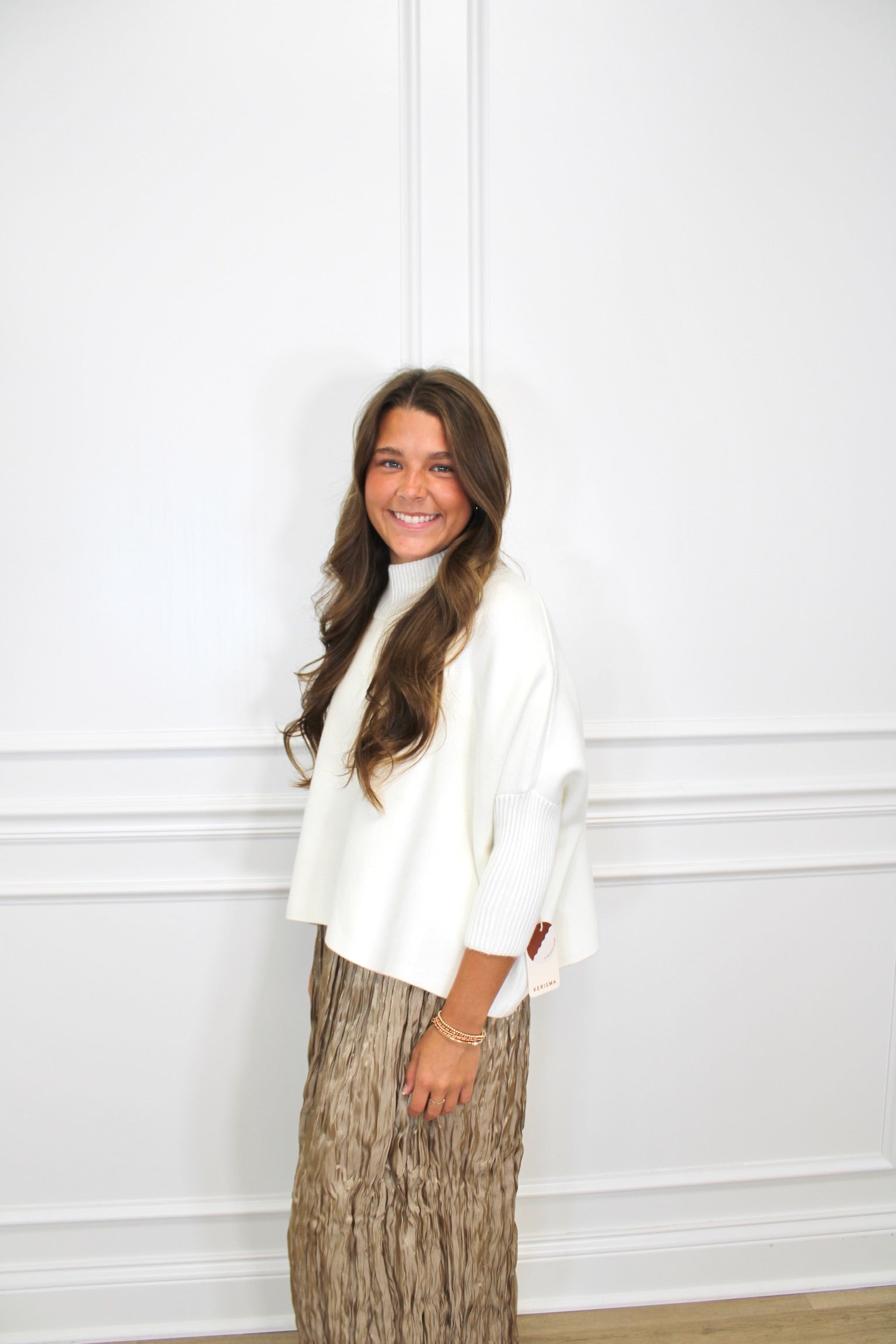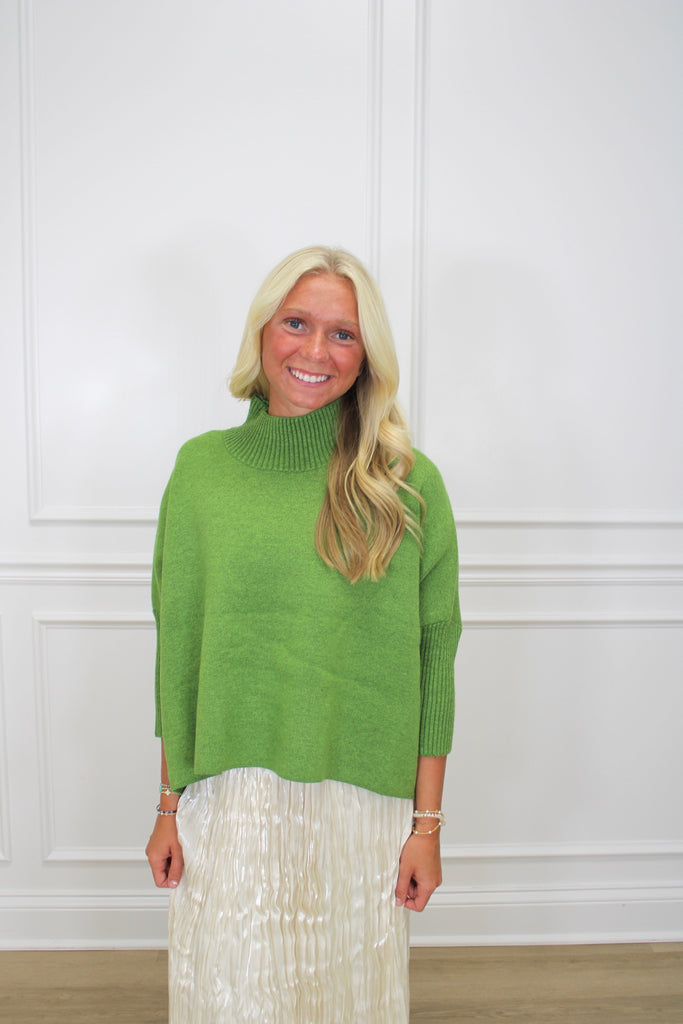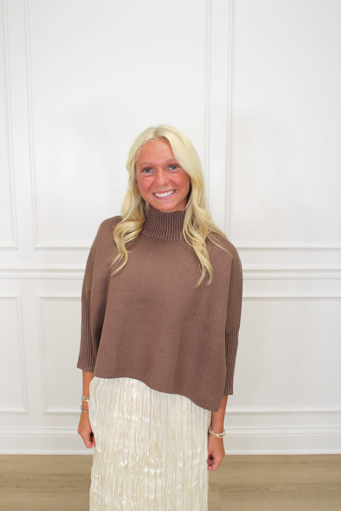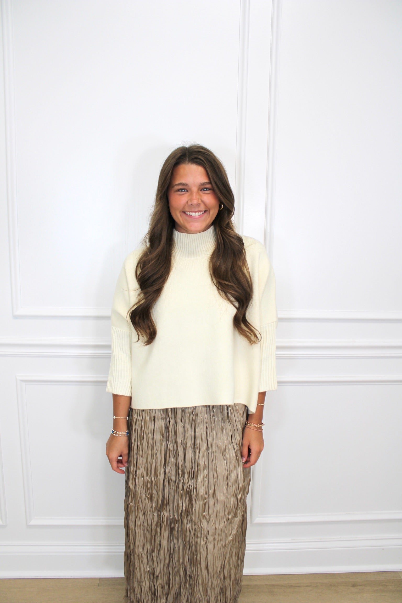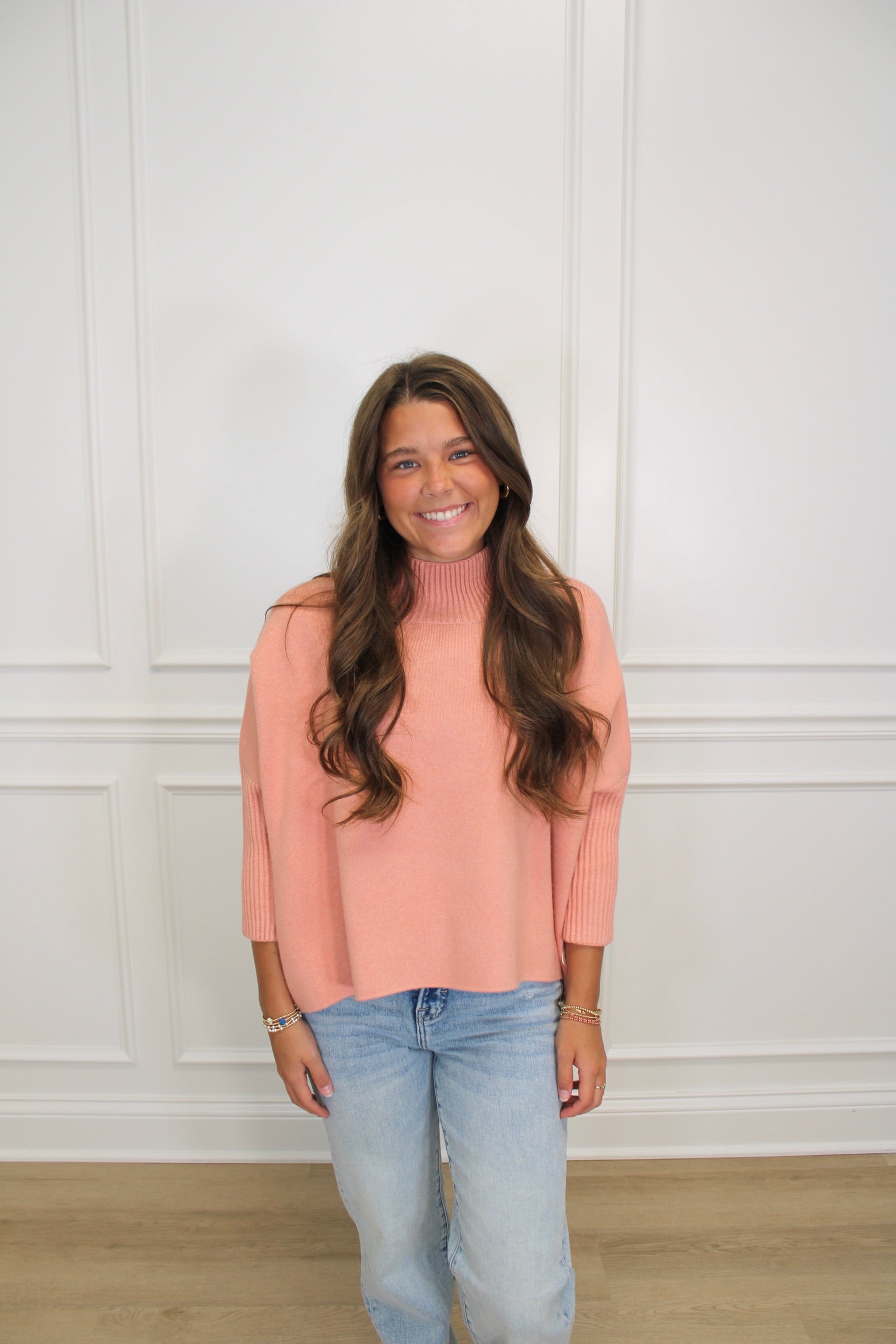 Oversized boxy sweater with fitted mock neck & 3/4 sleeves