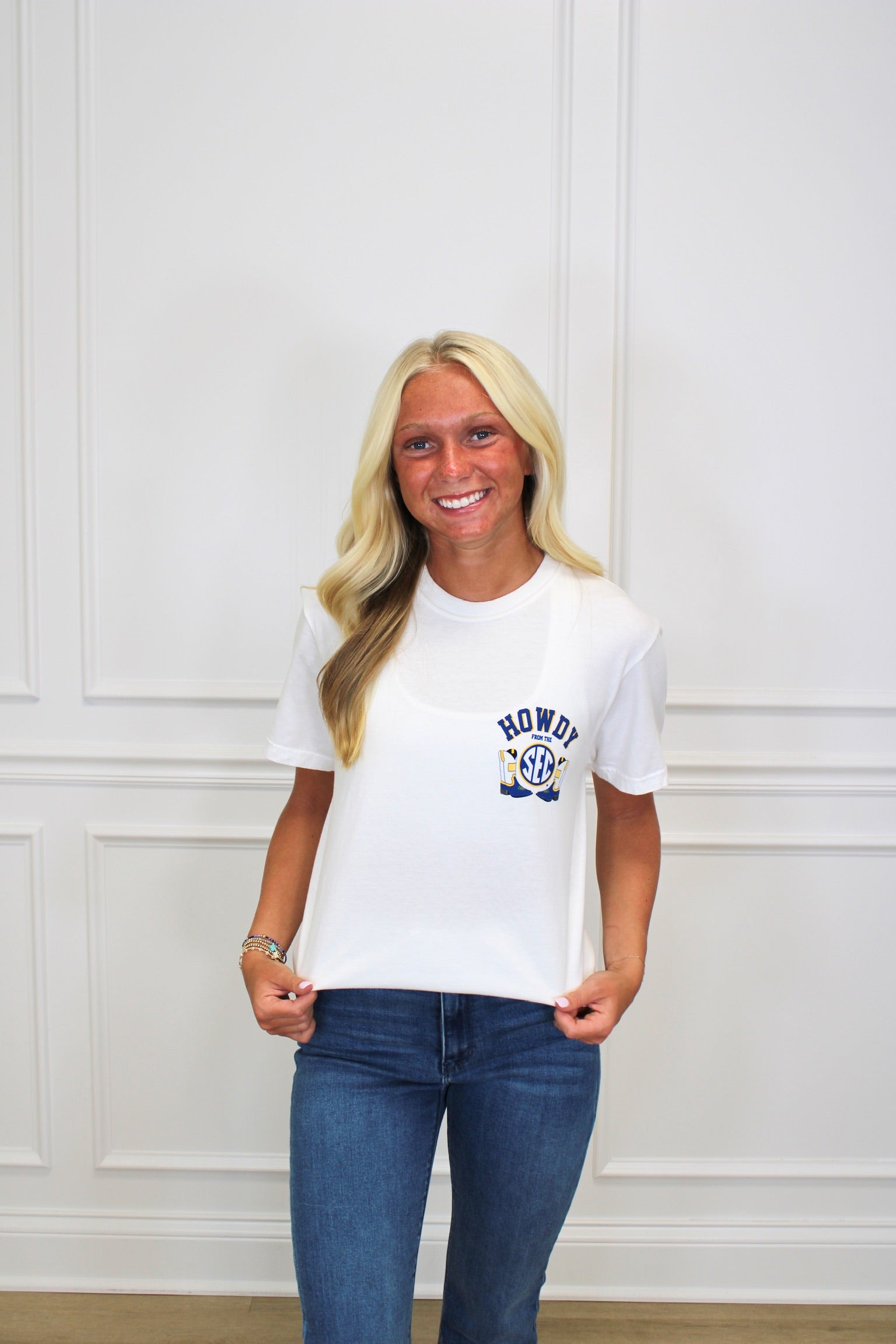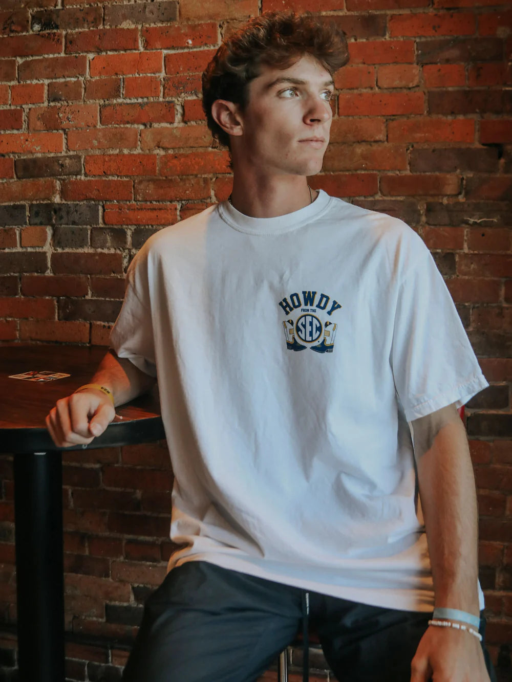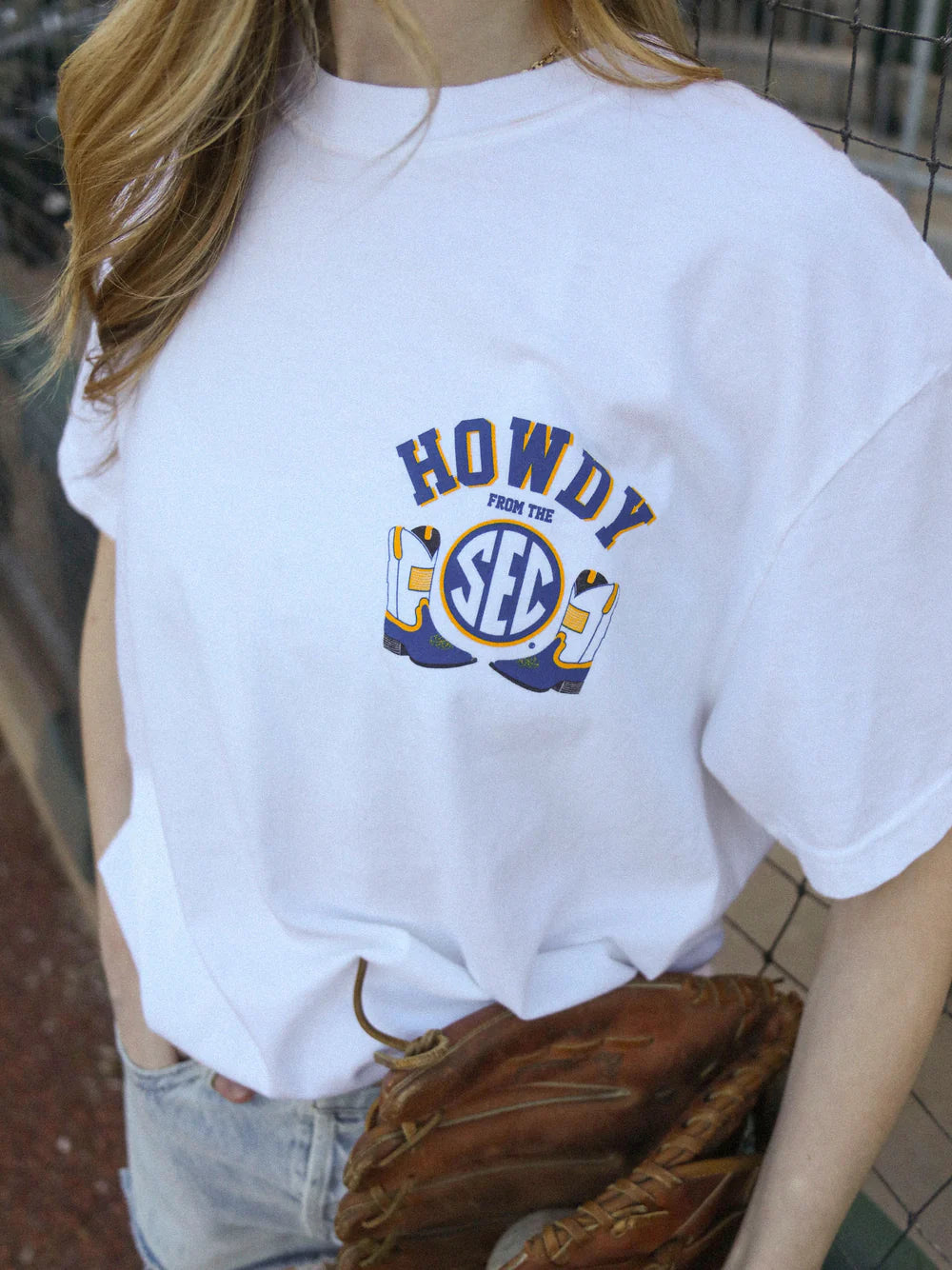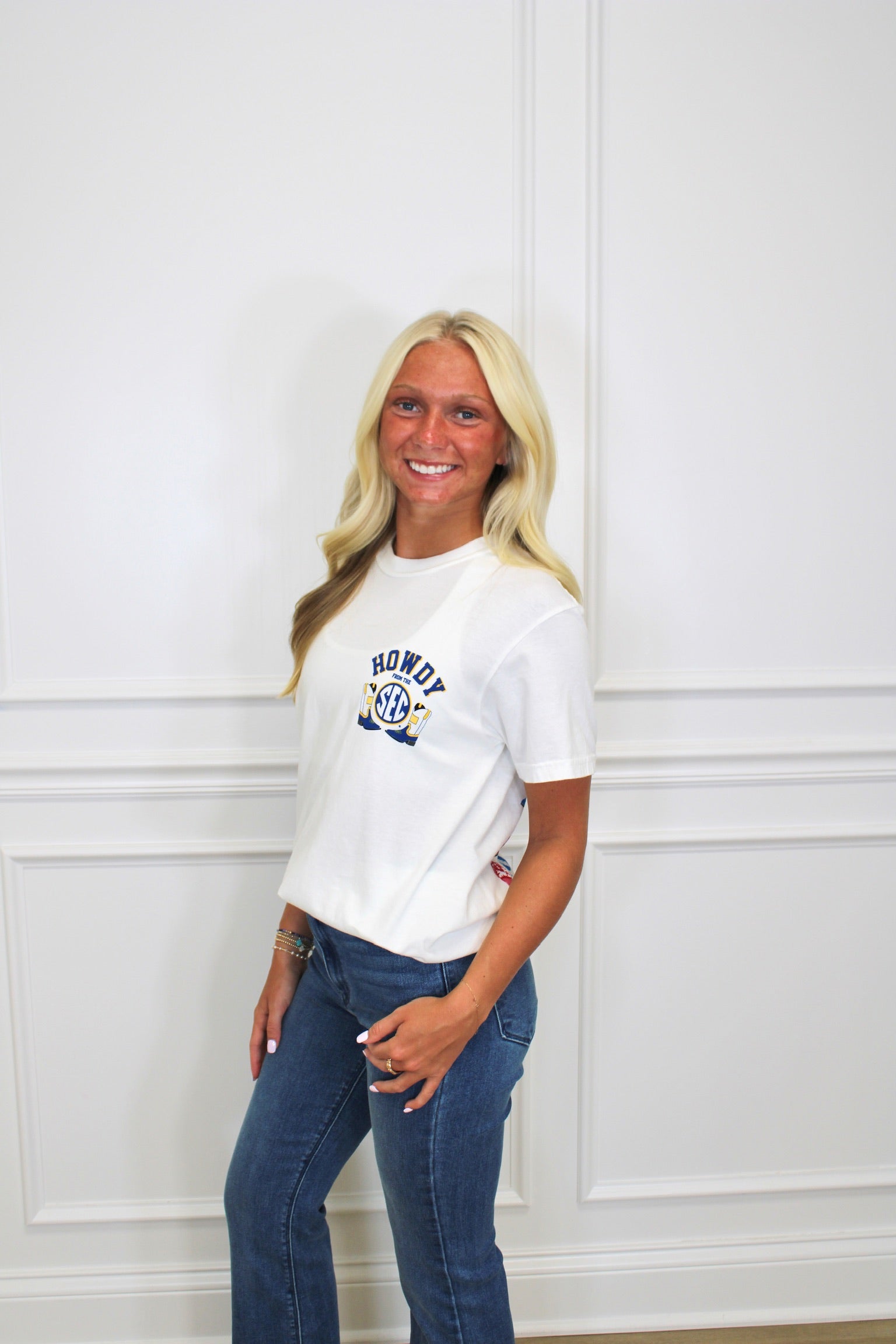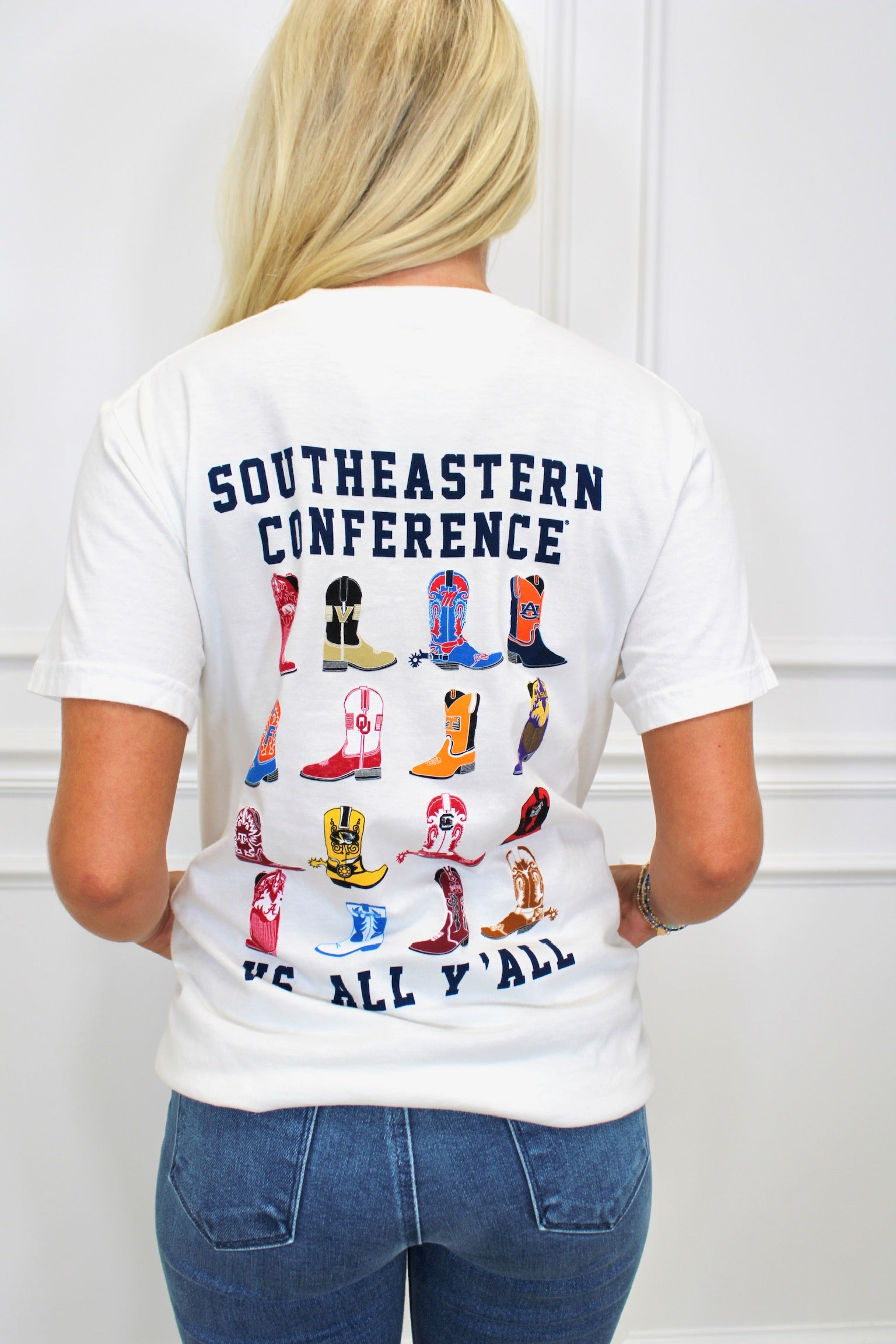 bestseller alert!! say "howdy" to your new favorite t-shirt! this white blank reps different cowboy boots for each school. cowboy meets SEC and we are here for it!