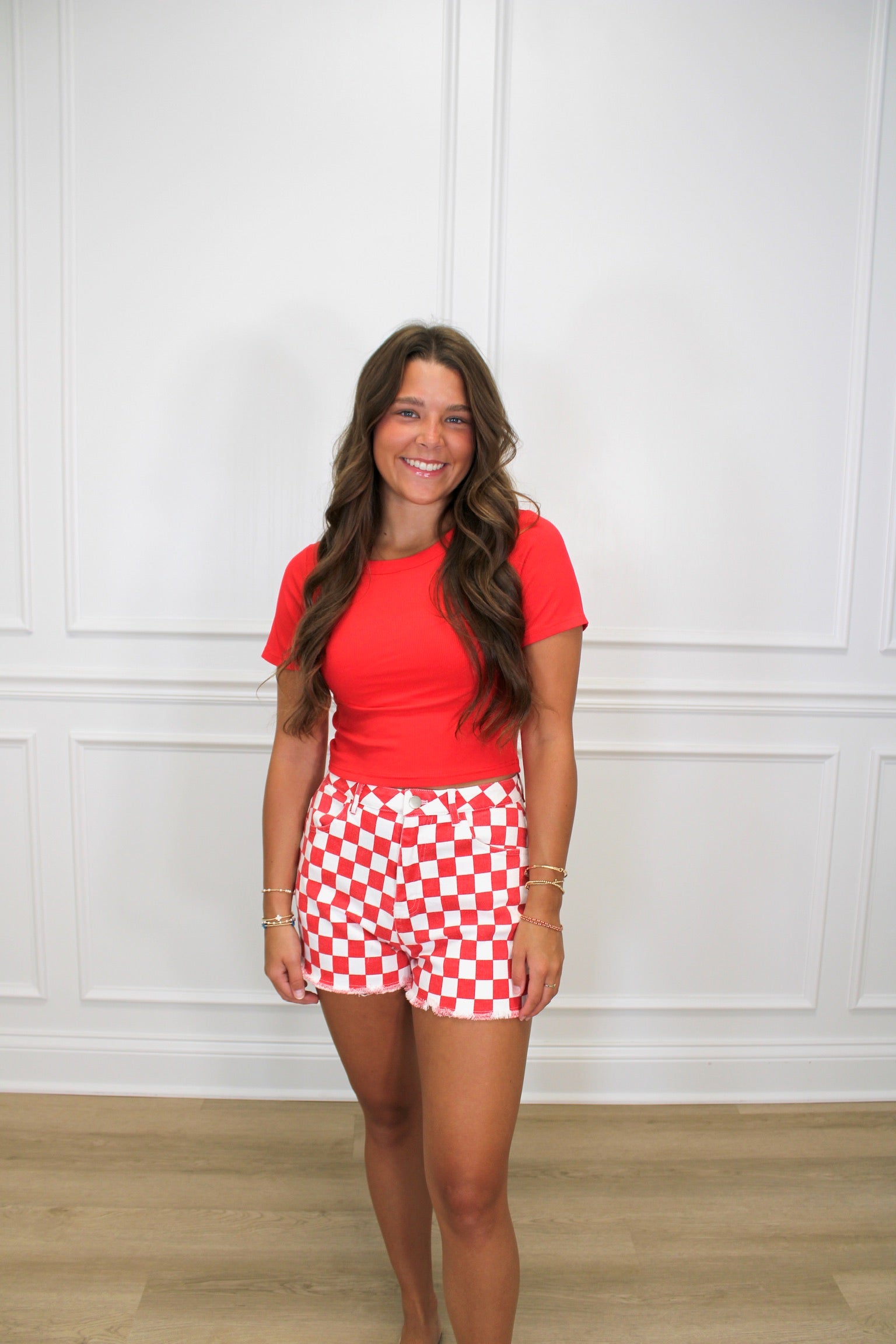 Show off your style with these playful Number 1 Fan Shorts! Made from checkered cotton knit fabric with a soft bio-stoning enzyme wash, they offer comfort and a cool vintage vibe. The high-waisted fit, button and zipper fly, and belt loops ensure a perfect fit, while pockets add practicality. Finished with a trendy frayed hem, these shorts are ready to be your new go-to for sunny days and fun adventures.