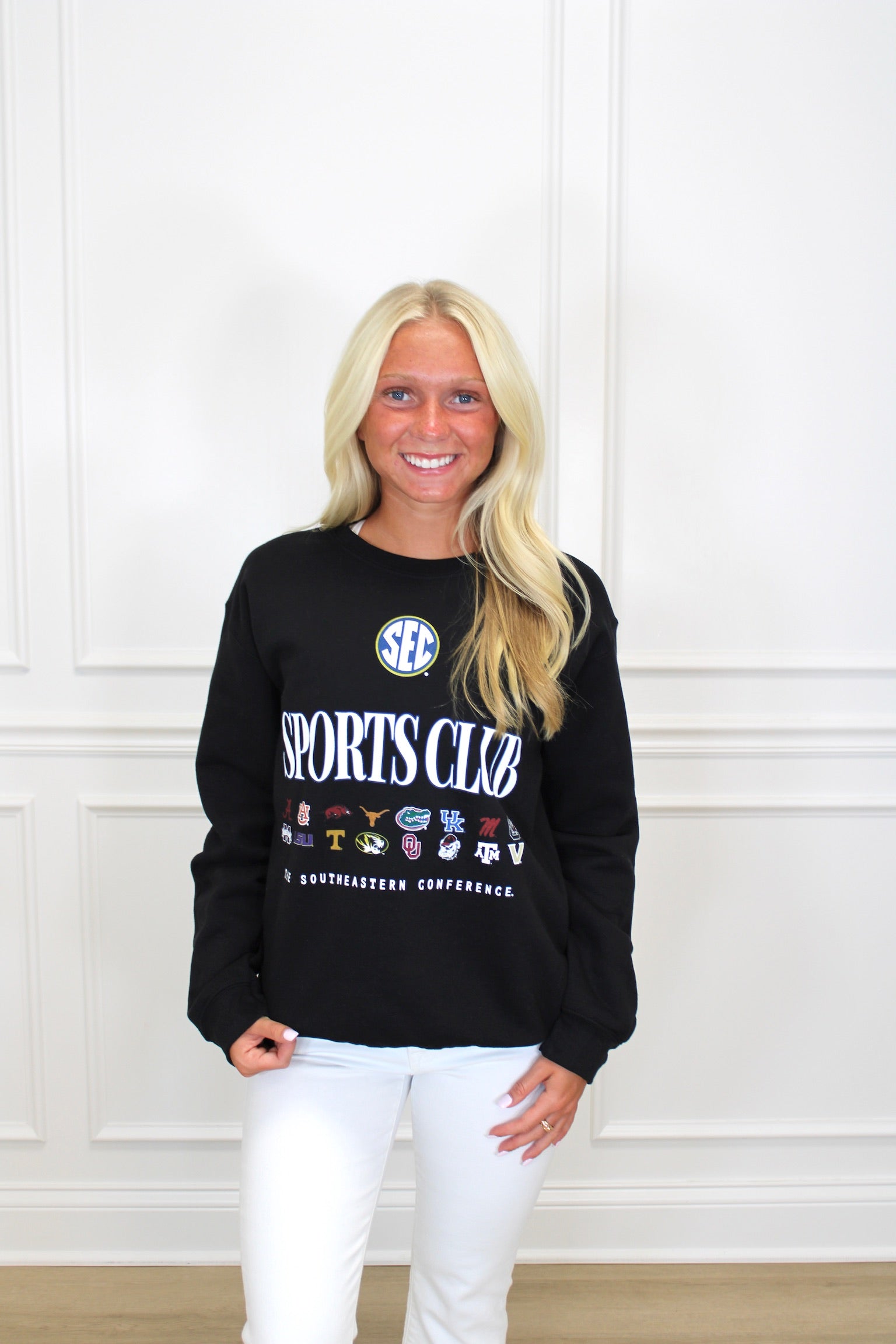 For all members of the SEC Sports Club - whatever school, whatever sport! This unisex black sweatshirt features the SEC logo and the logos of all the SEC teams, even the newbies!