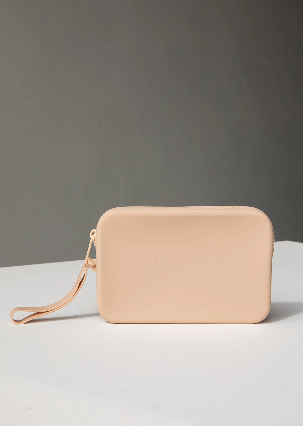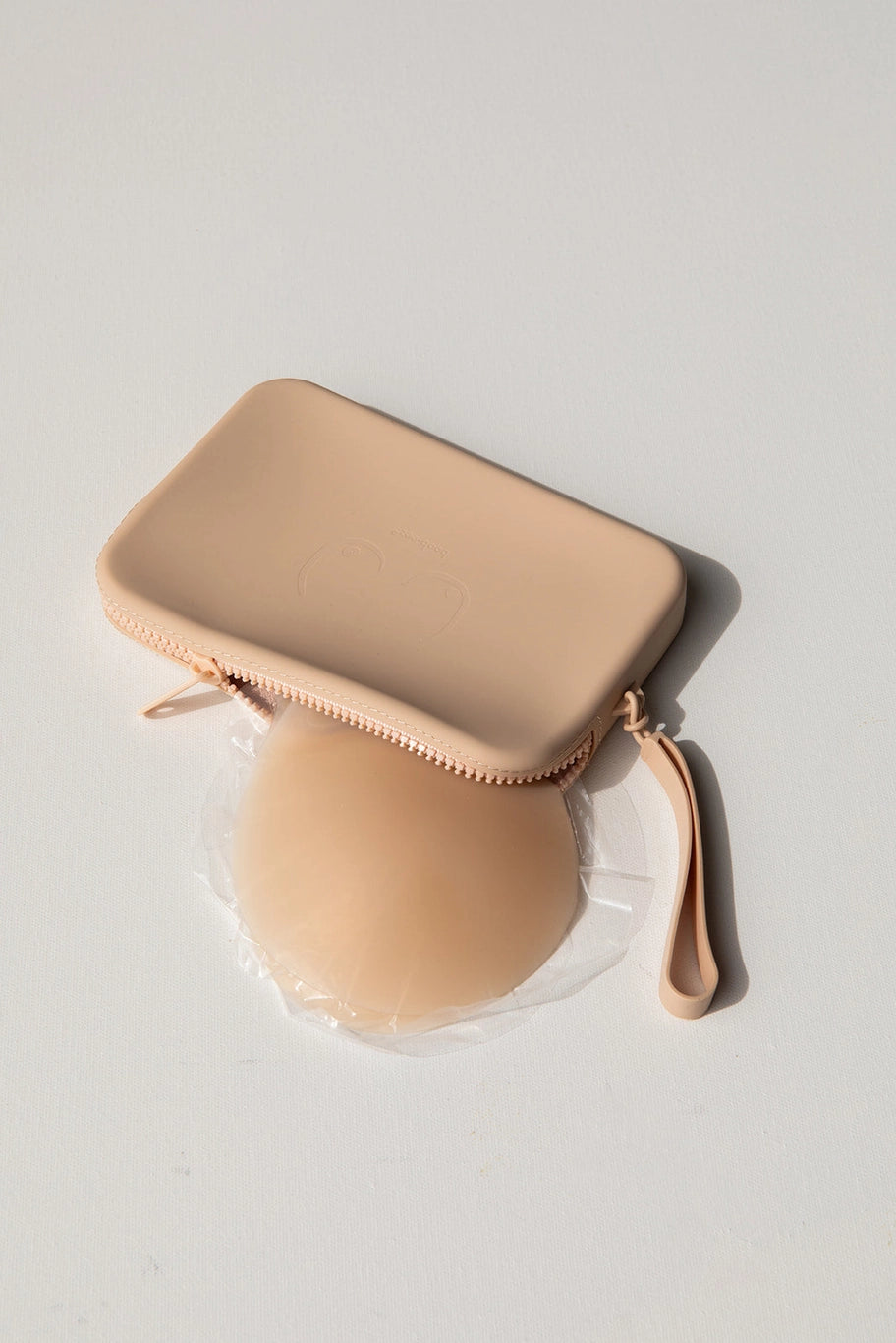 x1 Silicone Travel Case * x1 Silicone Stick-On Bra by Boob-eez® Expand the lifetime of your Stick-on Bra with this revolutionary combo: 100% silicone stick-on bra by boob-eez® + a cute and durable travel case option made from kitchen-grade silicone! A safe and sustainable storage option for Boob-eez® pasties products. This case makes traveling with your sticky boobs a BREEZE. Throw this travel case in your suitcase, purse, or backpack, and take off on an adventure of a lifetime! These silicone travel cases come engraved with the Boob-eez® iconic logo, equipped with a removable wrist strap, and zip closed with eez.