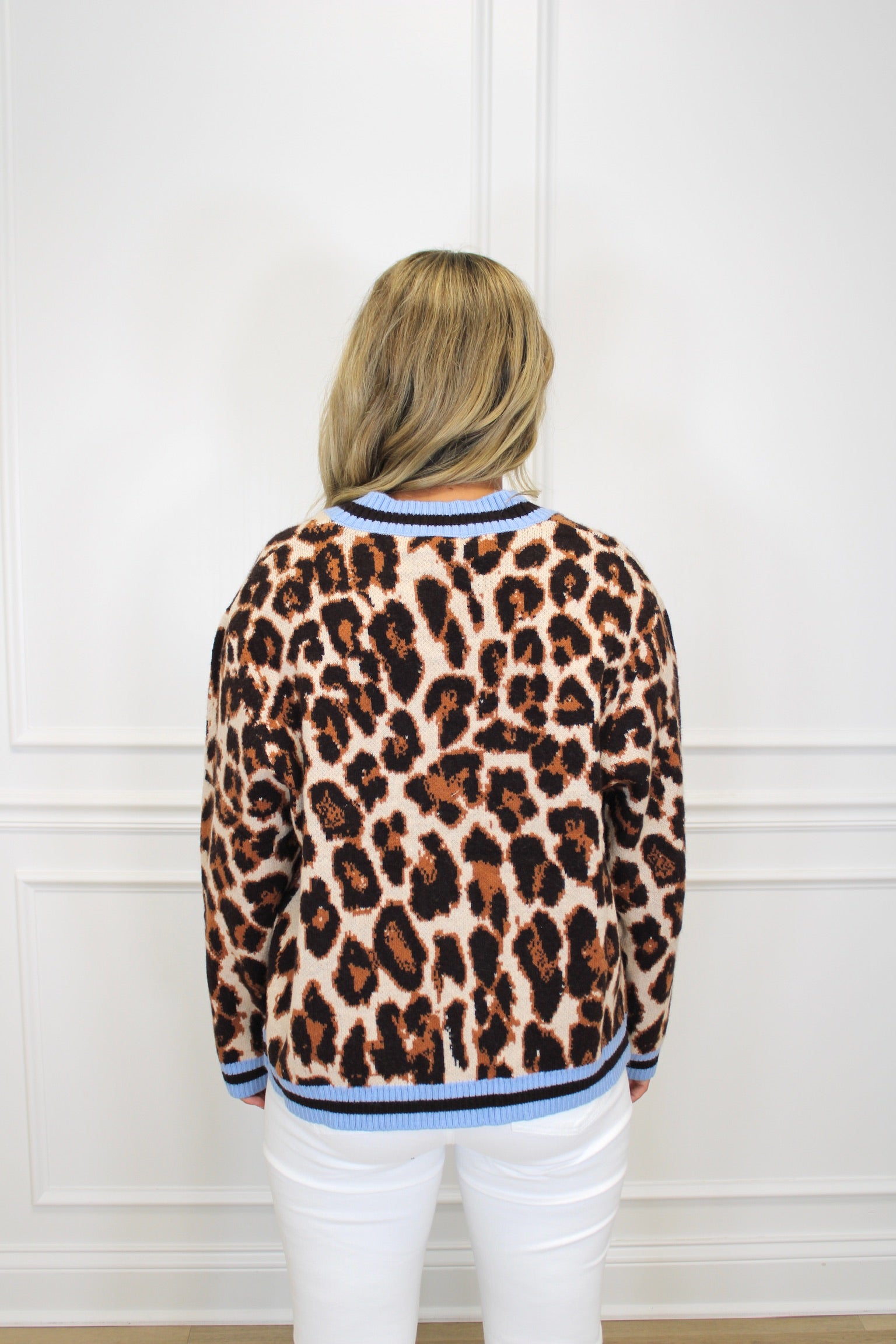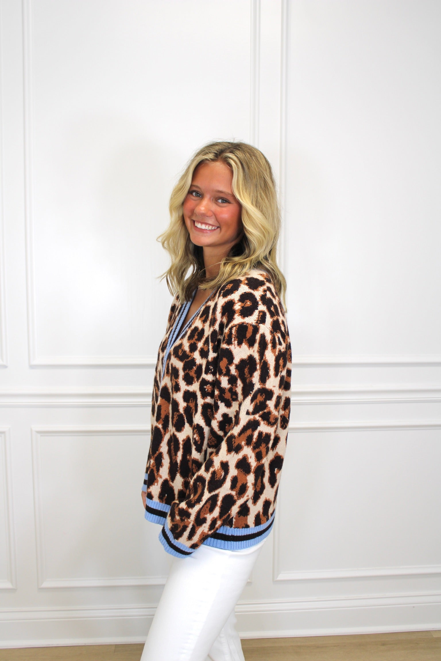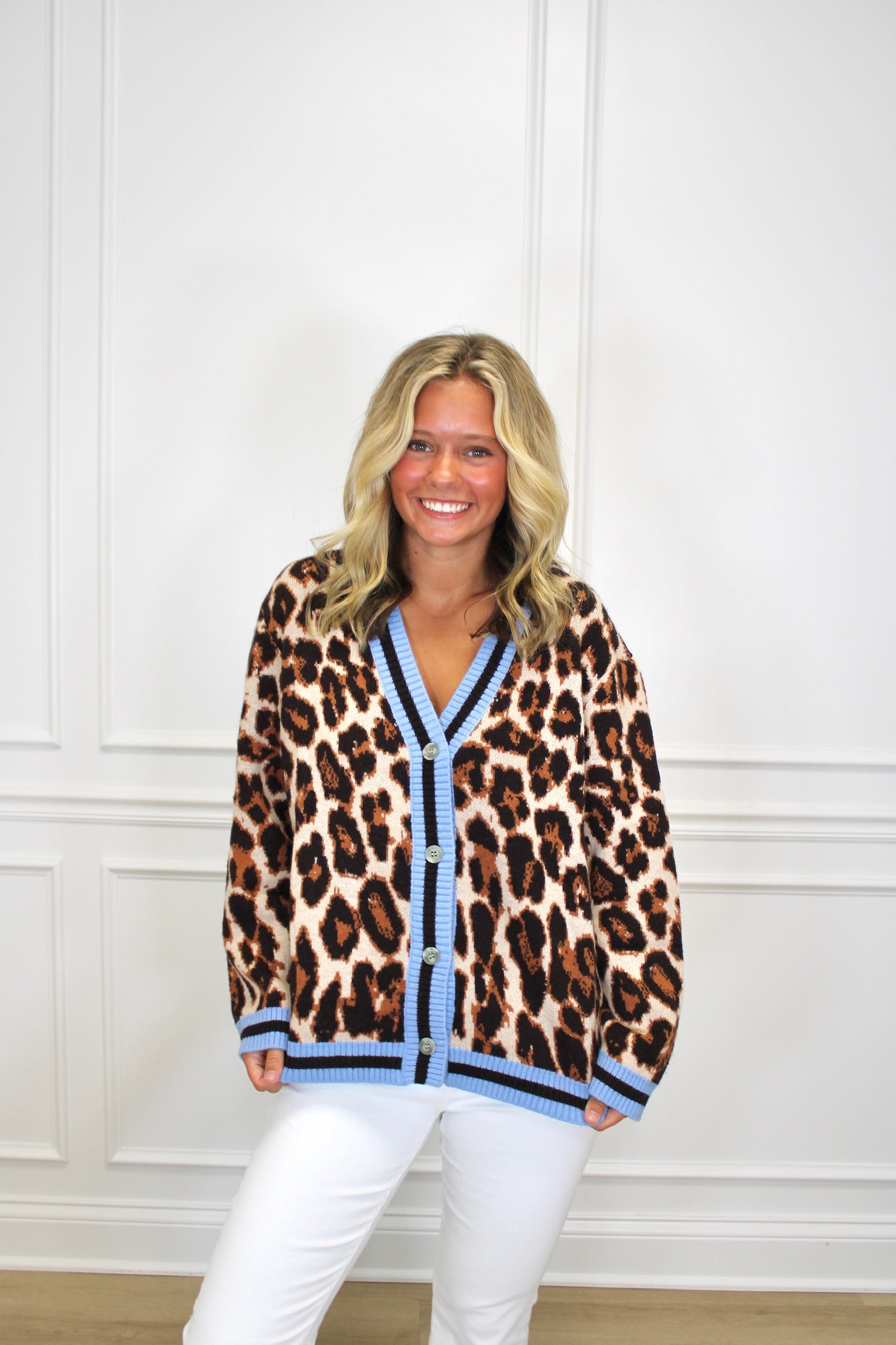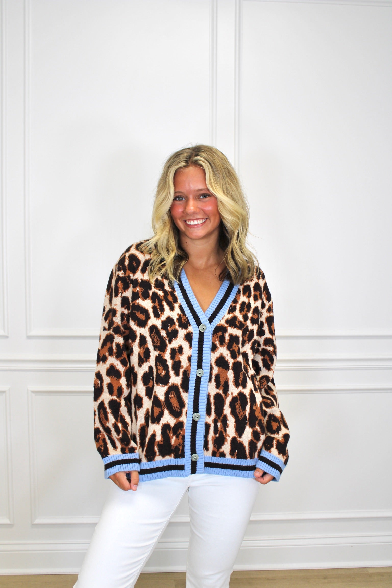 Add a splash of wild charm to your wardrobe with the Annie Button Up Cardigan. Featuring a playful leopard print and light blue accents along the boat neck, this cardigan effortlessly blends boldness with a touch of softness. Perfect for layering, it brings fun and flair to any outfit while keeping you cozy and stylish.