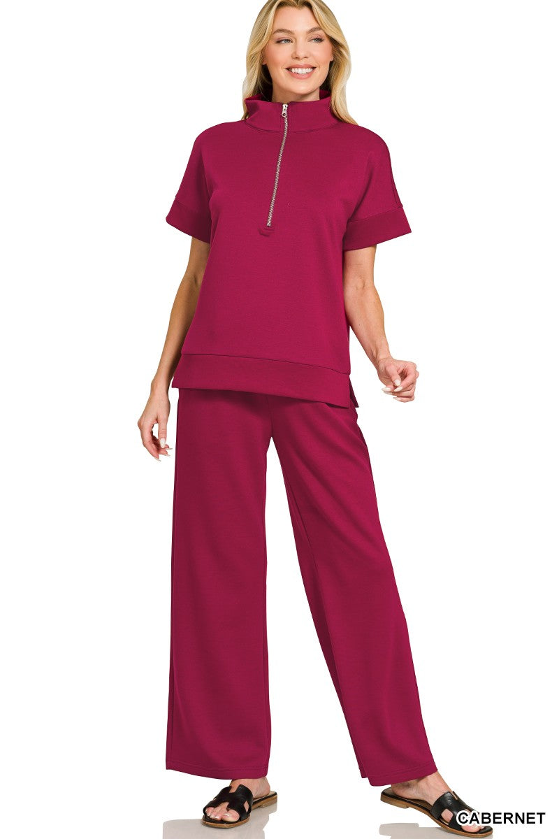Dive into comfort with this chic scuba set that's ready for anything! The high neck half zip top pairs perfectly with wide-leg pants featuring a stretchy waistband and handy side pockets—because style shouldn't sacrifice practicality. Whether you're lounging at home or stepping out, this cozy duo keeps you looking effortlessly put-together all day long.
