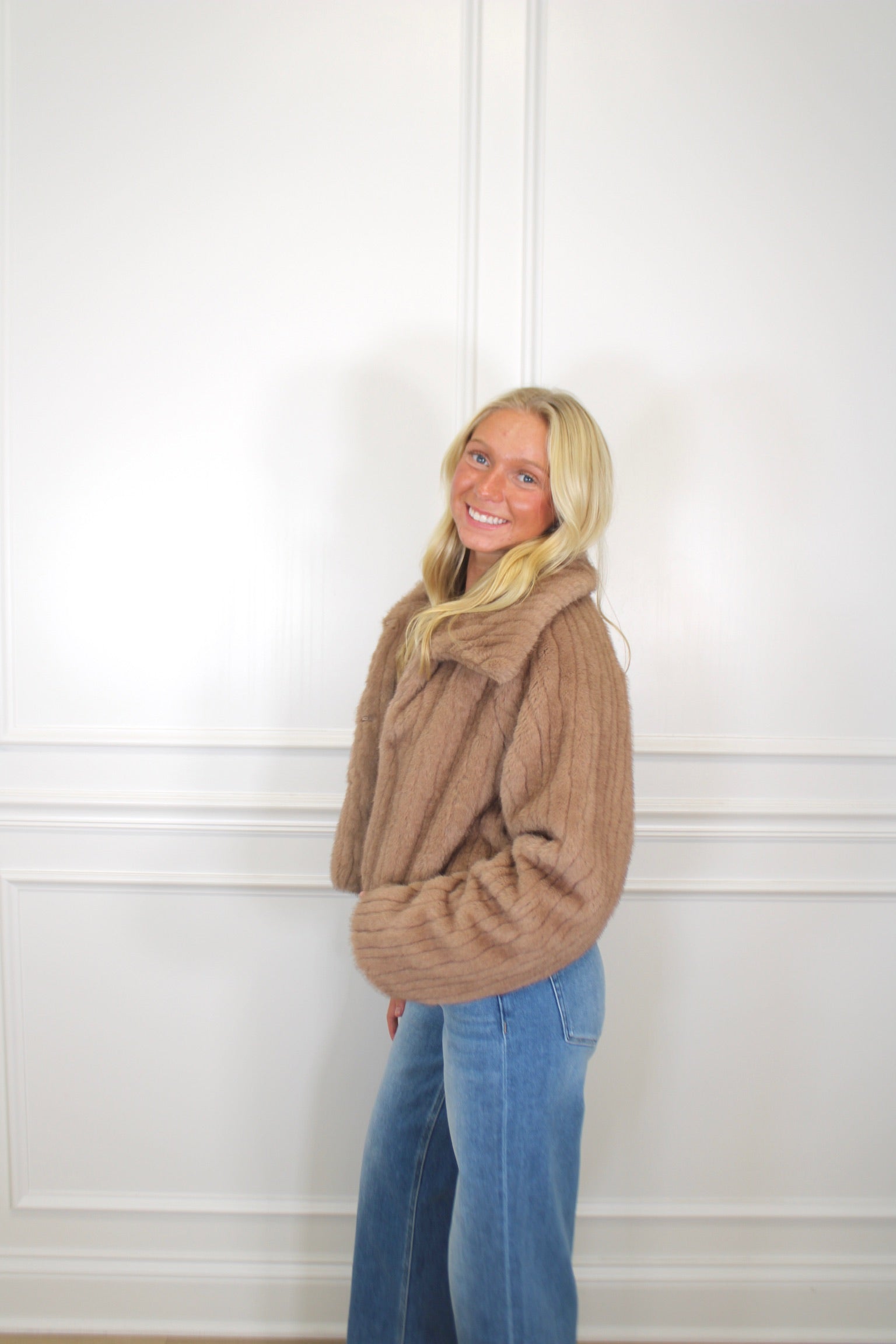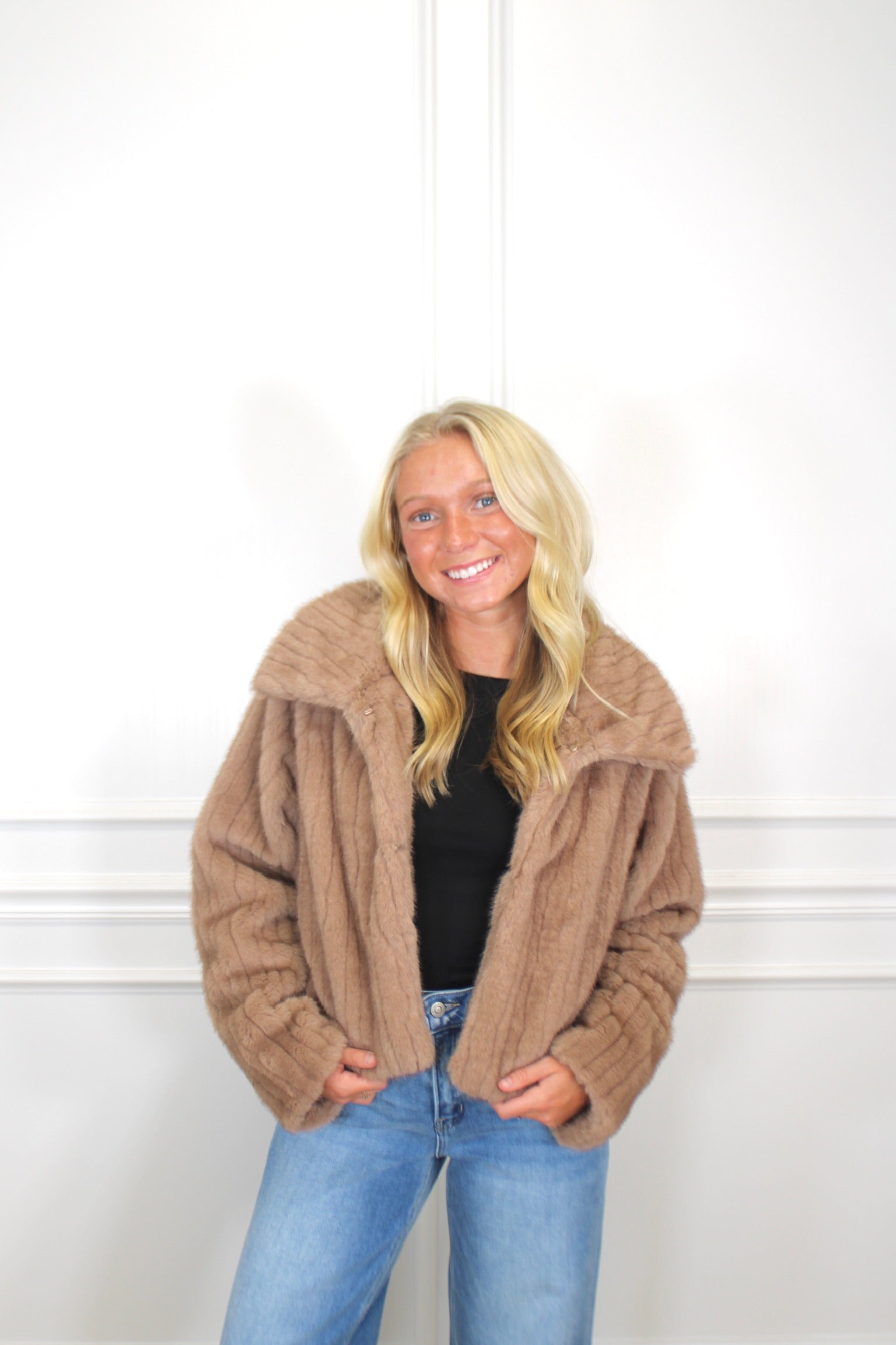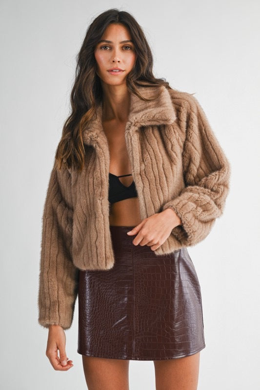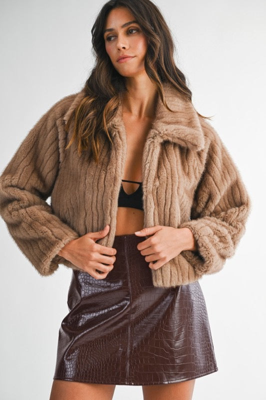 Wrap yourself in cozy elegance with this chic crop jacket featuring a luxurious faux fur collar that adds instant glamour to any outfit. The long sleeves provide warmth while the front hook and eye closure keeps things effortlessly stylish. Lined for comfort and durability, this piece is perfect for layering over dresses, tees, or anything in between. A playful twist on classic tailoring that'll have you feeling fabulous.