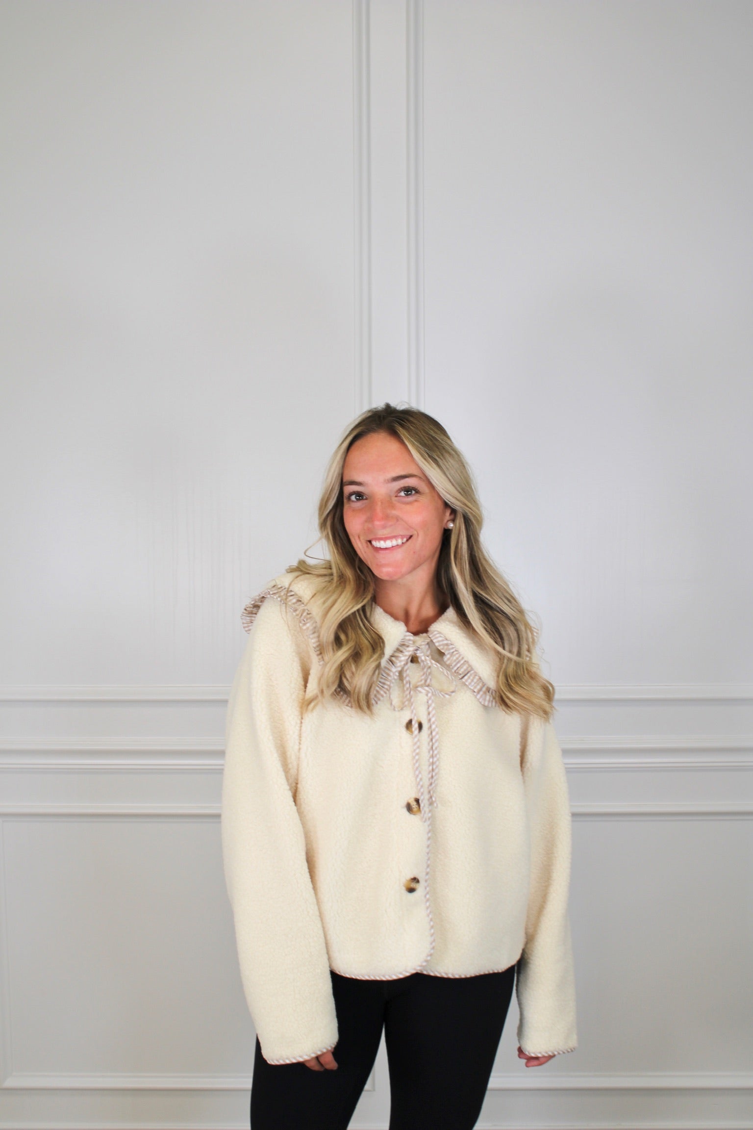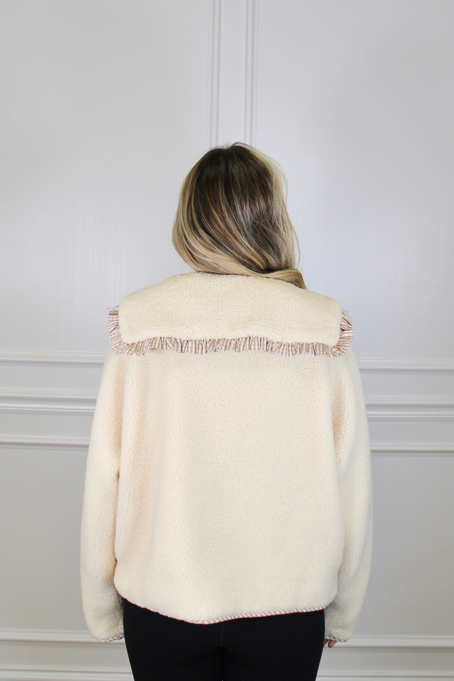 Cozy up in The Mae Jacket, featuring a trendy Peter Pan large collar with light tan stripe trimming for a fun twist. Made from thick sherpa material, it’s perfect for layering as a cardigan or wearing buttoned down for extra warmth. Stylish and snug, it’s your new go-to for chill days with a playful edge.