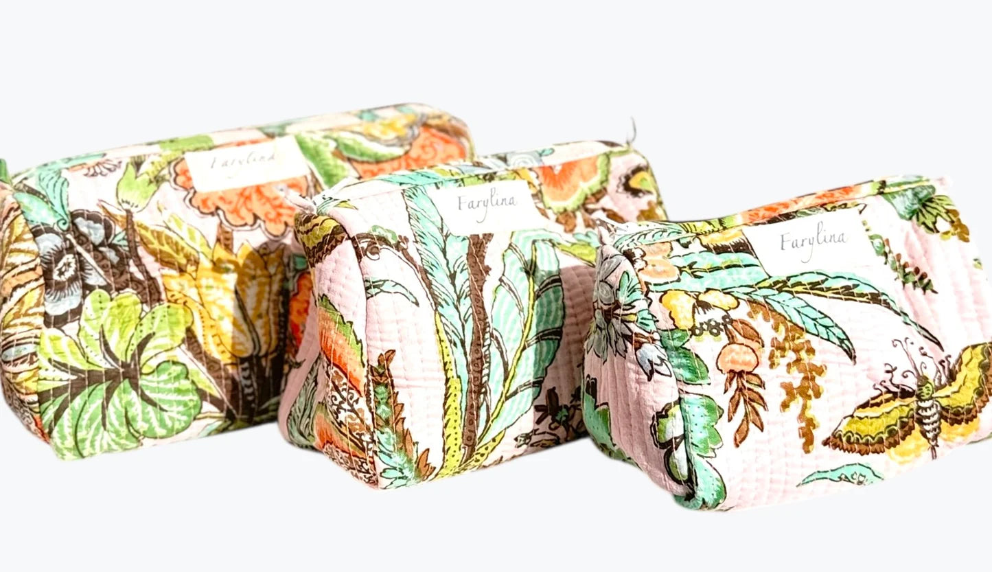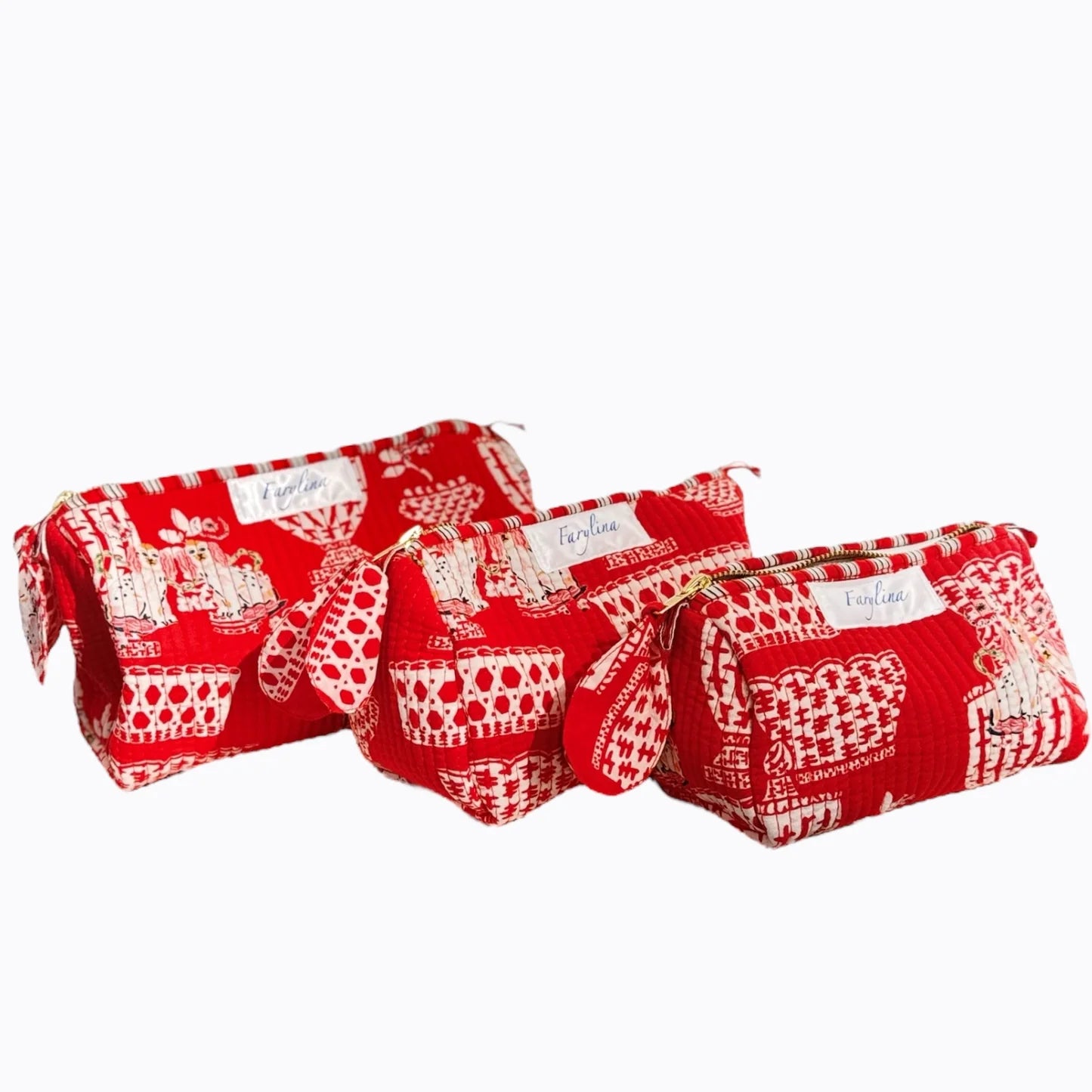 Introducing Quilted Toiletry Bags, the perfect travel companion for keeping your essentials organized. With a zip top closure and plastic lining, these hand-dyed bags come in three sizes (Large, Medium, Small) for all your packing needs. Please note: Each bag's unique color and design may vary.