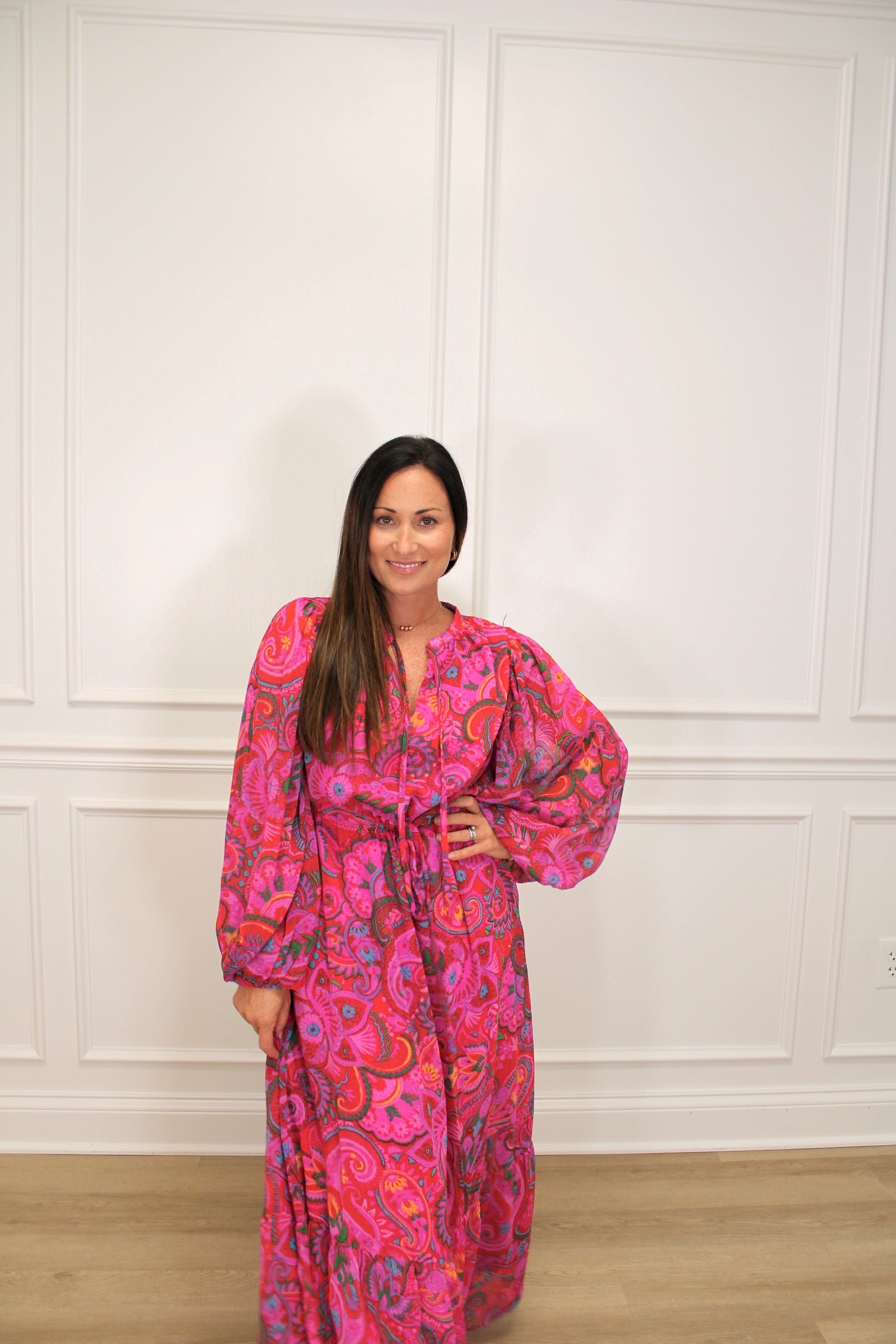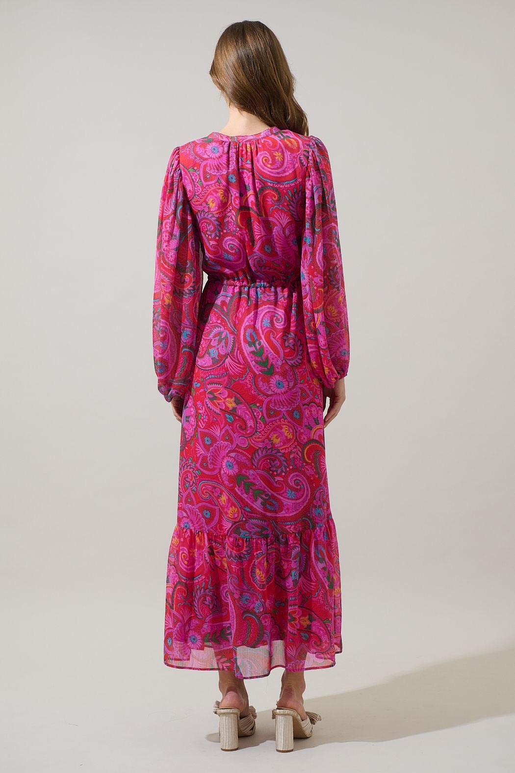 Embrace the beauty of every season in our Anais Floral Mauder Balloon Maxi Dress. Features a split neckline with a tie detail that's framed by sheer, long balloon sleeves. An elastic band at the waist creates shape, topping a gathered flowy single tier skirt. Leave your hair down or in a bun for a cute look.