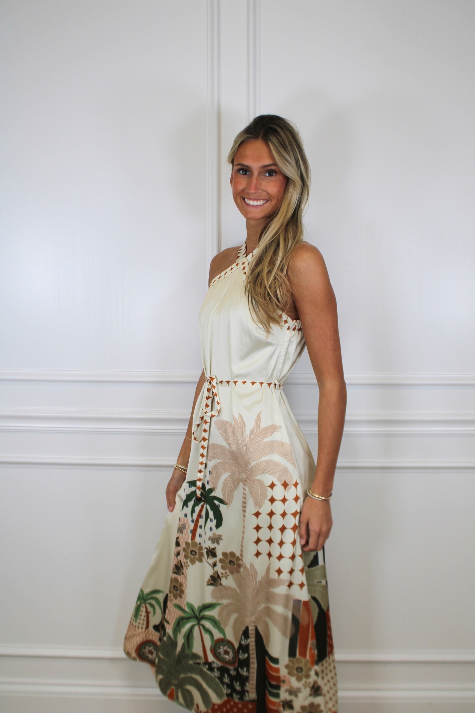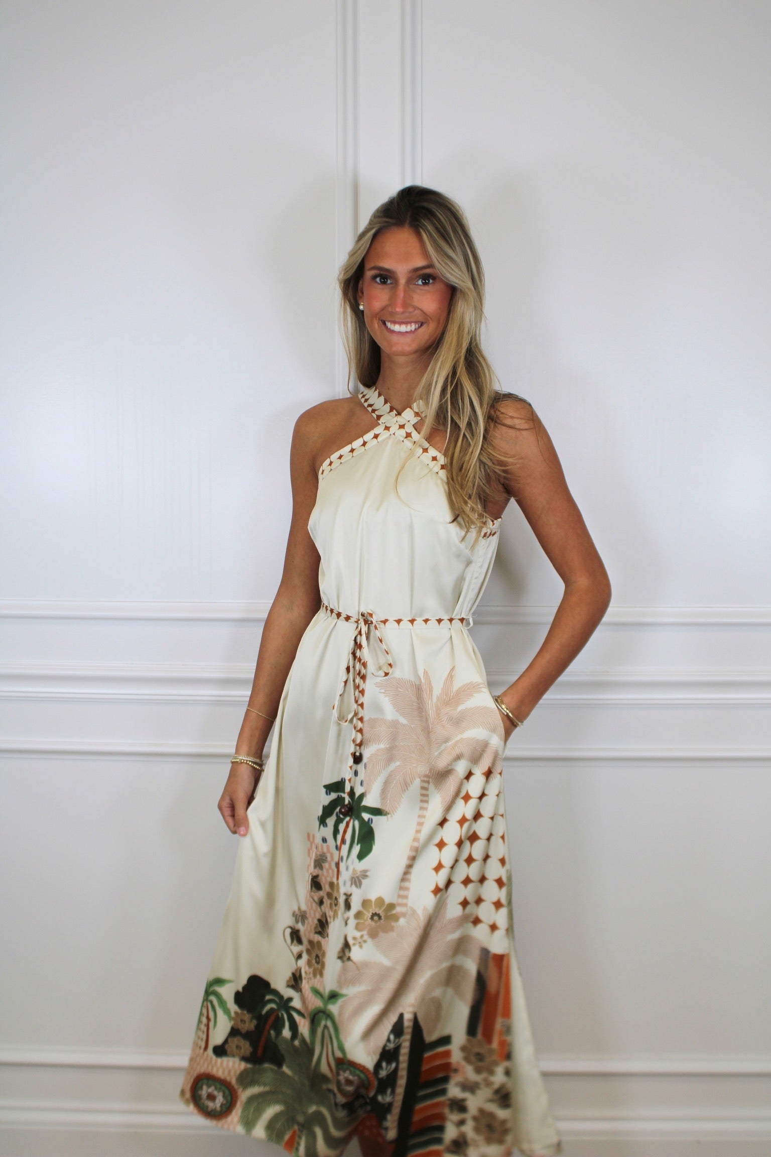 Make a statement with this abstract palm print halter dress—where tropical vibes meet modern style. The eye-catching palm pattern brings an instant pop of personality, while the flattering halter neckline keeps things chic and sophisticated. Perfect for summer getaways, beach parties, or whenever you want to turn heads with effortless flair. Slip it on and let your adventurous side shine.