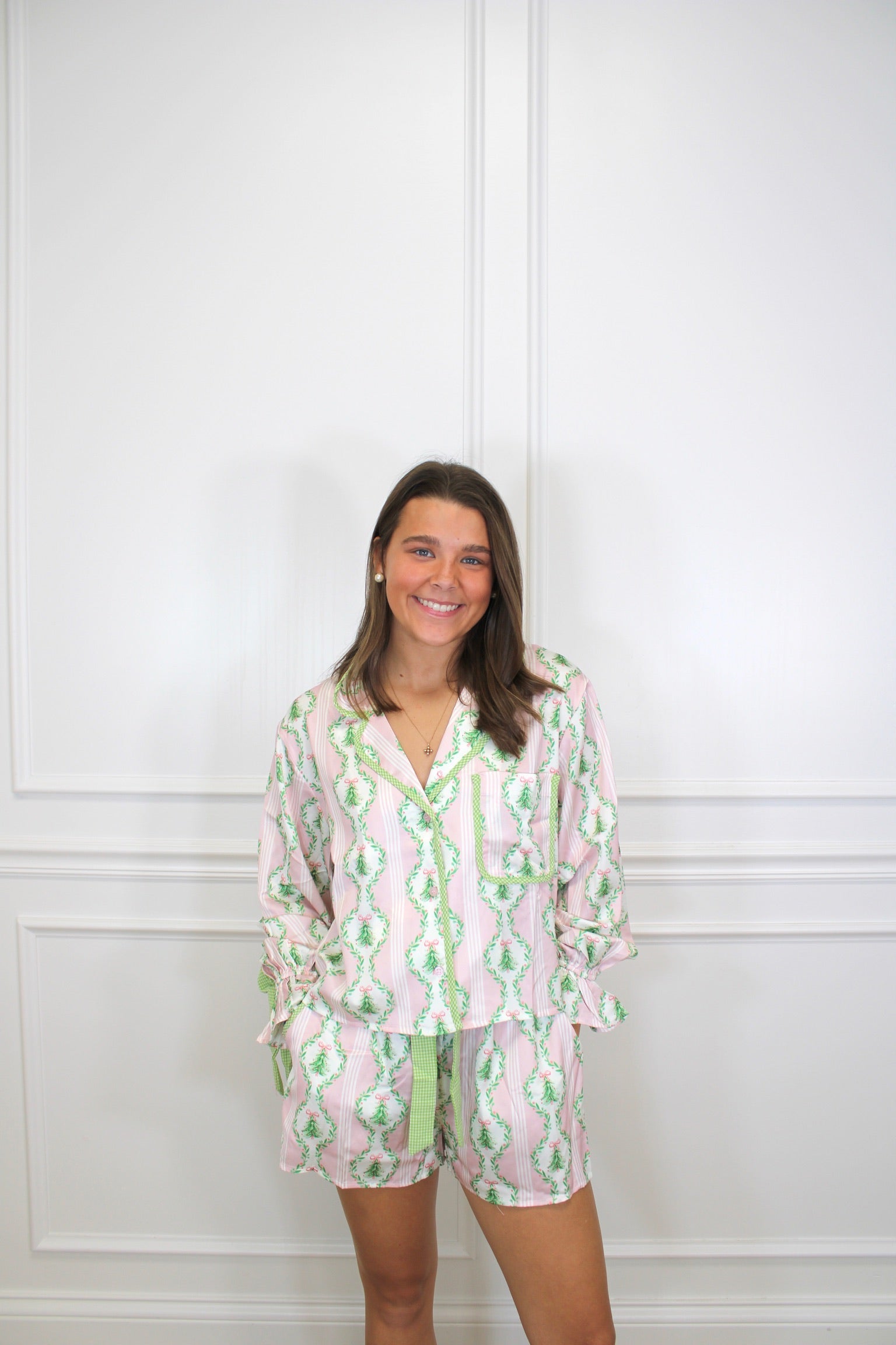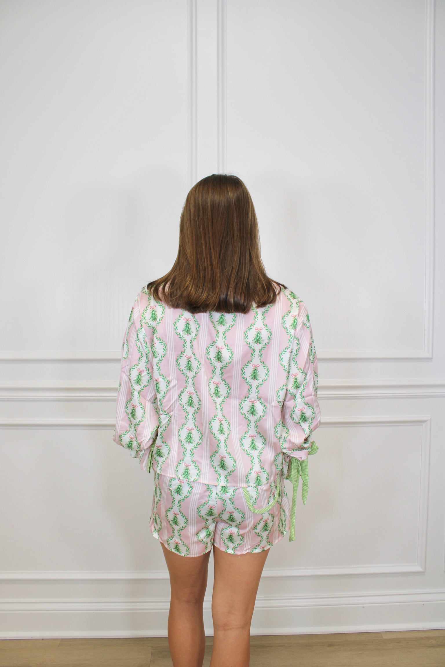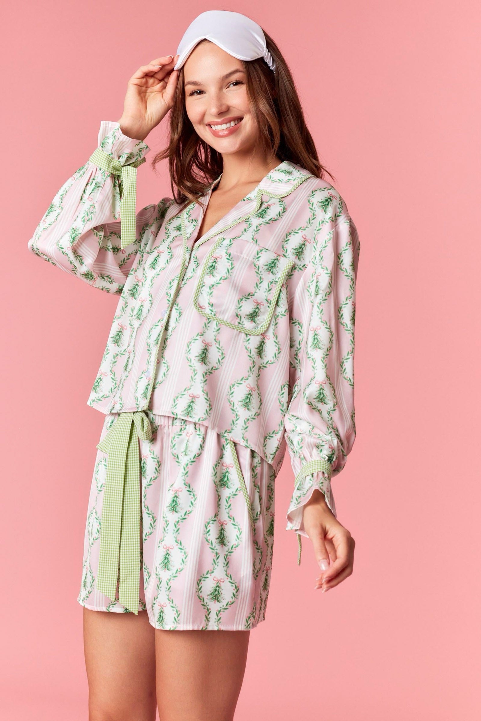 Wrap yourself in holiday cheer with this adorable pink Christmas pajama set! Featuring a charming printed satin fabric with classic gingham detailing and a sweet tie accent, it's the perfect cozy companion for festive nights. The smooth satin finish feels luxurious against your skin while the playful print spreads seasonal joy. Whether you're lounging by the tree or snuggling up with hot cocoa, this set brings comfort and Christmas magic together. Ideal for holiday parties, family gatherings, or simply making your downtime merrier!