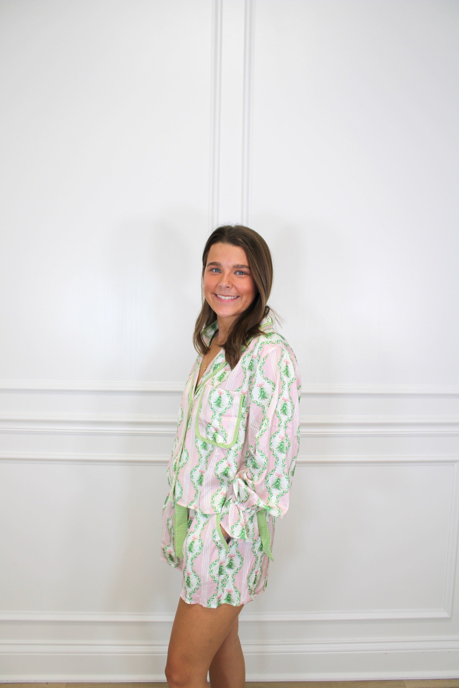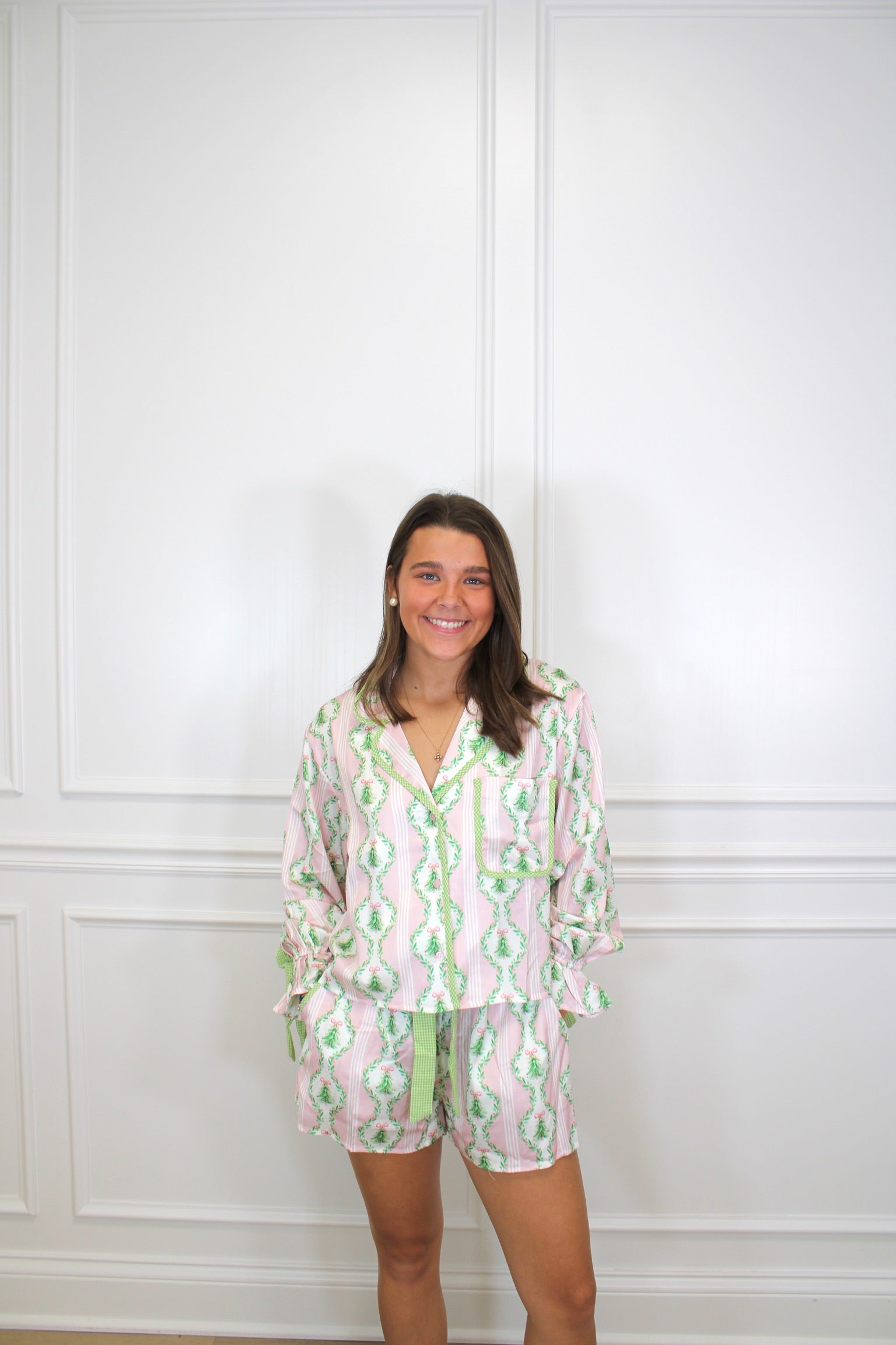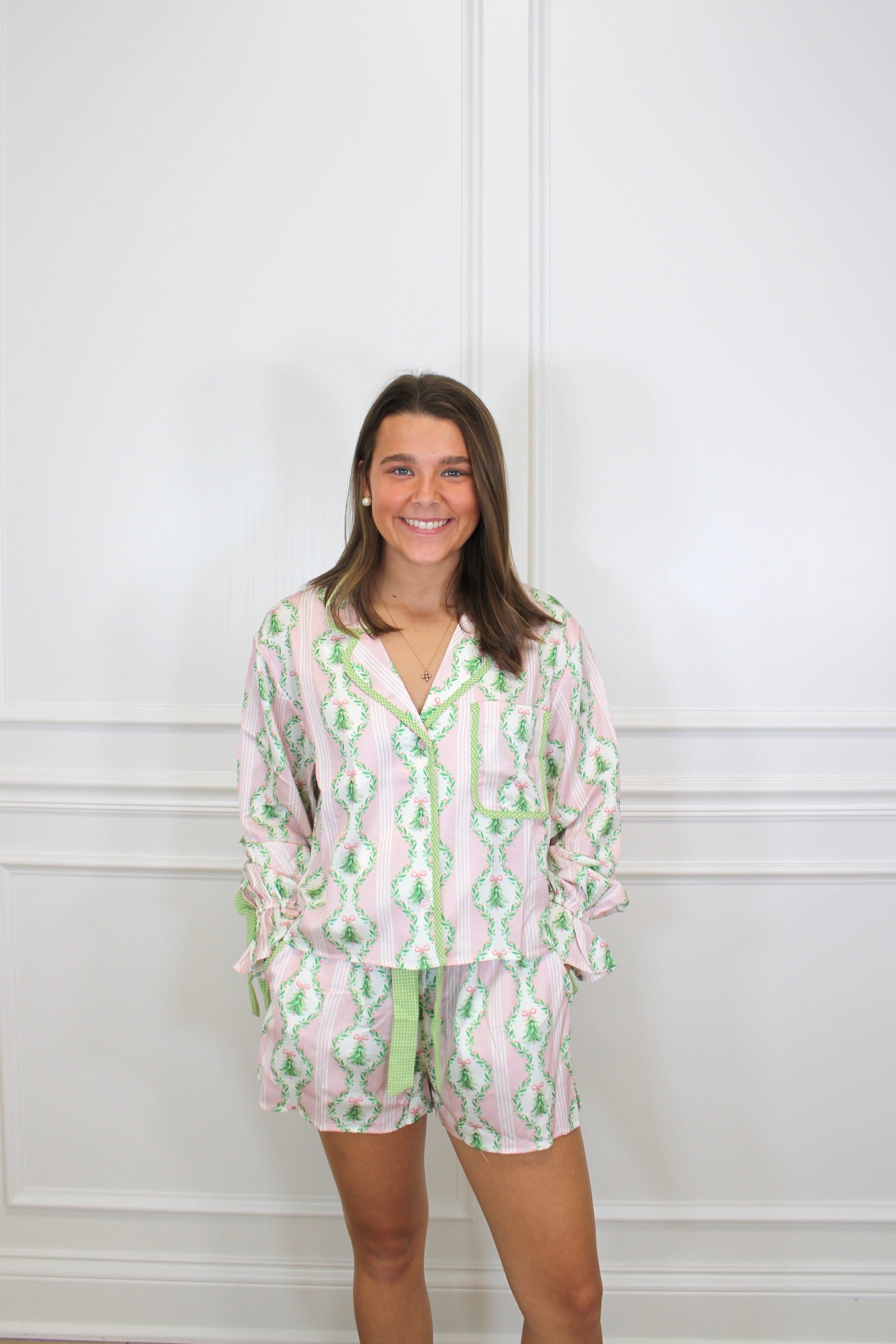 Wrap yourself in holiday cheer with this adorable pink Christmas pajama set! Featuring a charming printed satin fabric with classic gingham detailing and a sweet tie accent, it's the perfect cozy companion for festive nights. The smooth satin finish feels luxurious against your skin while the playful print spreads seasonal joy. Whether you're lounging by the tree or snuggling up with hot cocoa, this set brings comfort and Christmas magic together. Ideal for holiday parties, family gatherings, or simply making your downtime merrier!