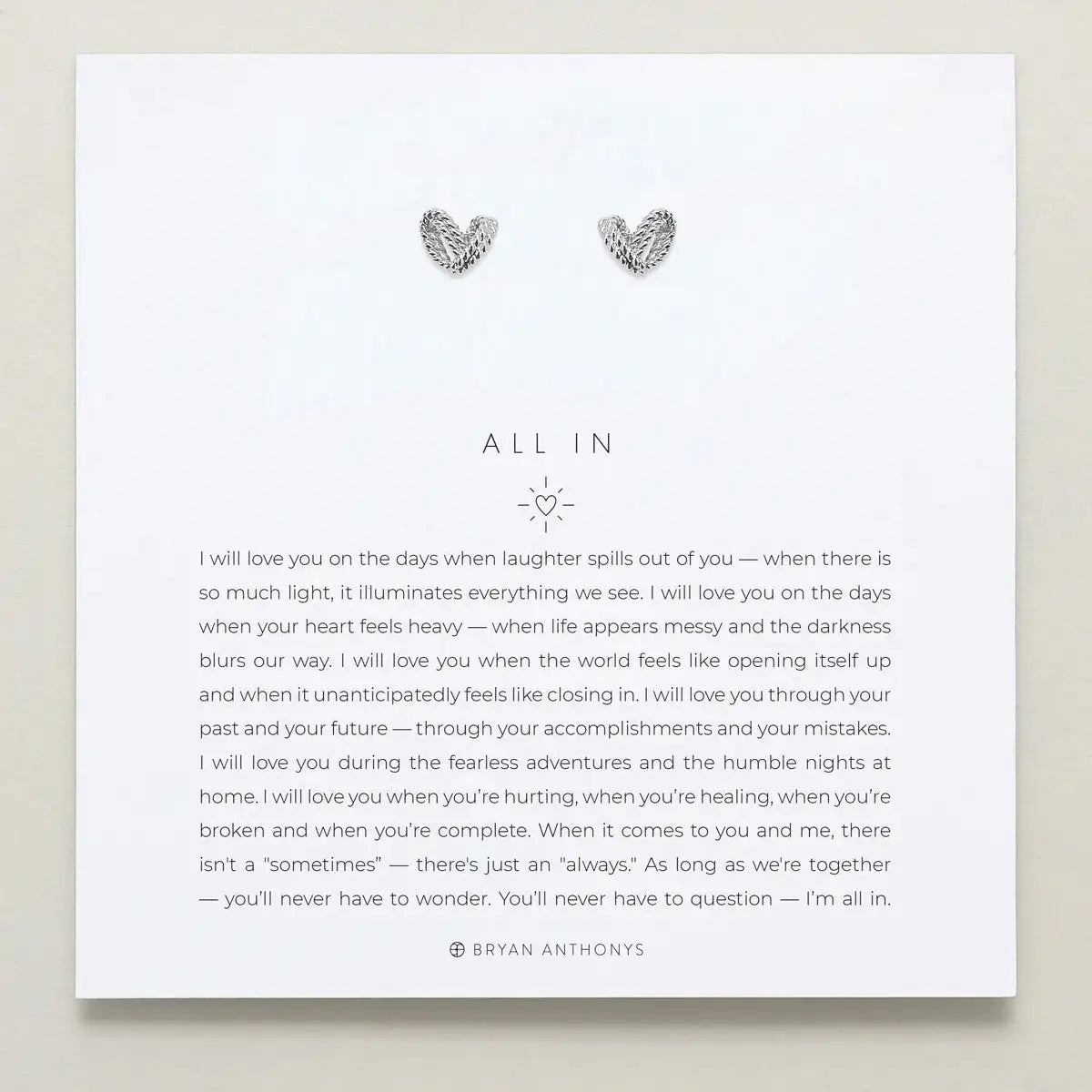 I will love you on the days when laughter spills out of you — when there is so much light, it illuminates everything we see. I will love you on the days when your heart feels heavy — when life appears messy and the darkness blurs our way. I will love you when the world feels like opening itself up and when it unanticipatedly feels like closing in. I will love you through your past and your future — through your accomplishments and your mistakes. I will love you during the fearless adventures and the humble nights at home. I will love you when you’re hurting, when you’re healing, when you’re broken and when you’re complete. When it comes to you and me, there isn't a "sometimes” — there's just an "always." As long as we're together — you’ll never have to wonder. You’ll never have to question — I’m all in.