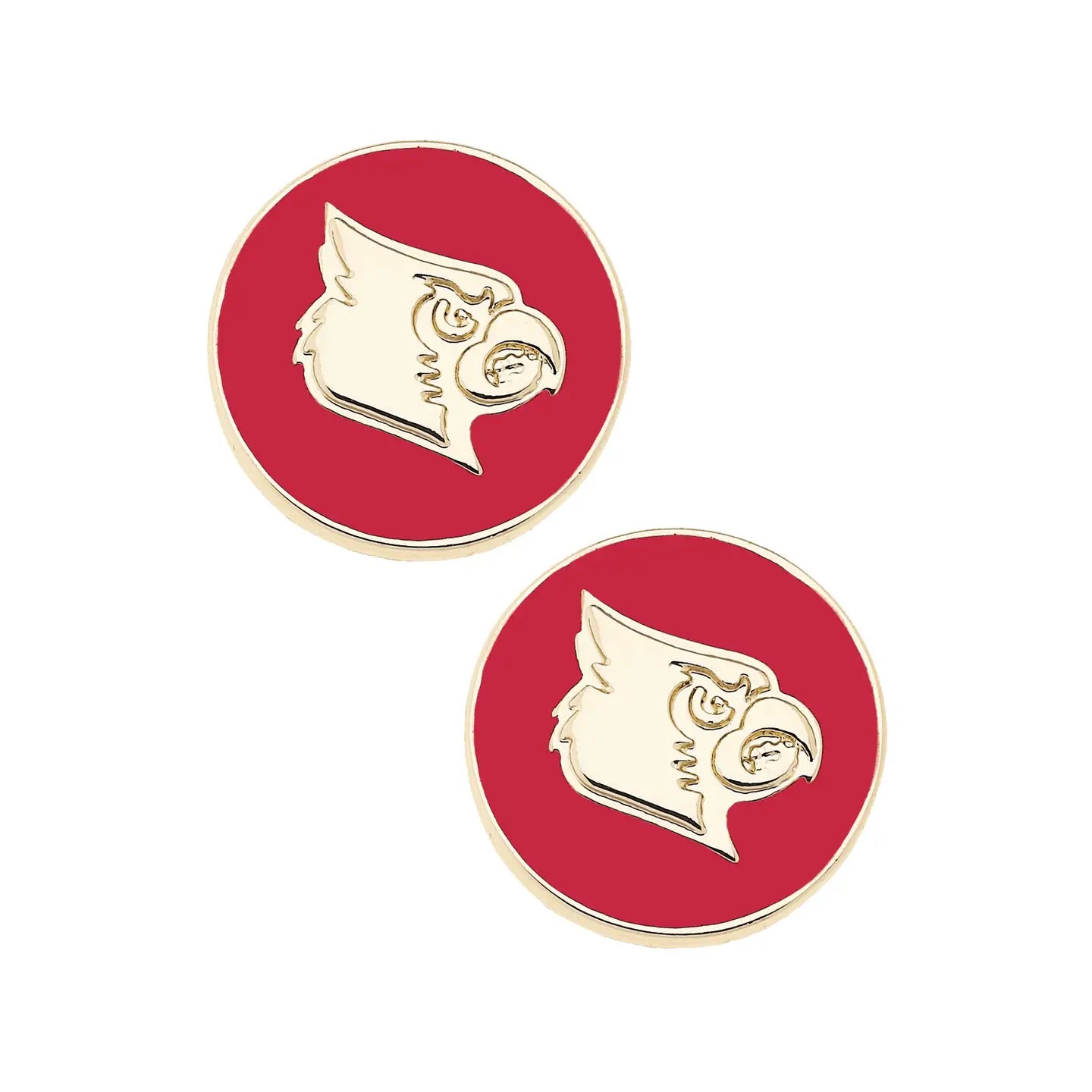 Show off your school spirit in style with the Louisville Cardinals Logo Circle Stud Earrings in Red/Shiny Gold. Featuring a bold red enamel design of the iconic Cardinals logo encircled by shiny gold, these stud earrings are the perfect combination of team pride and elegance for game day or any day. DETAILS Base Metal with Shiny Gold Plating .65"L x .65"W NCAA Officially Licensed