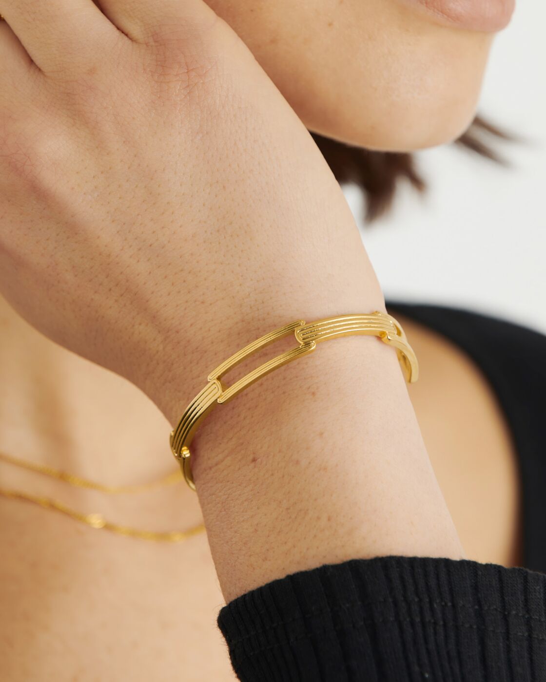 Certified waterproof, our Arabella Waterproof Gold Bangle is designed in durable 18K Gold PVD Coating, meaning it is waterproof, sweat-proof and life-proof - and features an oversized link design. Pair this style effortlessly with the matching Arabella Earrings for a coordinated look.