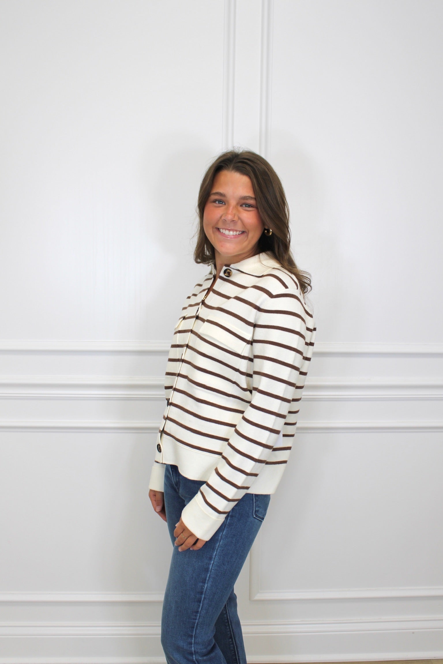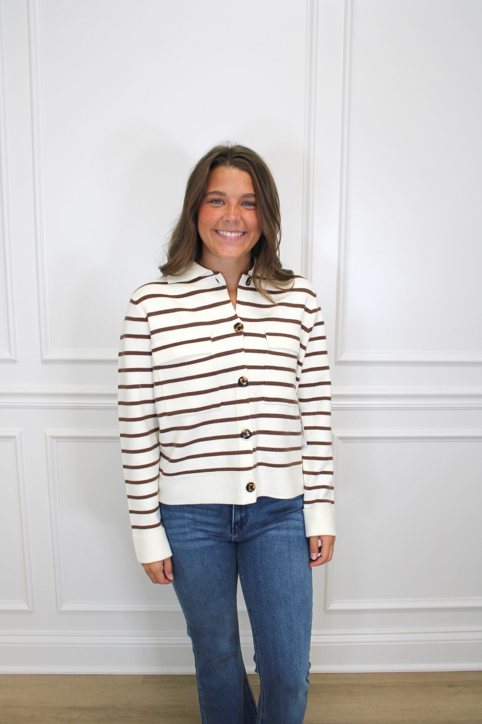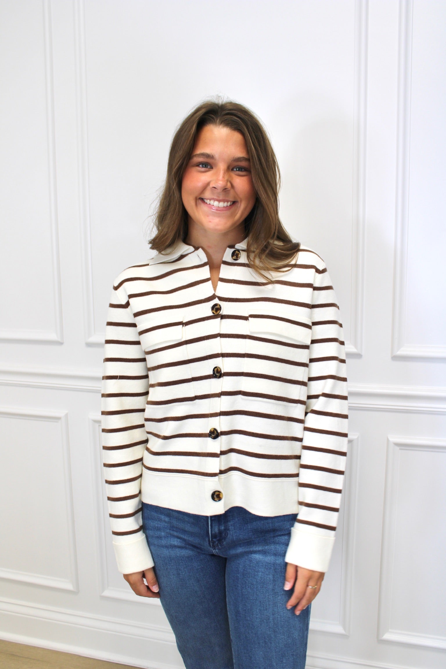Wrap yourself in warmth and style with the Lindsey Cardigan. Its cozy double-knit jacquard fabric keeps you snug, while the playful stripe pattern and refined collar add a fun, polished flair. Charming chest pockets bring a touch of whimsy and practicality to your everyday look.