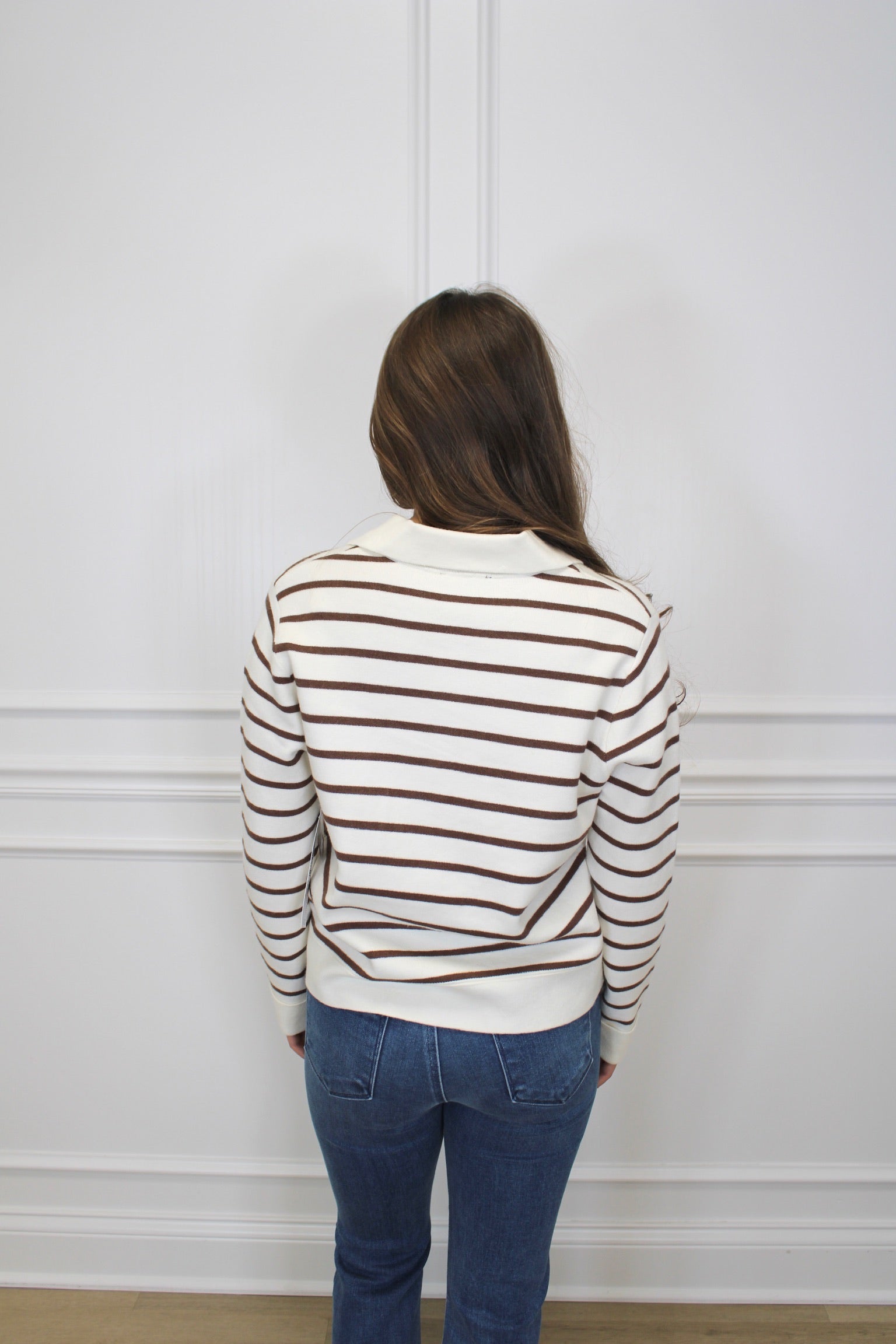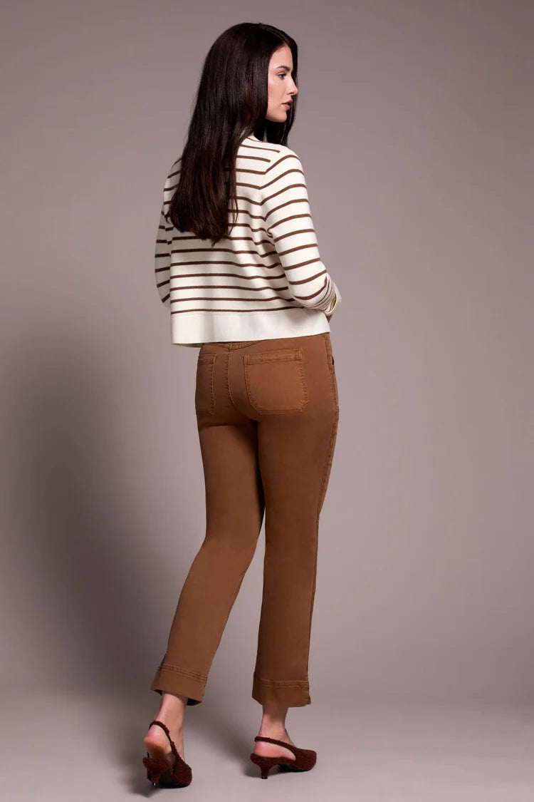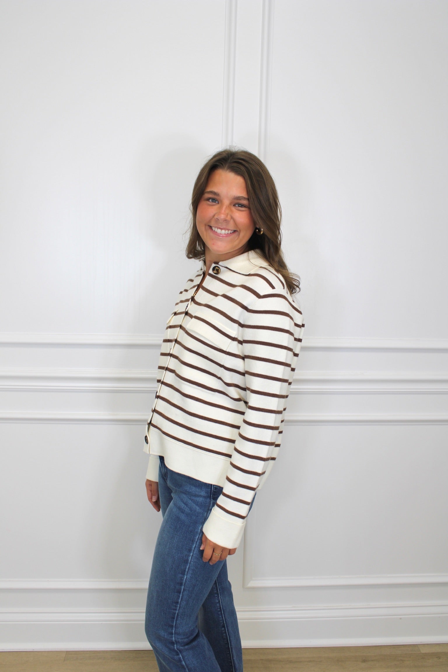 Wrap yourself in warmth and style with the Lindsey Cardigan. Its cozy double-knit jacquard fabric keeps you snug, while the playful stripe pattern and refined collar add a fun, polished flair. Charming chest pockets bring a touch of whimsy and practicality to your everyday look.