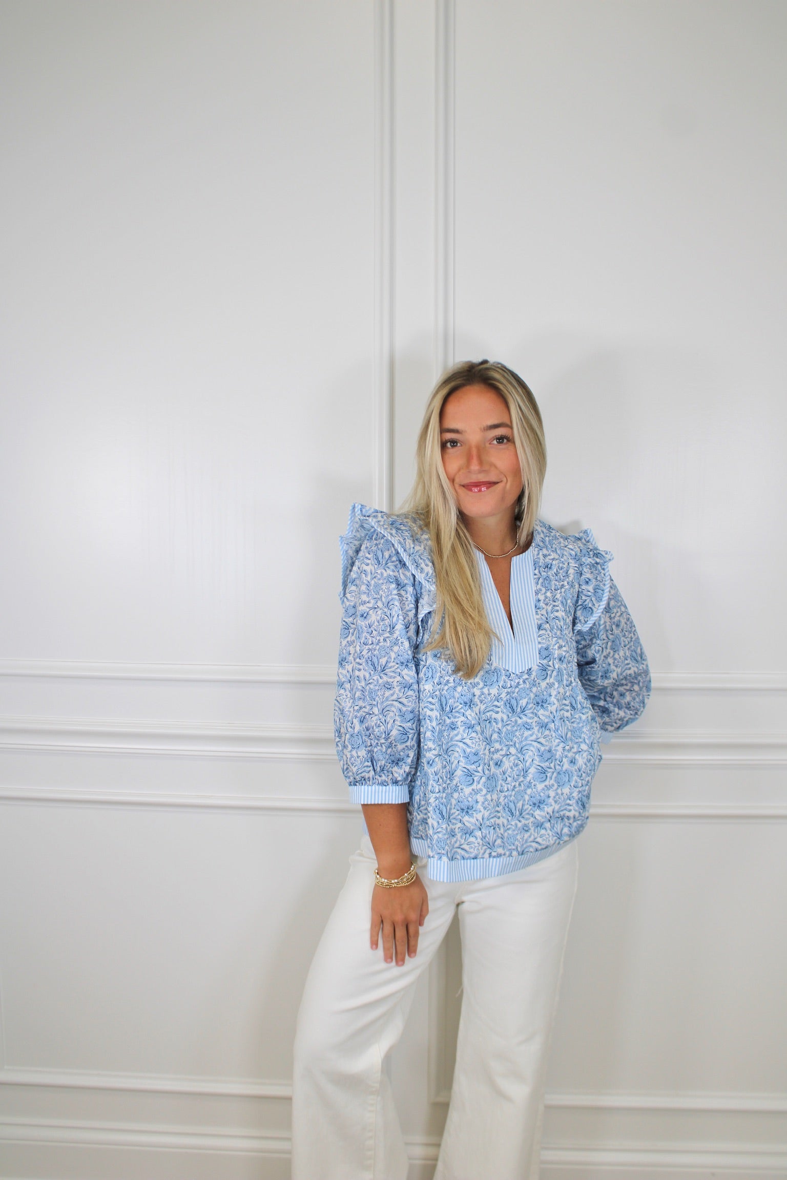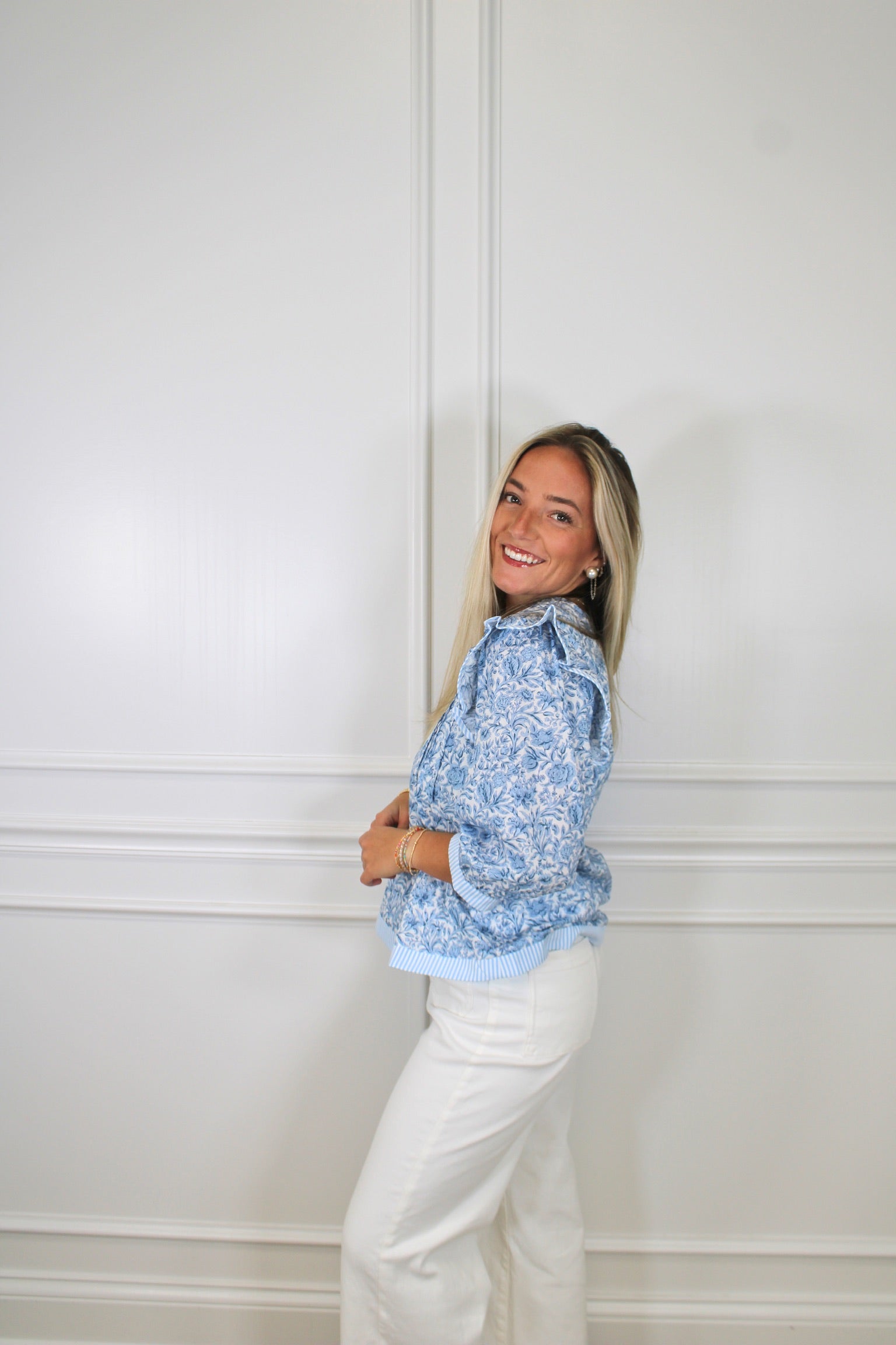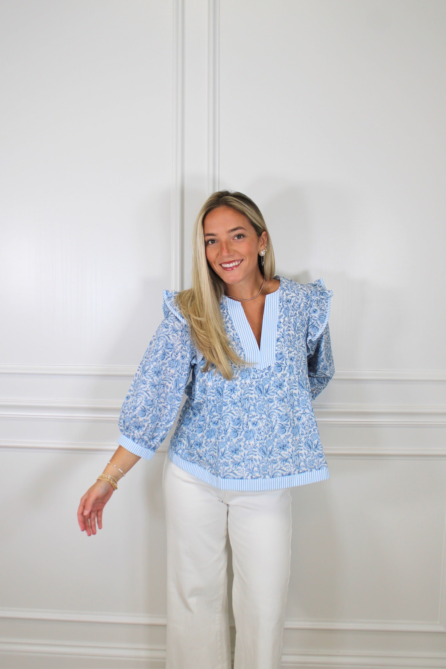 Elevate your wardrobe with this charming Spring Rosette Blouse, featuring delightful puff sleeves that add a touch of whimsy to any outfit. The crisp blue fabric is accented with playful striped detailing that brings movement and visual interest to your look. Perfect for spring days when you want to feel both polished and fun, this blouse pairs effortlessly with jeans, skirts, or tailored trousers. A versatile piece that celebrates feminine style with a modern twist.