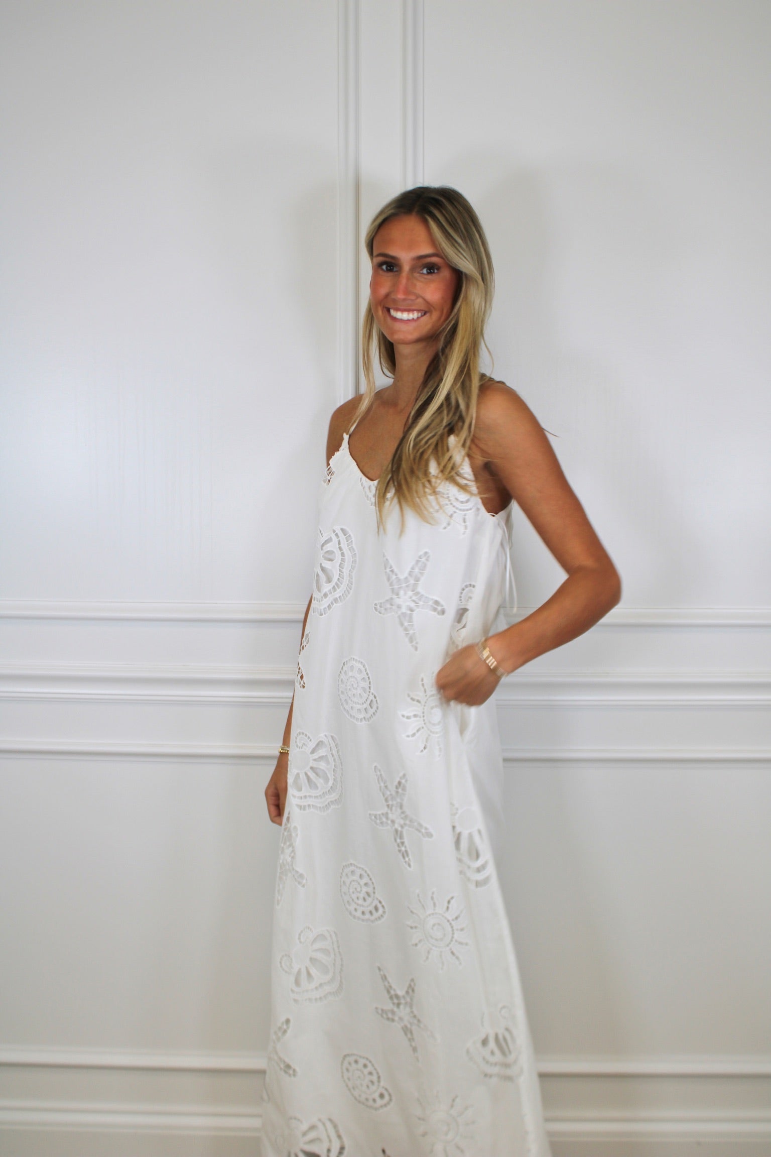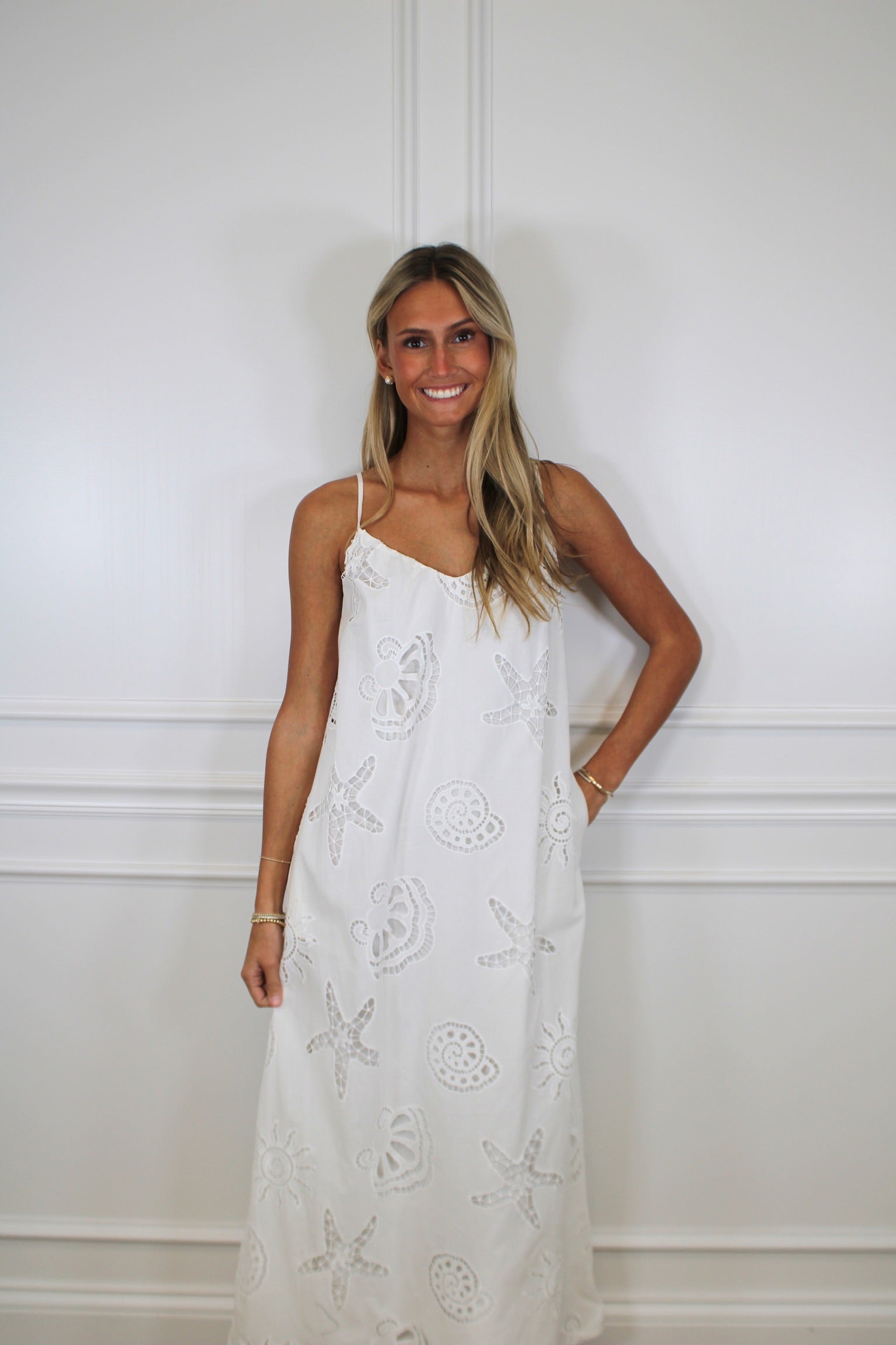 Dive into seaside charm with this Star Fish Embroidery Eyelet Maxi Dress! Featuring a flattering V-neckline and adjustable back-tie spaghetti straps, this breezy beauty offers a relaxed, lined fit that moves with you. The delicate starfish embroidery and eyelet detailing bring whimsical coastal vibes to every wear. Whether you're strolling the beach, enjoying a spring garden party, or soaking up summer sun, this dress delivers effortless elegance with a playful twist. Pack it, wear it, love it—your new go-to for warm-weather adventures awaits!