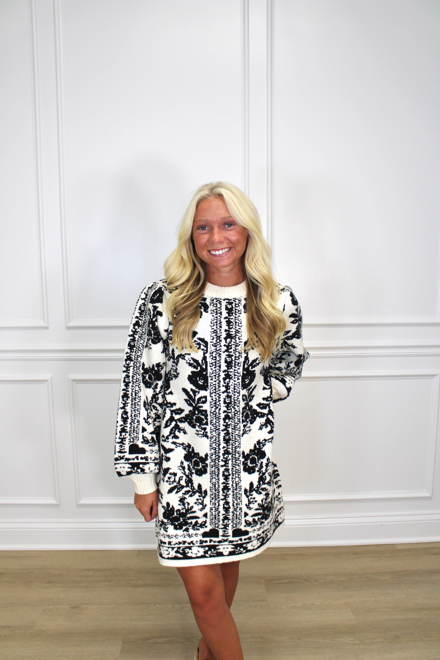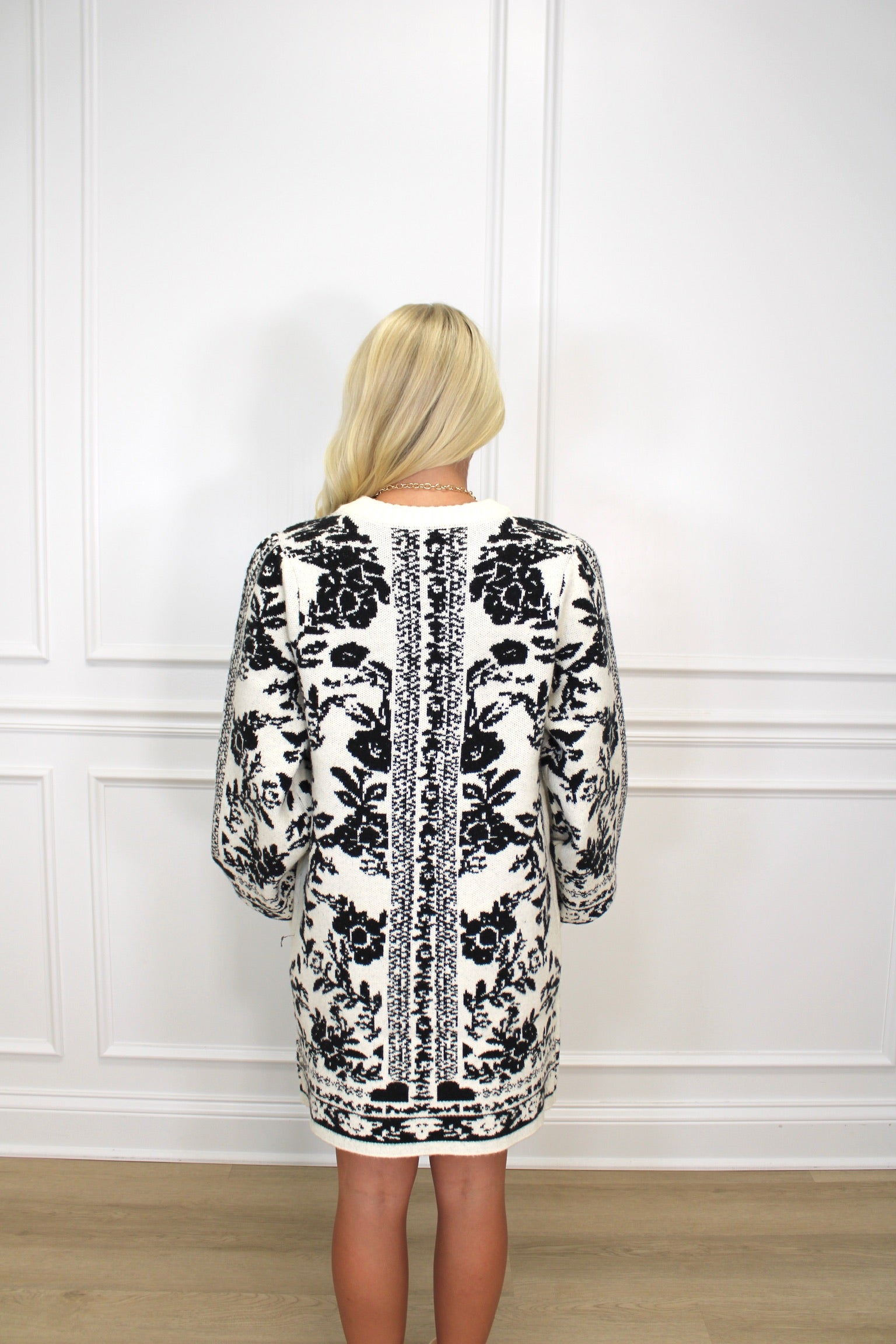 Step into playful elegance with this jacquard floral printed sweater knit mini dress. Featuring long balloon sleeves and a cozy pullover design, it’s perfect for adding a fun, feminine touch to your look while keeping you comfy. The intricate floral pattern and flattering mini length make it a charming choice for any casual occasion.