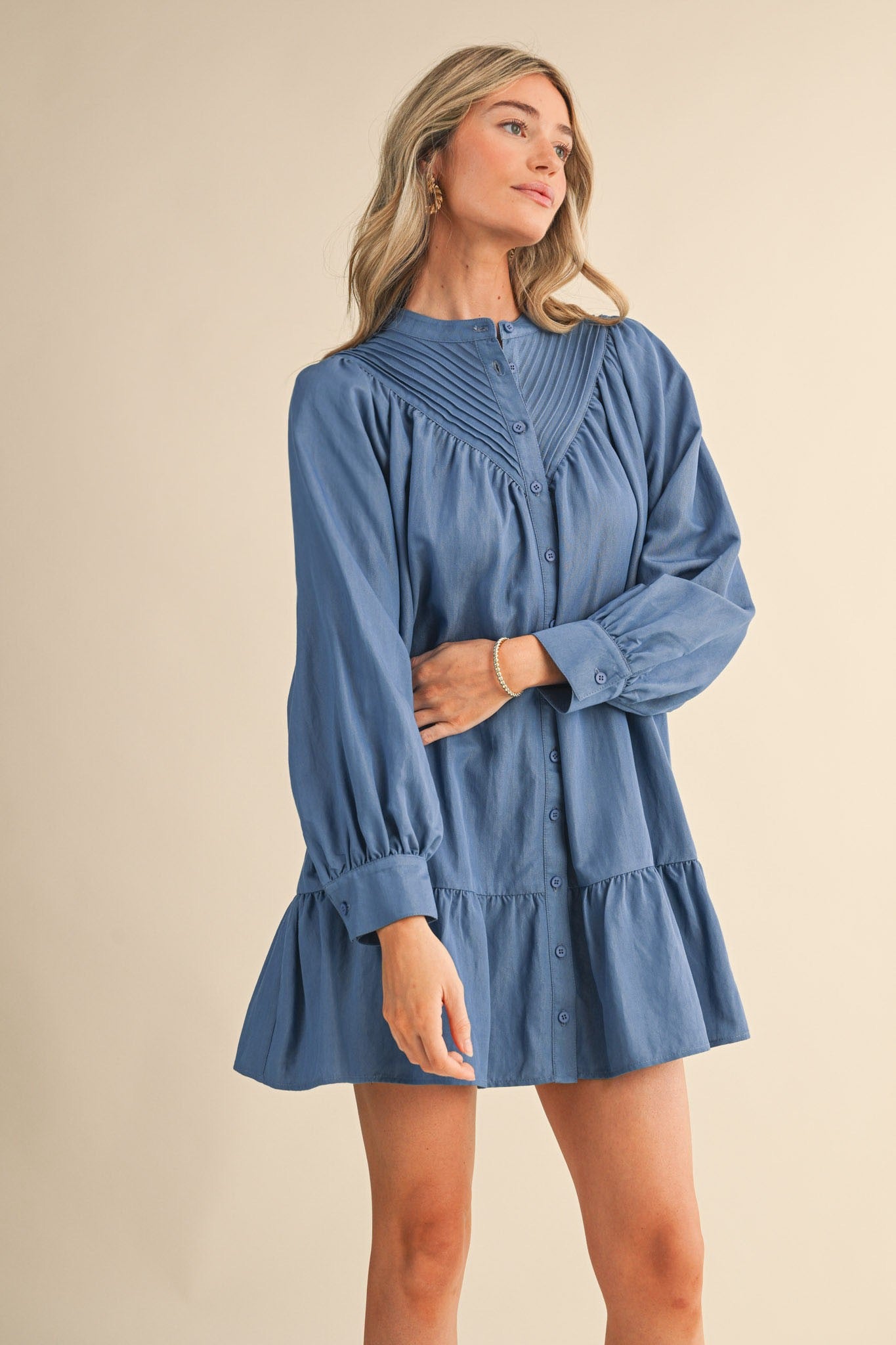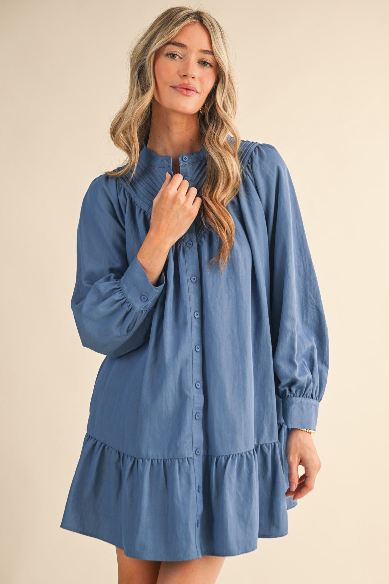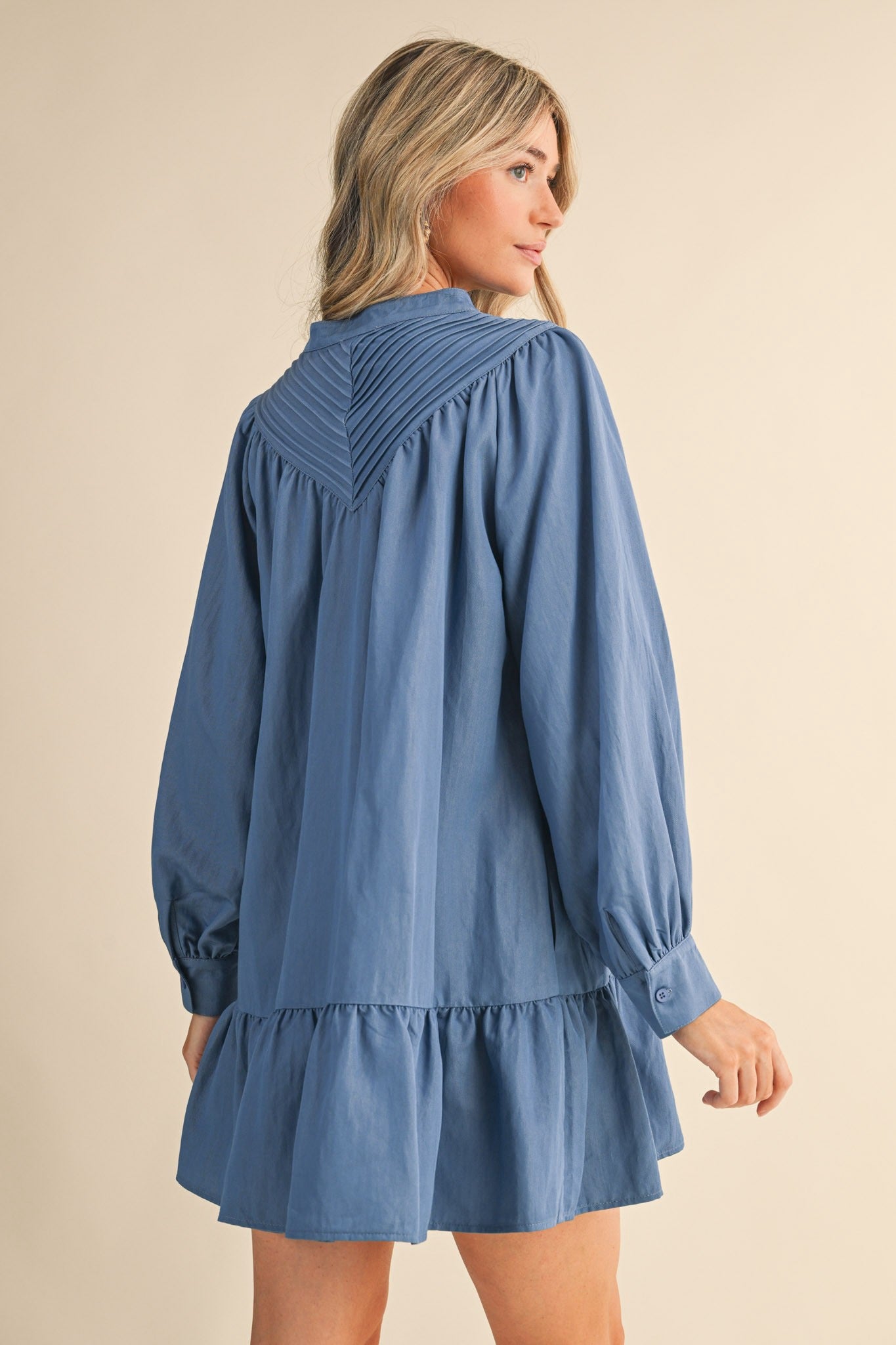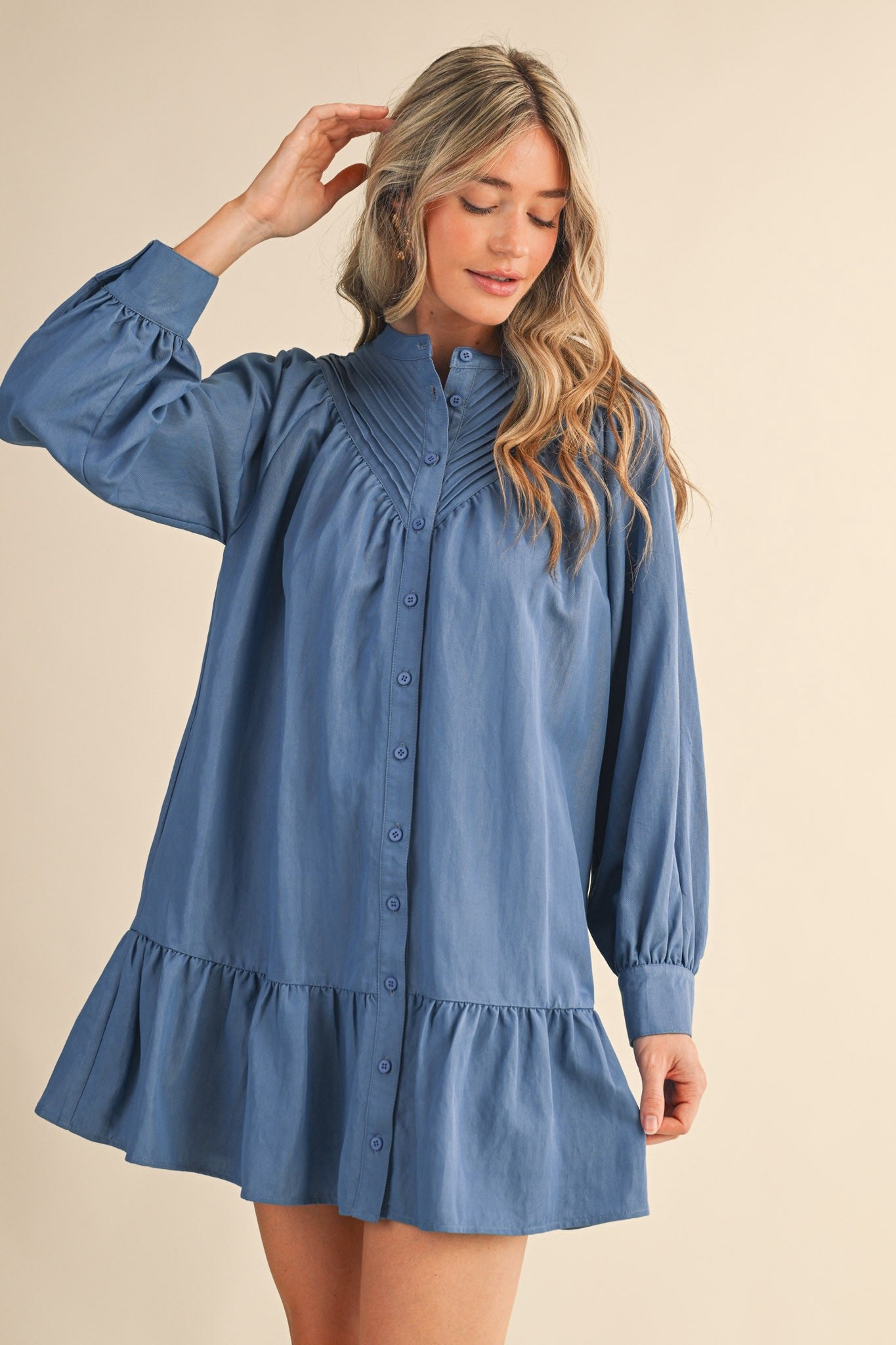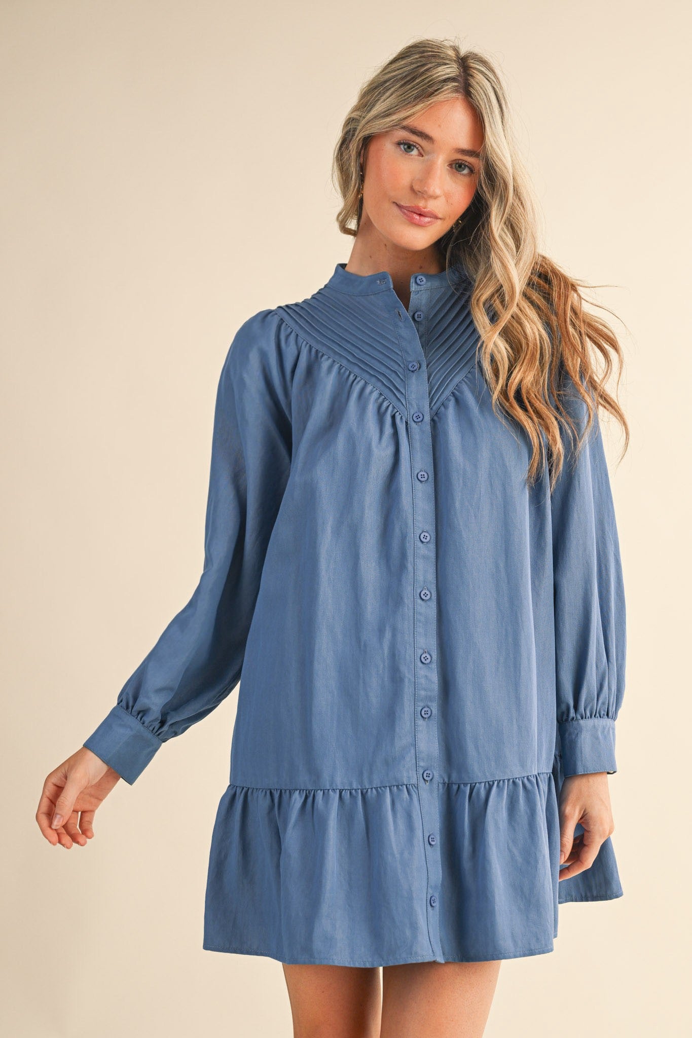 Elevate your everyday style with this charming pin tuck yoke button-down mini dress! Featuring delicate pintuck detailing on the front and back yoke, a crisp stand collar, and romantic long puff sleeves with buttoned cuffs, this dress strikes the perfect balance between polished and playful. The drop waist seam creates a flattering silhouette, while the mini skirt hem keeps things fun and flirty. Practical pockets and a lined interior make this dress as functional as it is fabulous. Perfect for dressing up or down, this versatile piece is ready for whatever adventure comes your way.