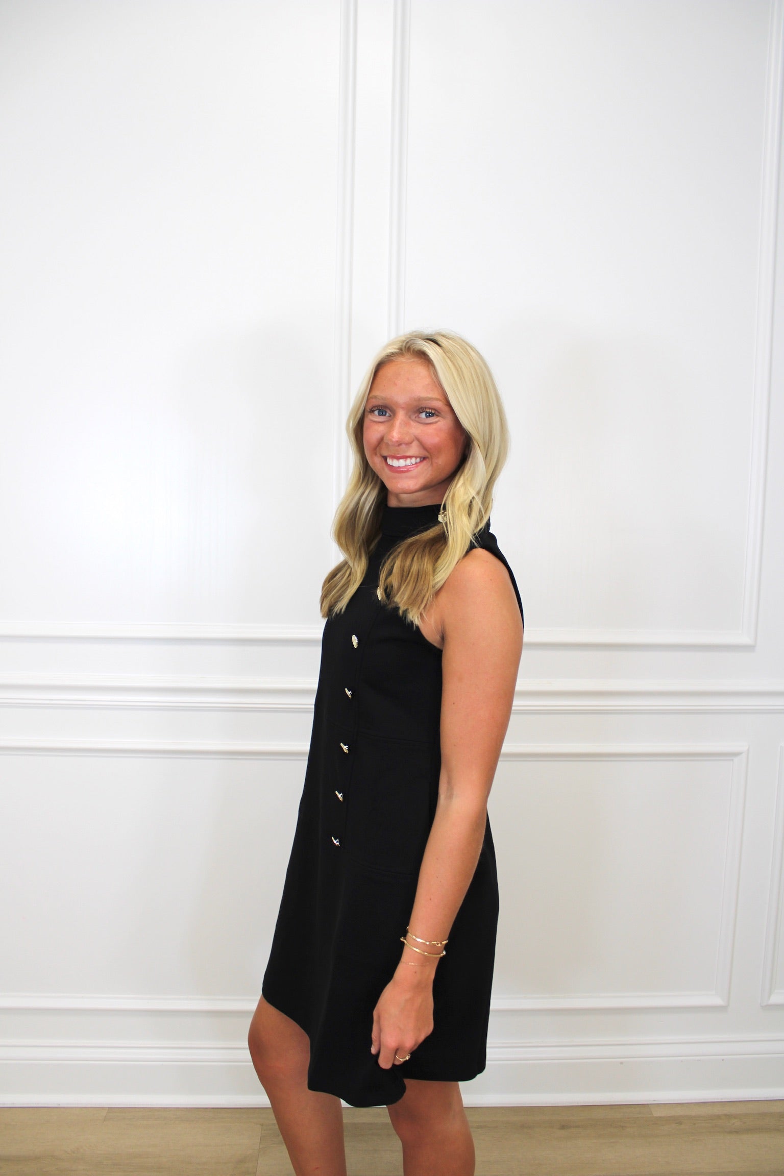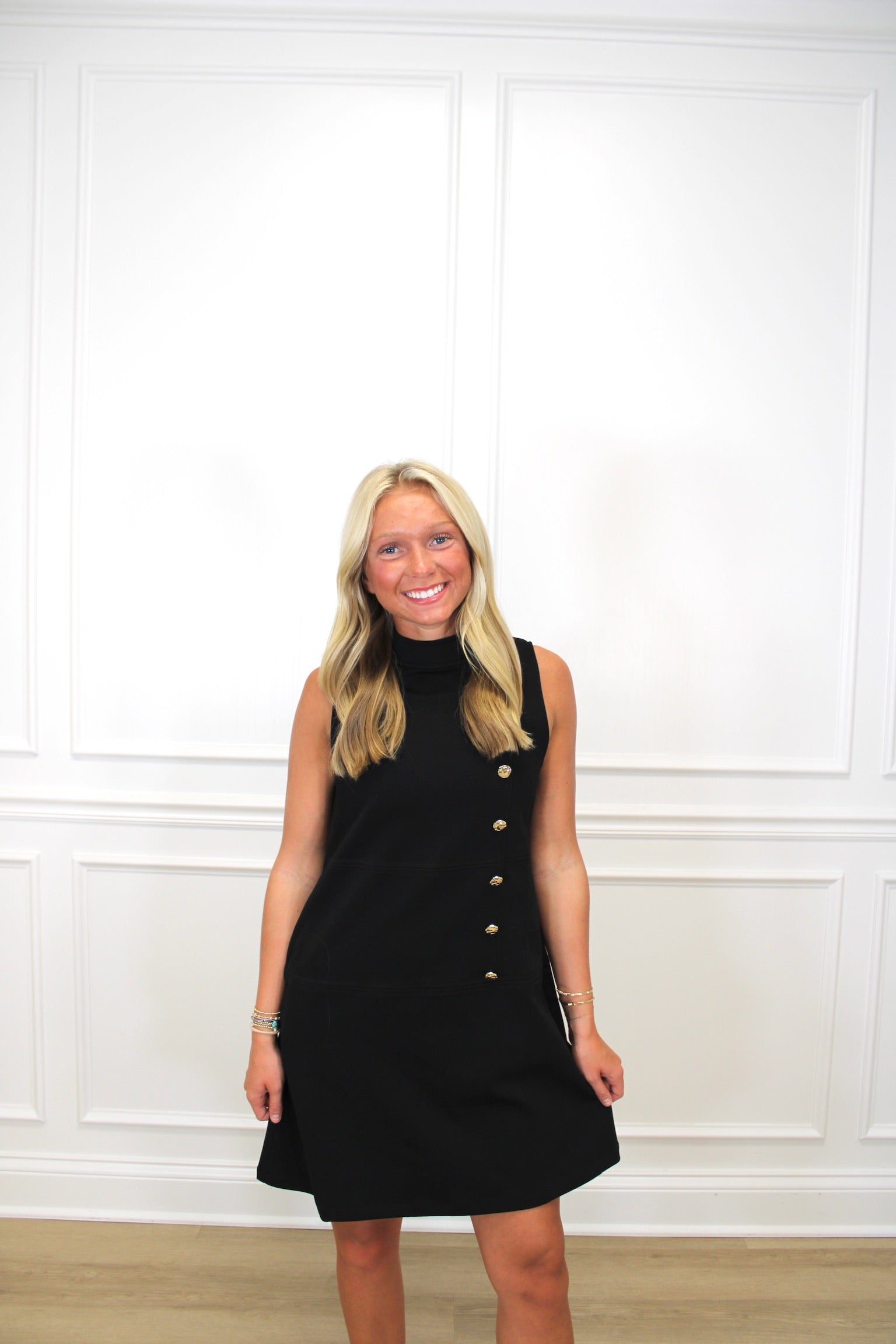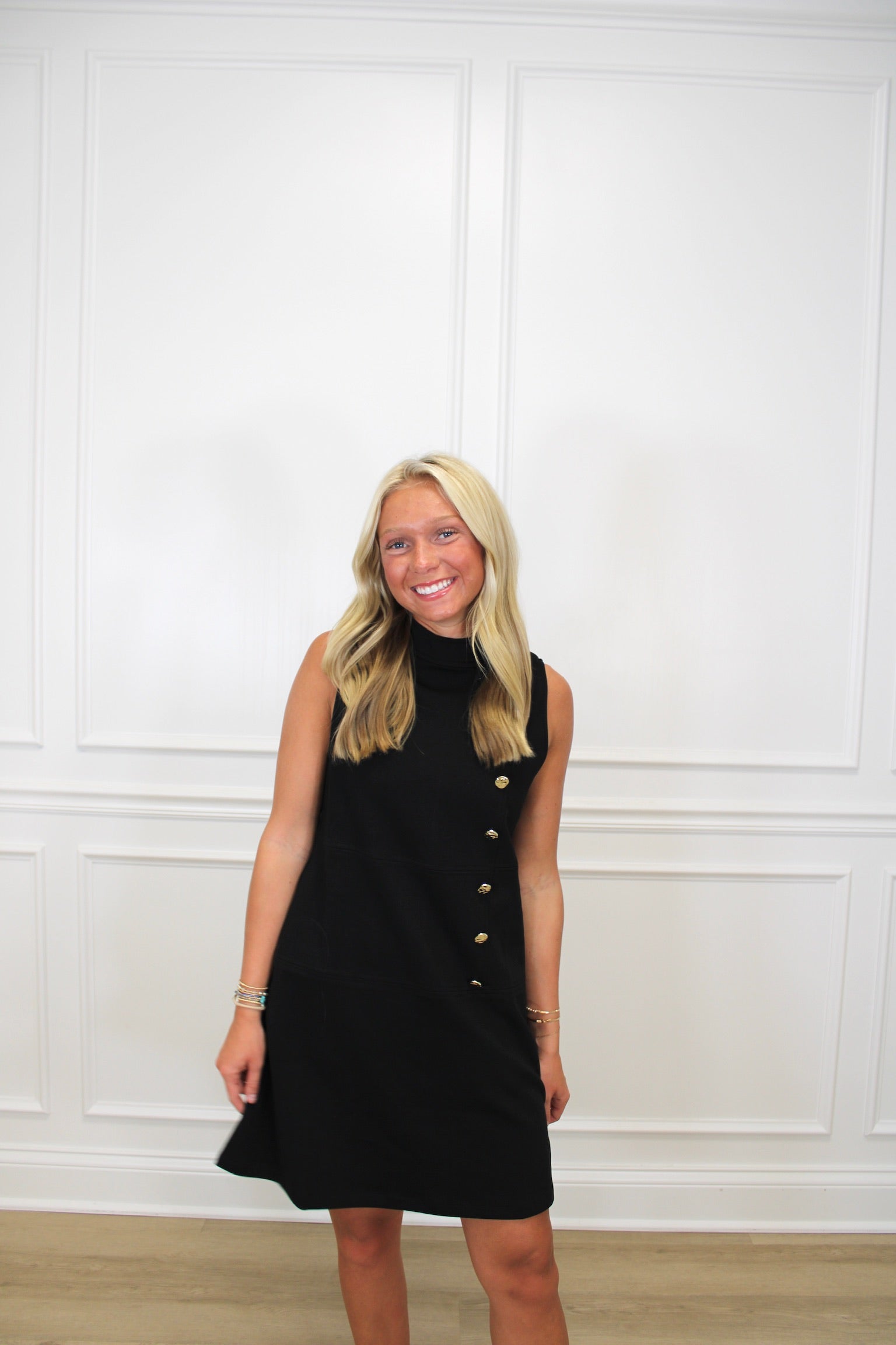 Step out in style with The Astor Dress, a sleek black mini that plays with classic charm. Its slight high neck and gold accent buttons add a touch of elegance, while handy pockets keep your essentials close. Perfect for turning heads with a playful yet refined vibe.