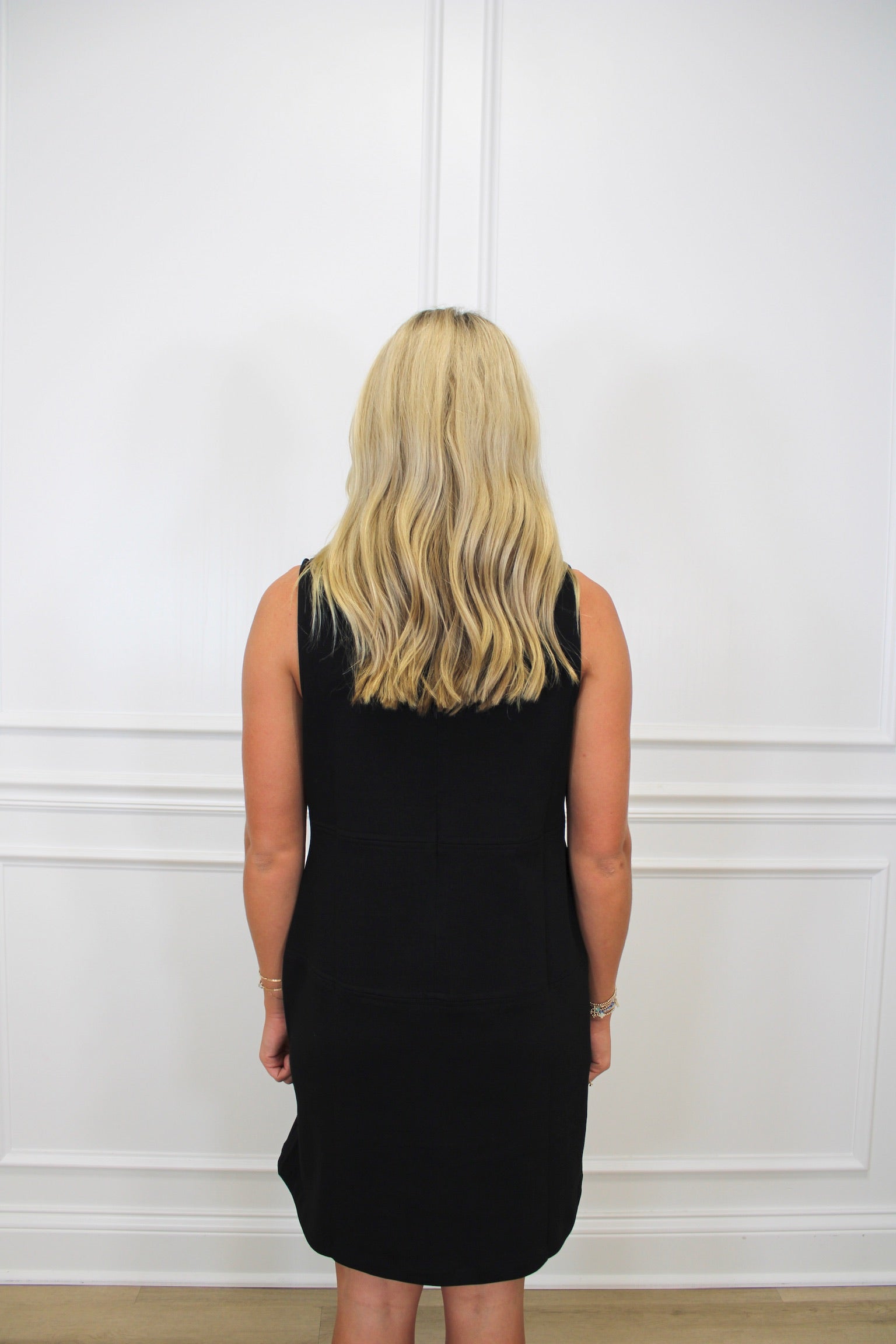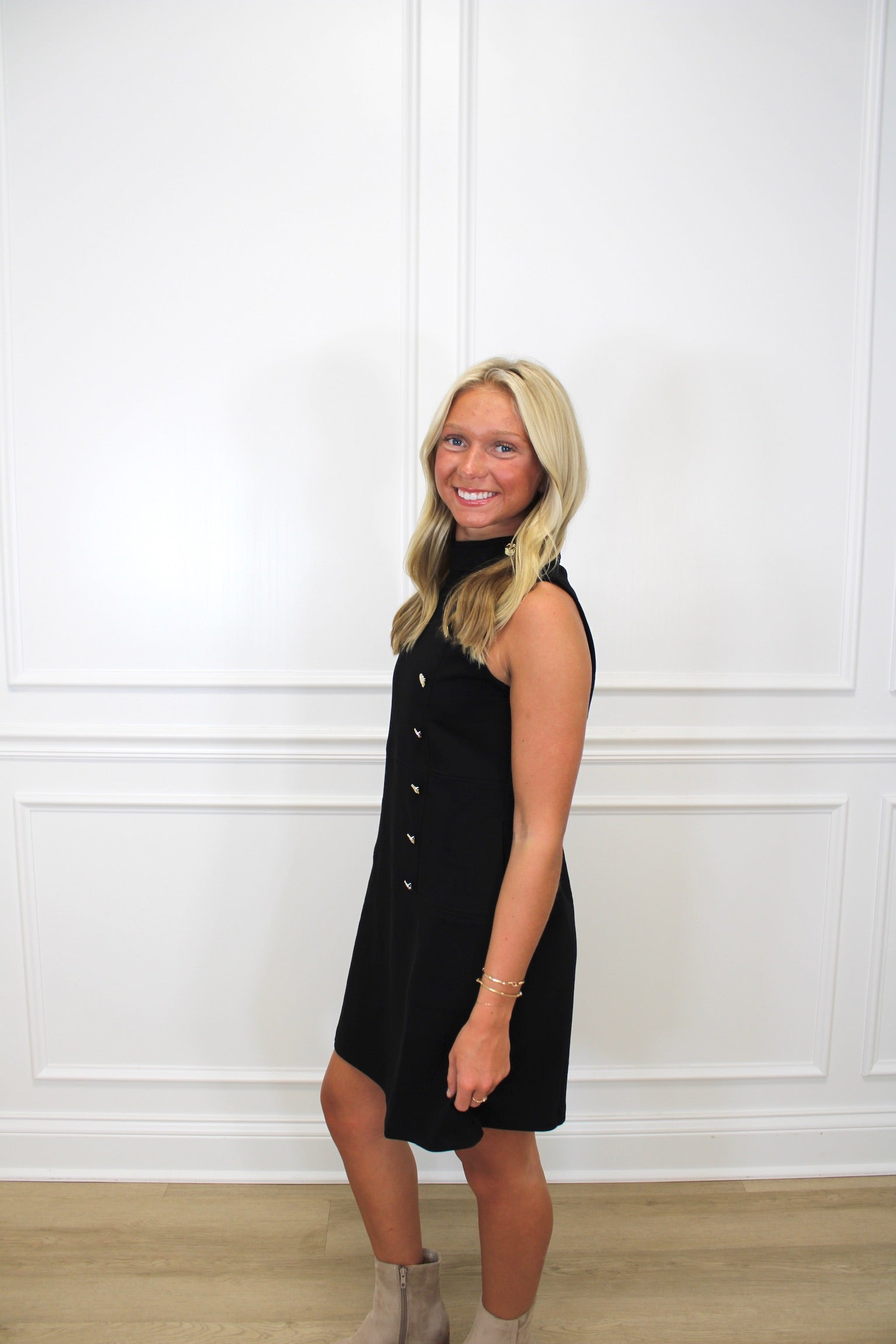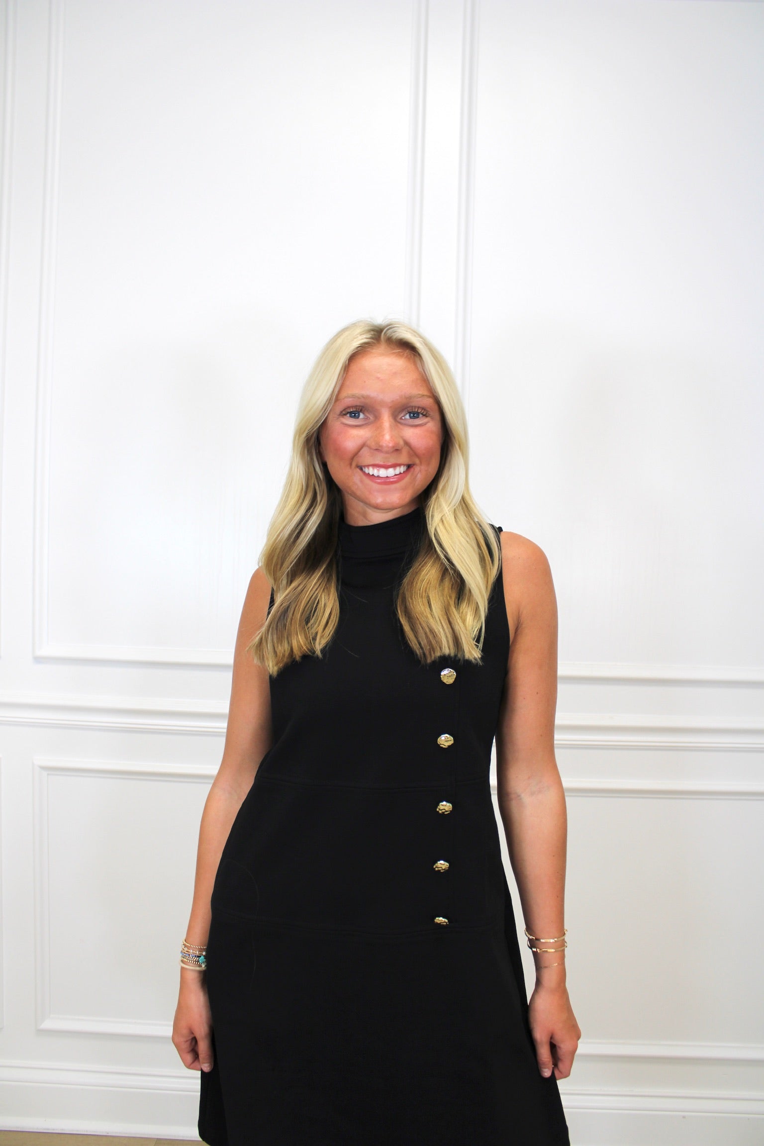 Step out in style with The Astor Dress, a sleek black mini that plays with classic charm. Its slight high neck and gold accent buttons add a touch of elegance, while handy pockets keep your essentials close. Perfect for turning heads with a playful yet refined vibe.
