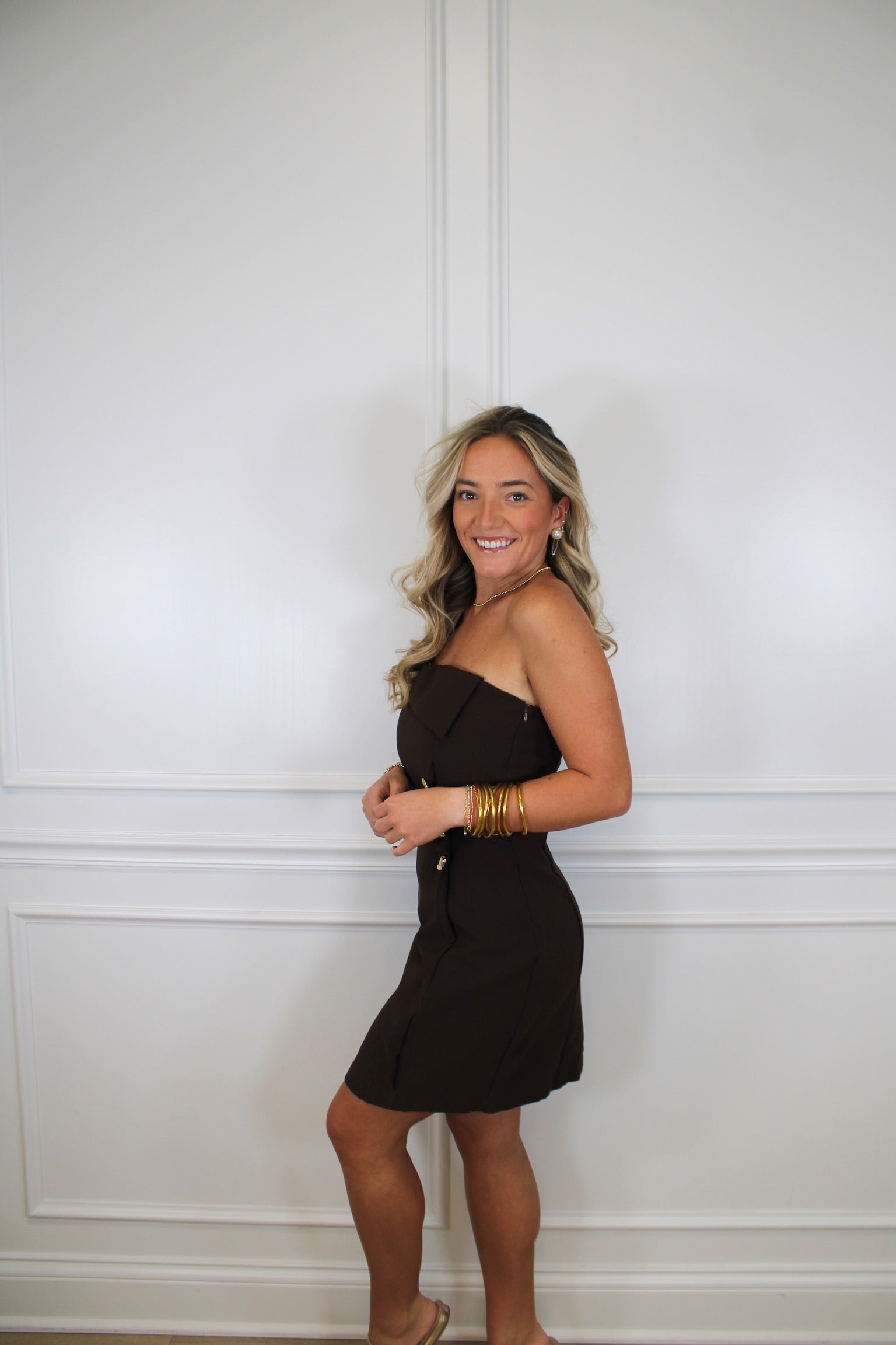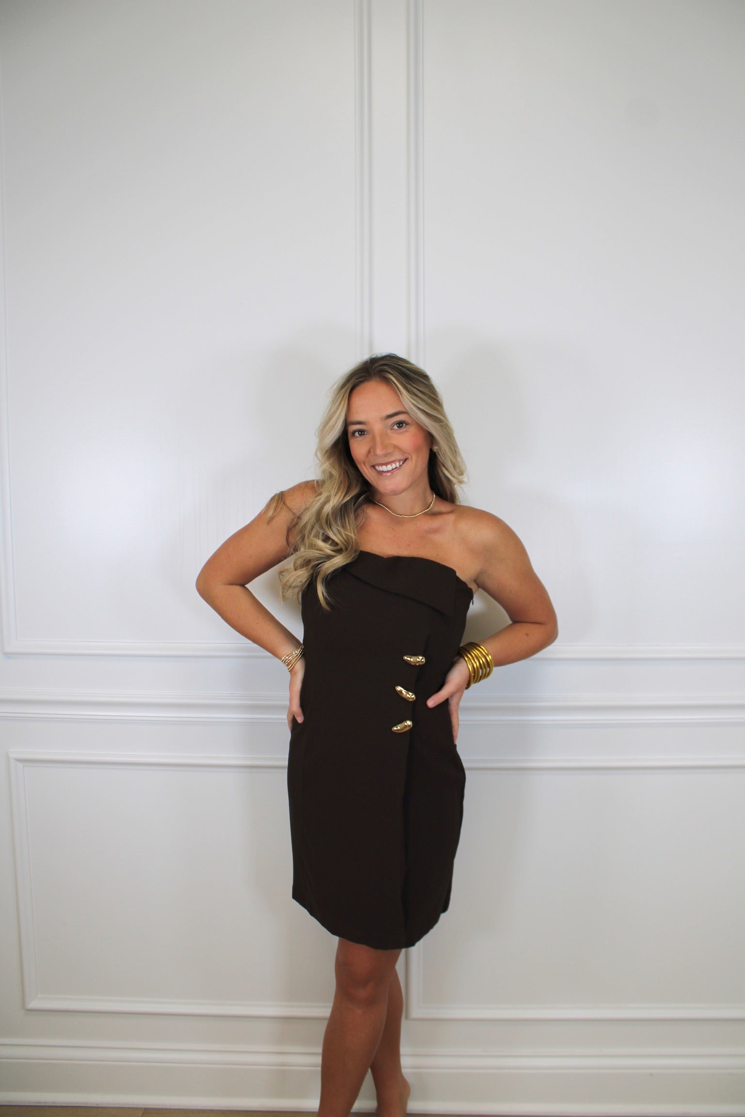 Effortless elegance meets fun with this strapless stunner! The fold-over neckline creates a flattering silhouette that's perfect for date night or special occasions, while the gleaming gold button adds a touch of sophisticated sparkle. No straps means maximum versatility—pair it with heels for glamour or sneakers for an unexpected twist. A dress that's as playful as you are.