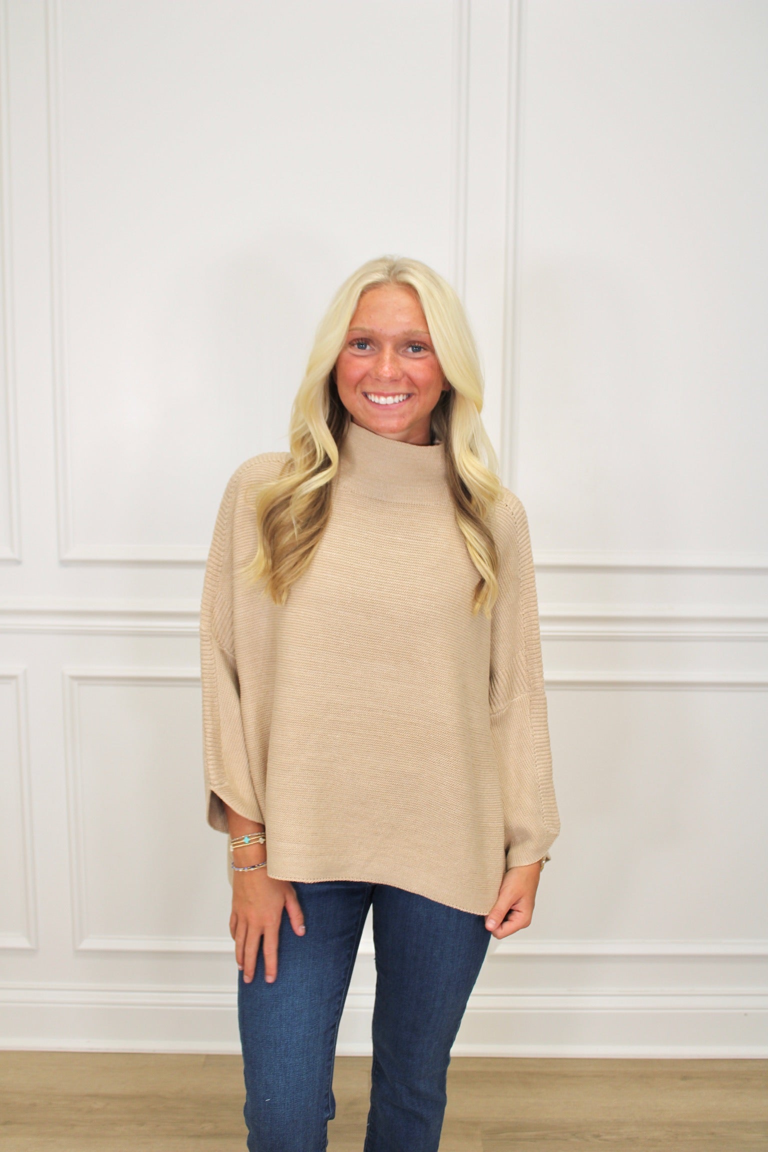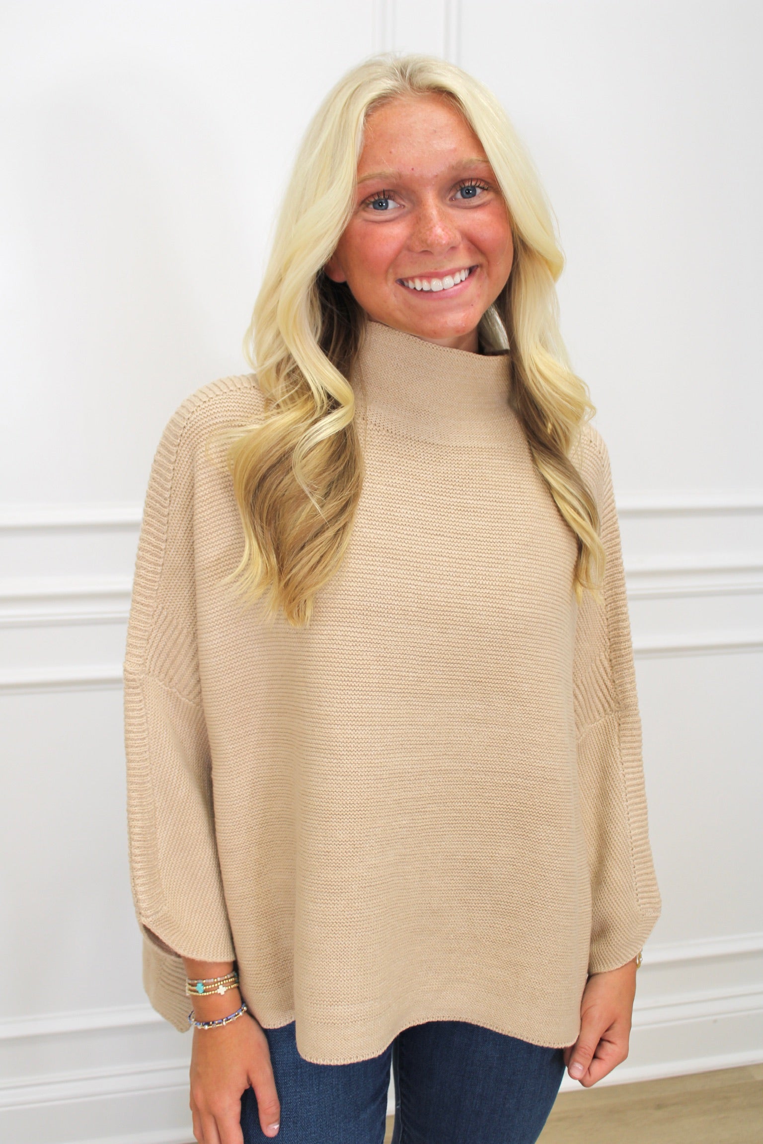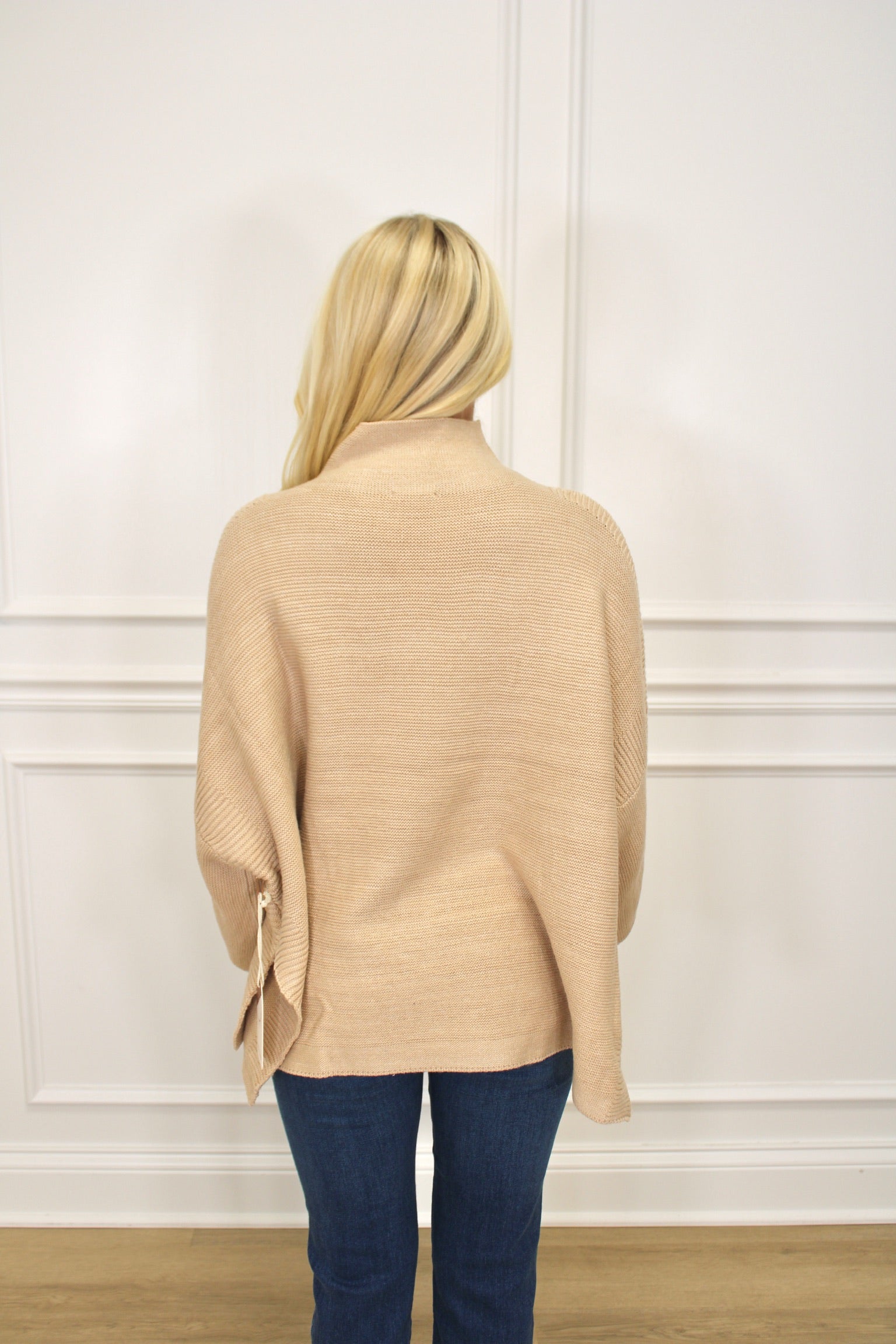 OVERSIZED TURTLENECK HI/LO SWEATER IN GARTER STITCH WITH 3/4 SLEEVE, CONTRASTING RIB ACCENTS AND SIDE SLITS
