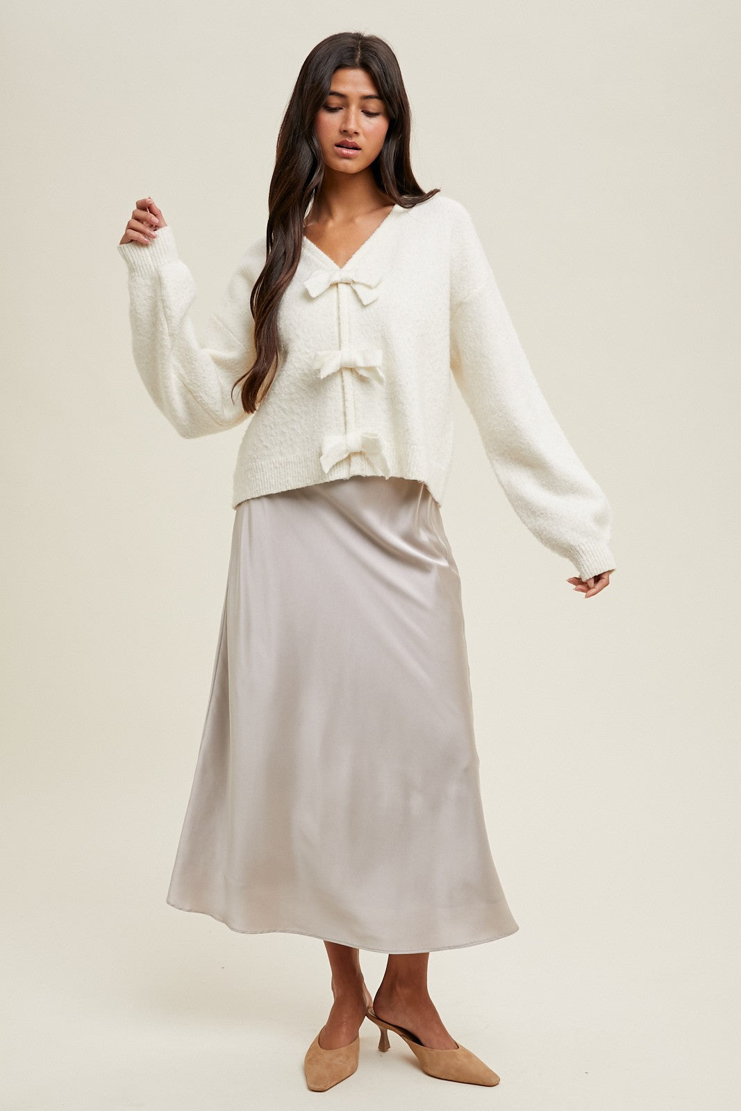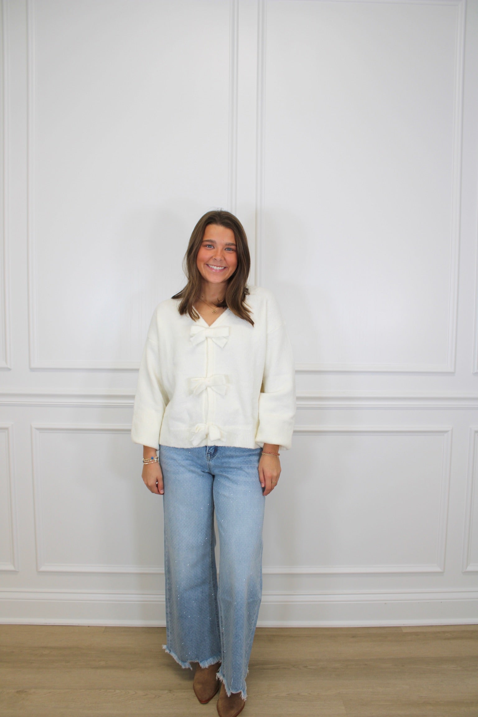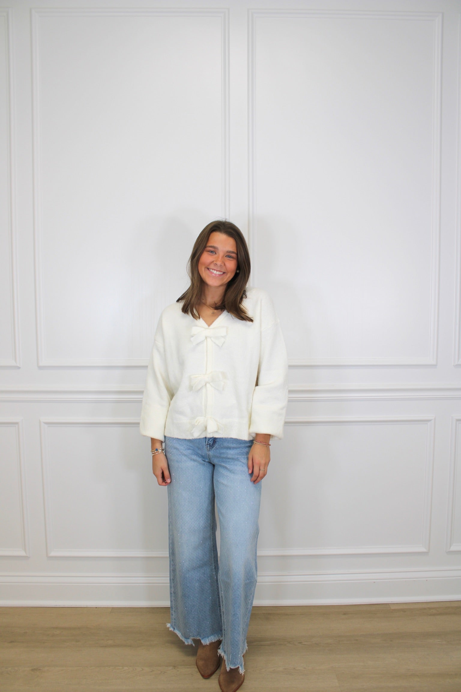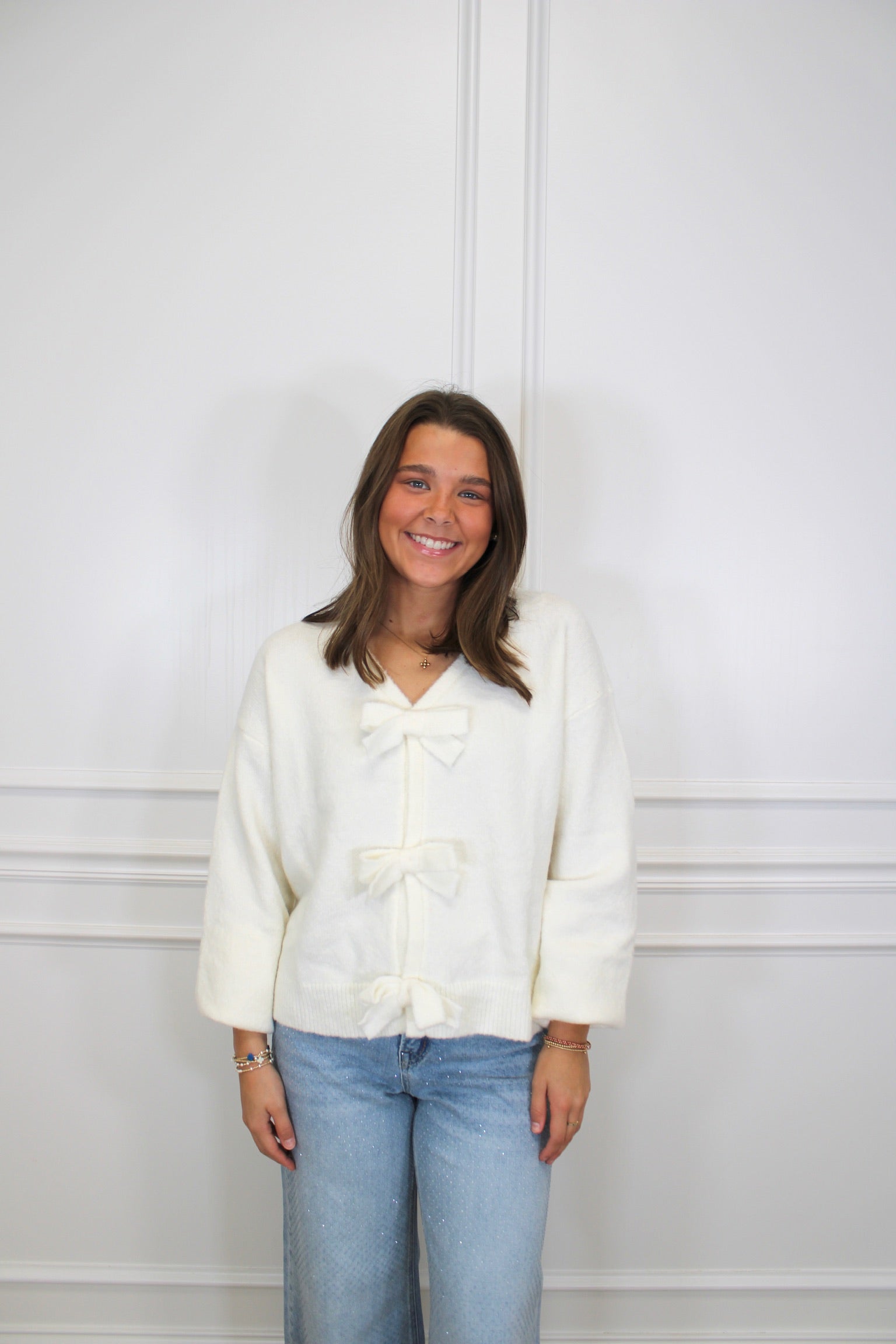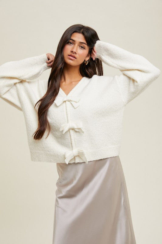 Wrap yourself in cozy charm with the Bow Dreams Cardigan. This ultra-soft sweater features a flattering V-neck and an oversized fit for maximum comfort. Delightful bows cascade down the front, lending a whimsical, cardigan-inspired look perfect for layering or lounging in style.
