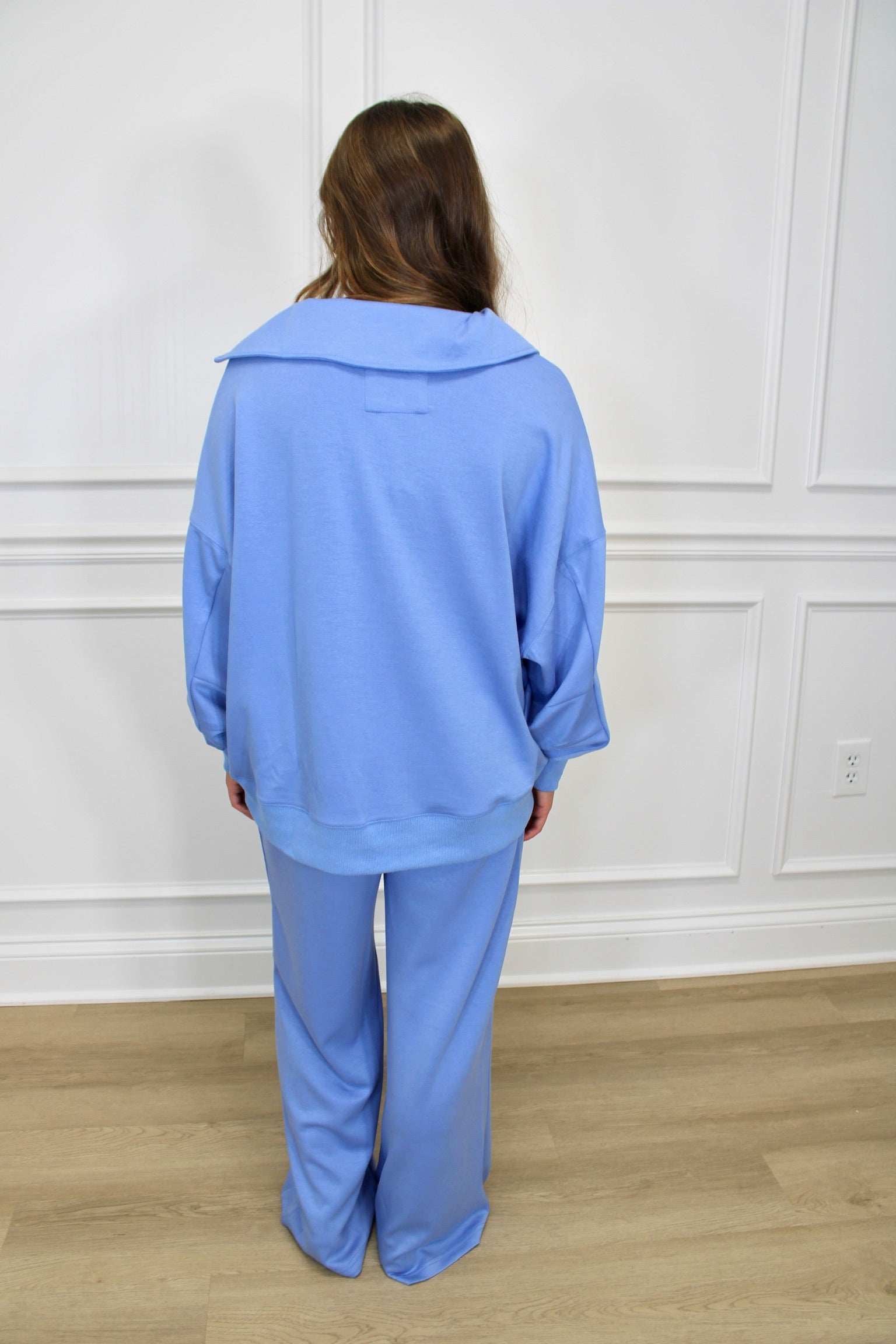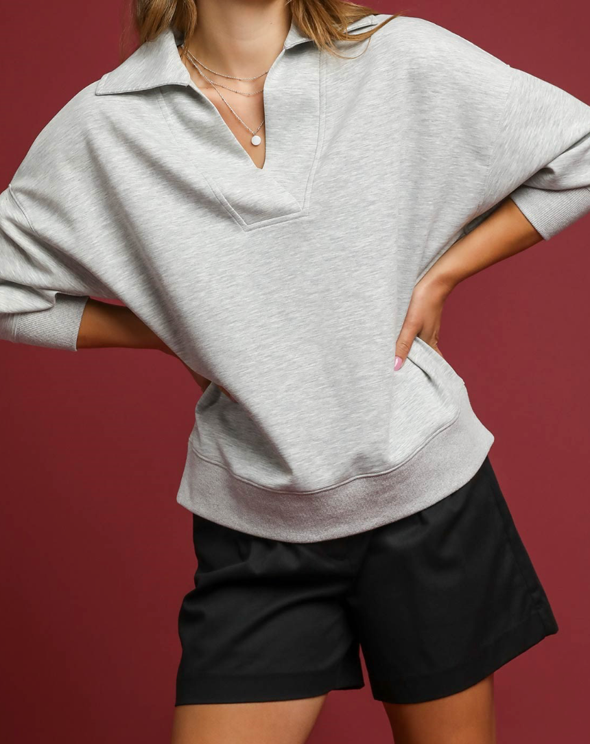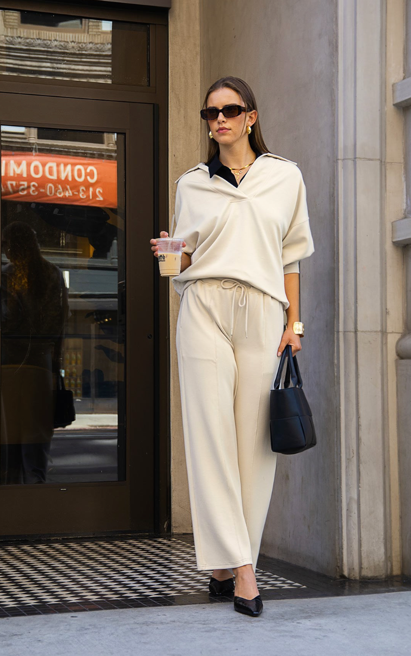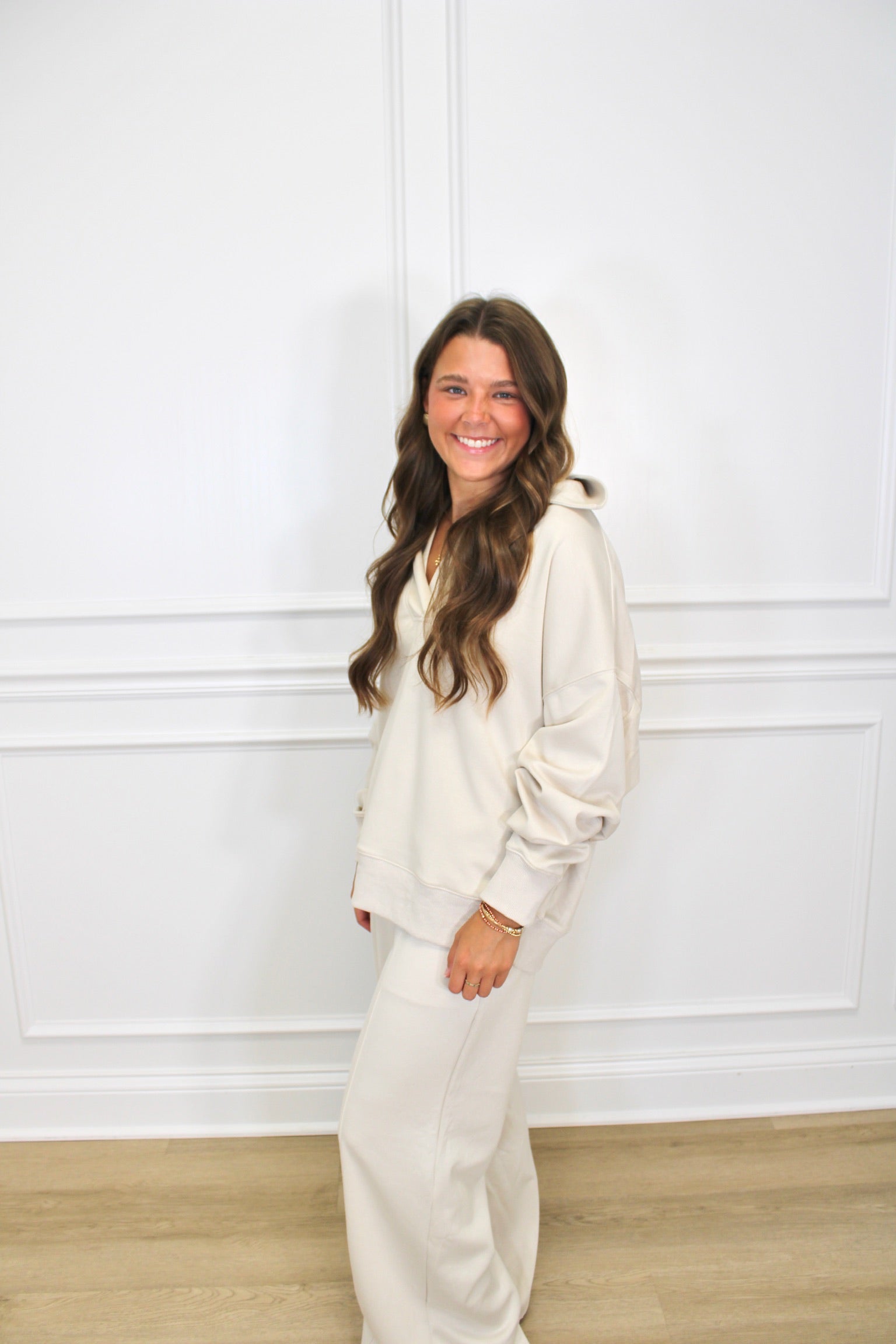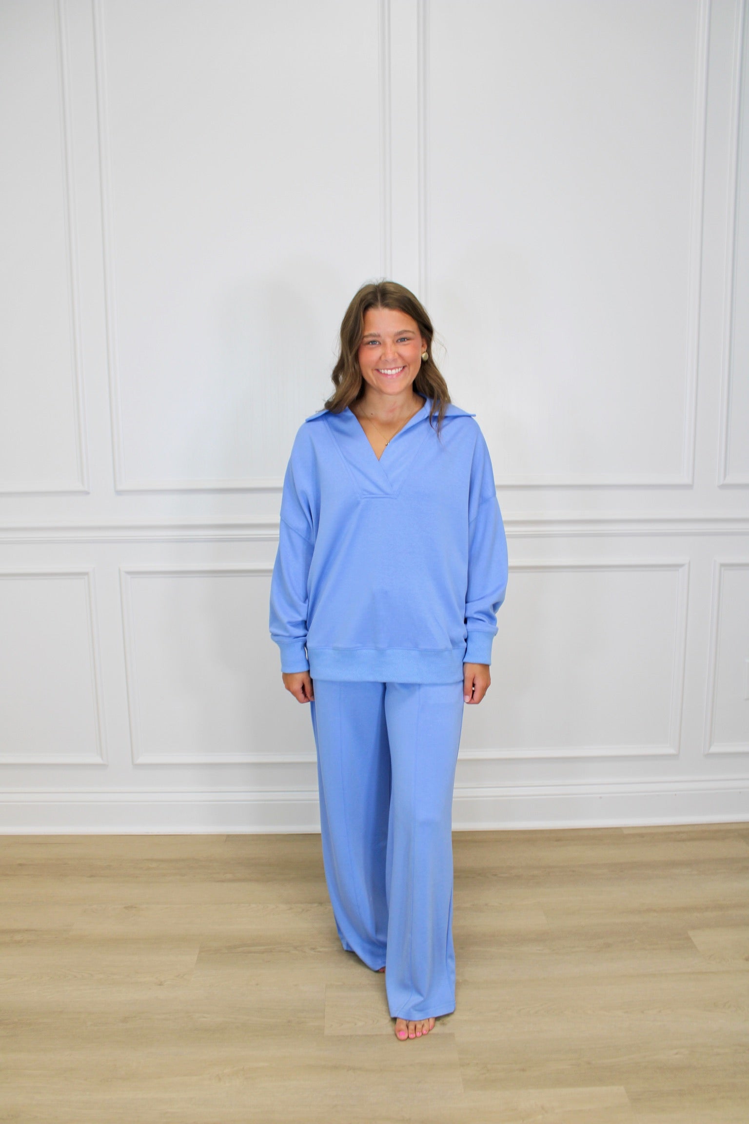 Experience effortless style with this Casual Comfort Set, featuring a fold-over collar with a playful v-neck and a relaxed slouchy fit. The ultra-soft fabric feels like a dream, while ribbed hems and cuffs add cozy detail. The wide-leg silhouette pairs perfectly with a drawstring waistband for adjustable comfort. This two-piece set is your new go-to for laid-back days with a fun twist.