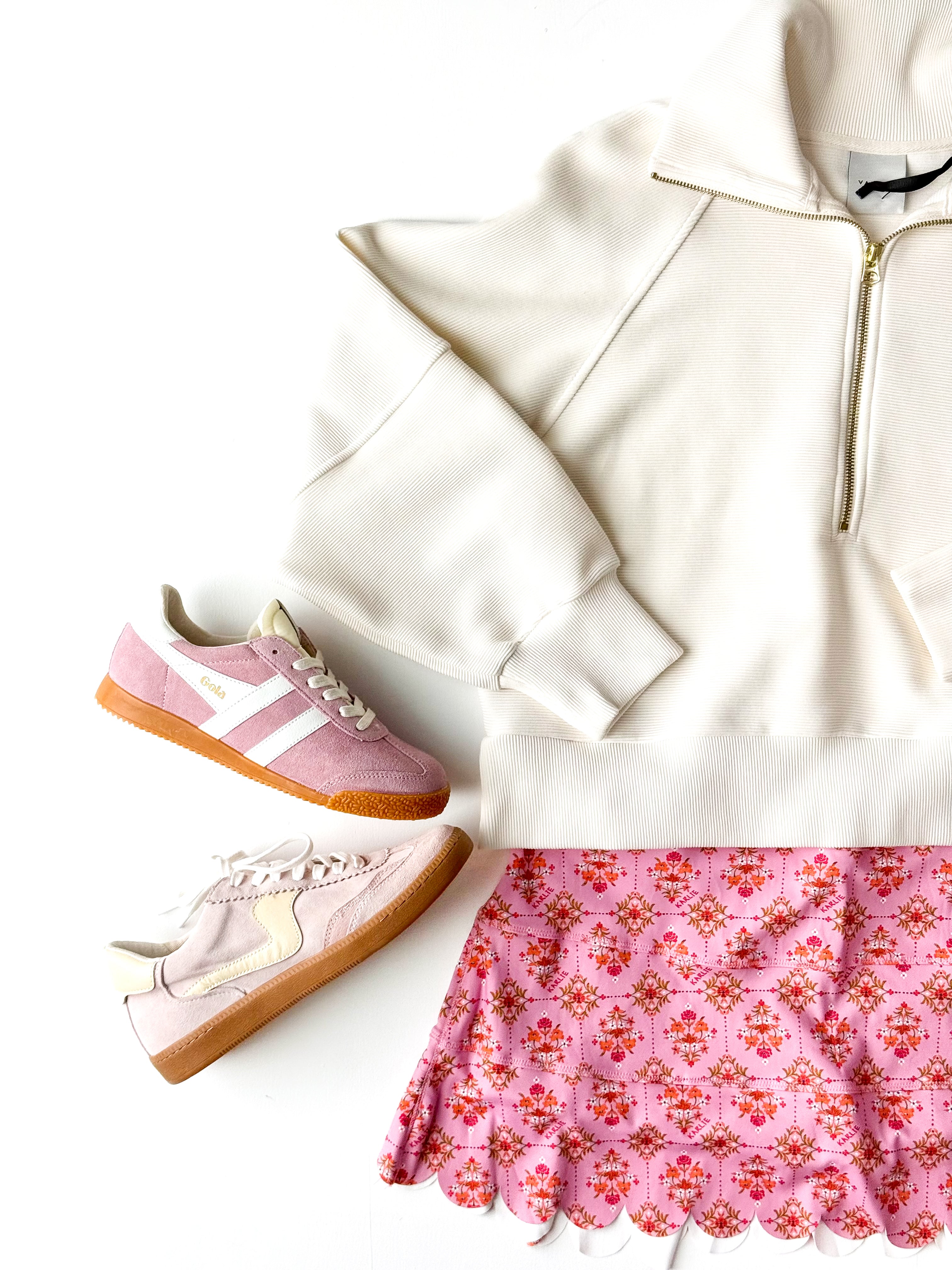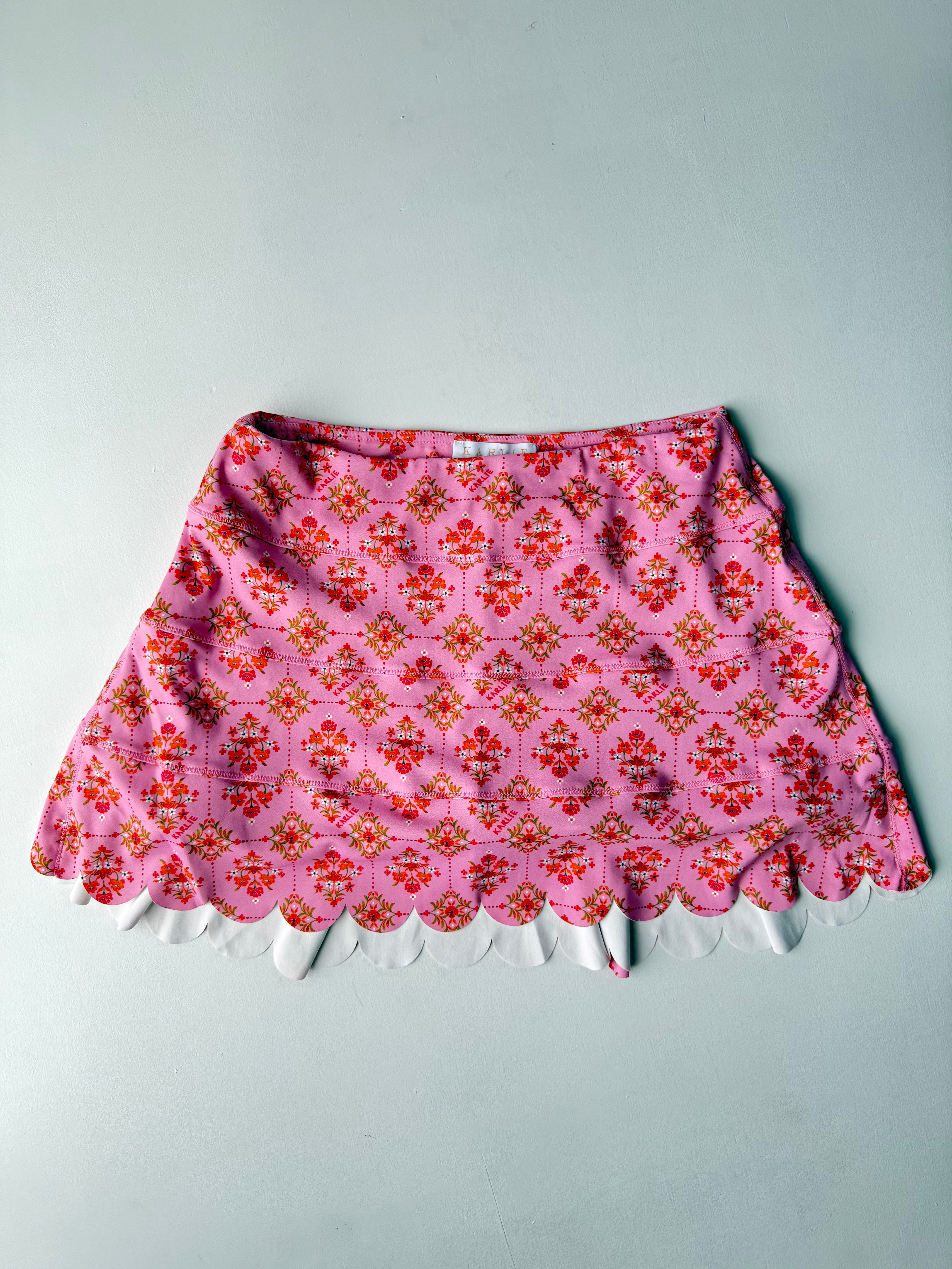Serve up style in this scalloped pink floral tennis skort that’s as fun as your game. Its flirty scalloped edges and vibrant floral print bring a playful touch to every swing, while the lightweight fabric keeps you comfy and cool on the court. Perfect for adding a splash of joy to your match or casual days alike.