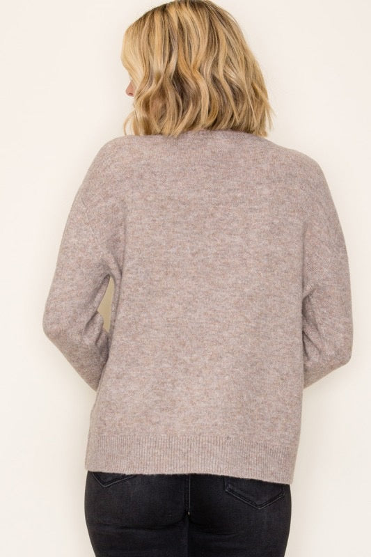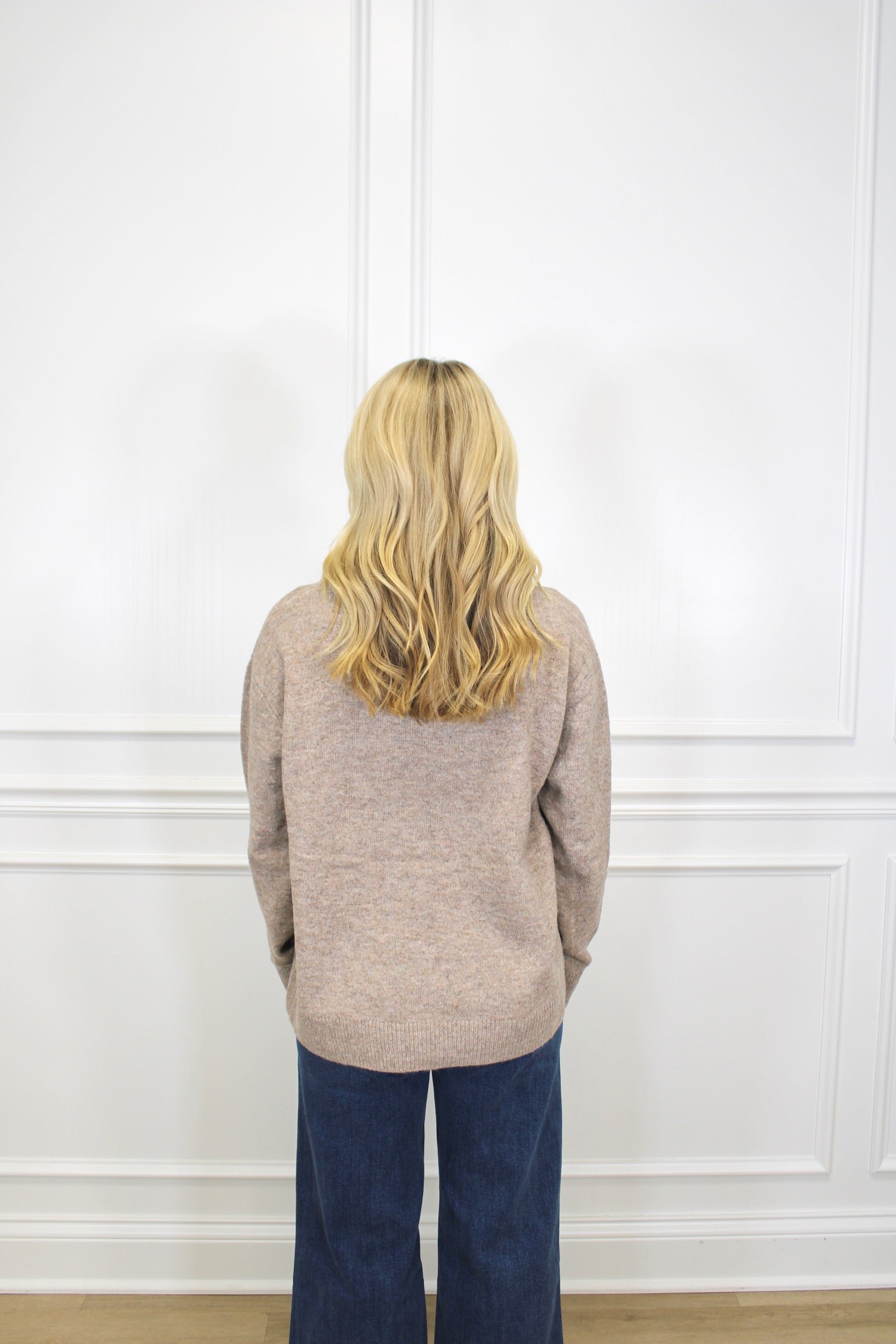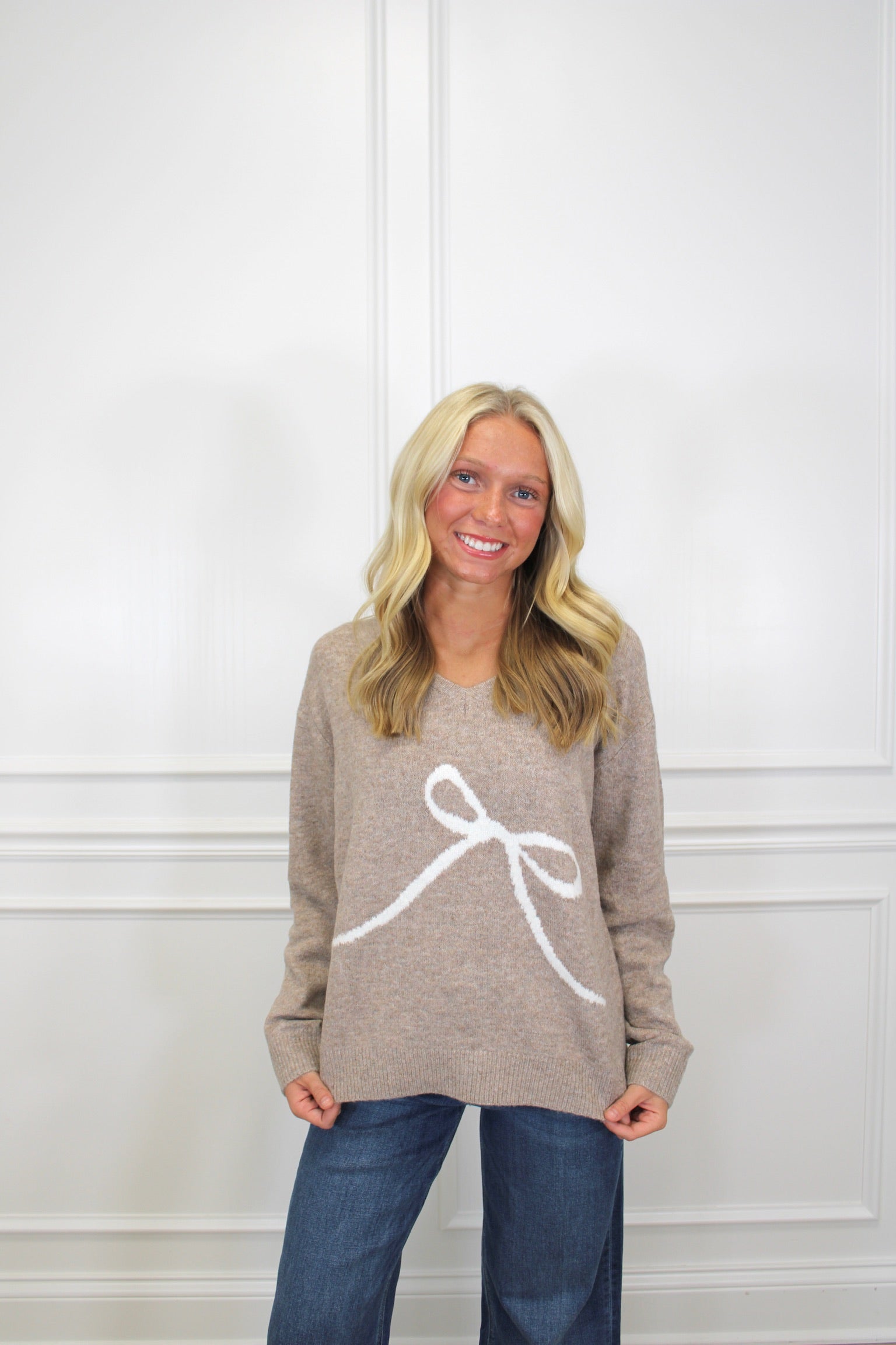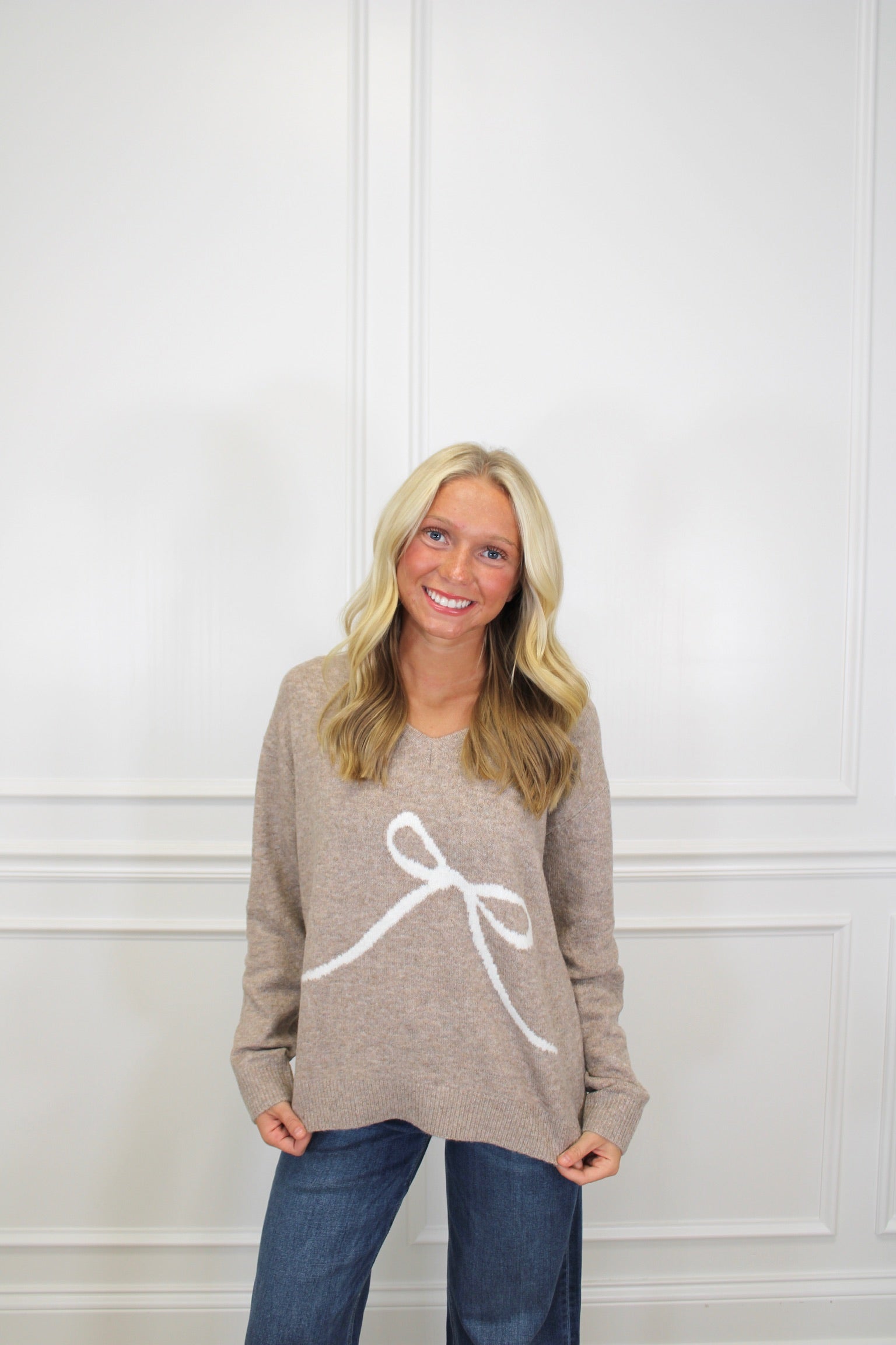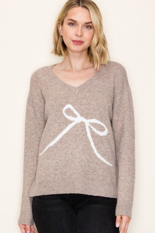 This cozy V-neck sweater adds a playful twist with its charming printed bow detail. The long sleeves keep you comfortably warm while the soft fabric invites you to stay snug all day. Perfect for layering or wearing on its own, it brings fun and flair to your everyday look.