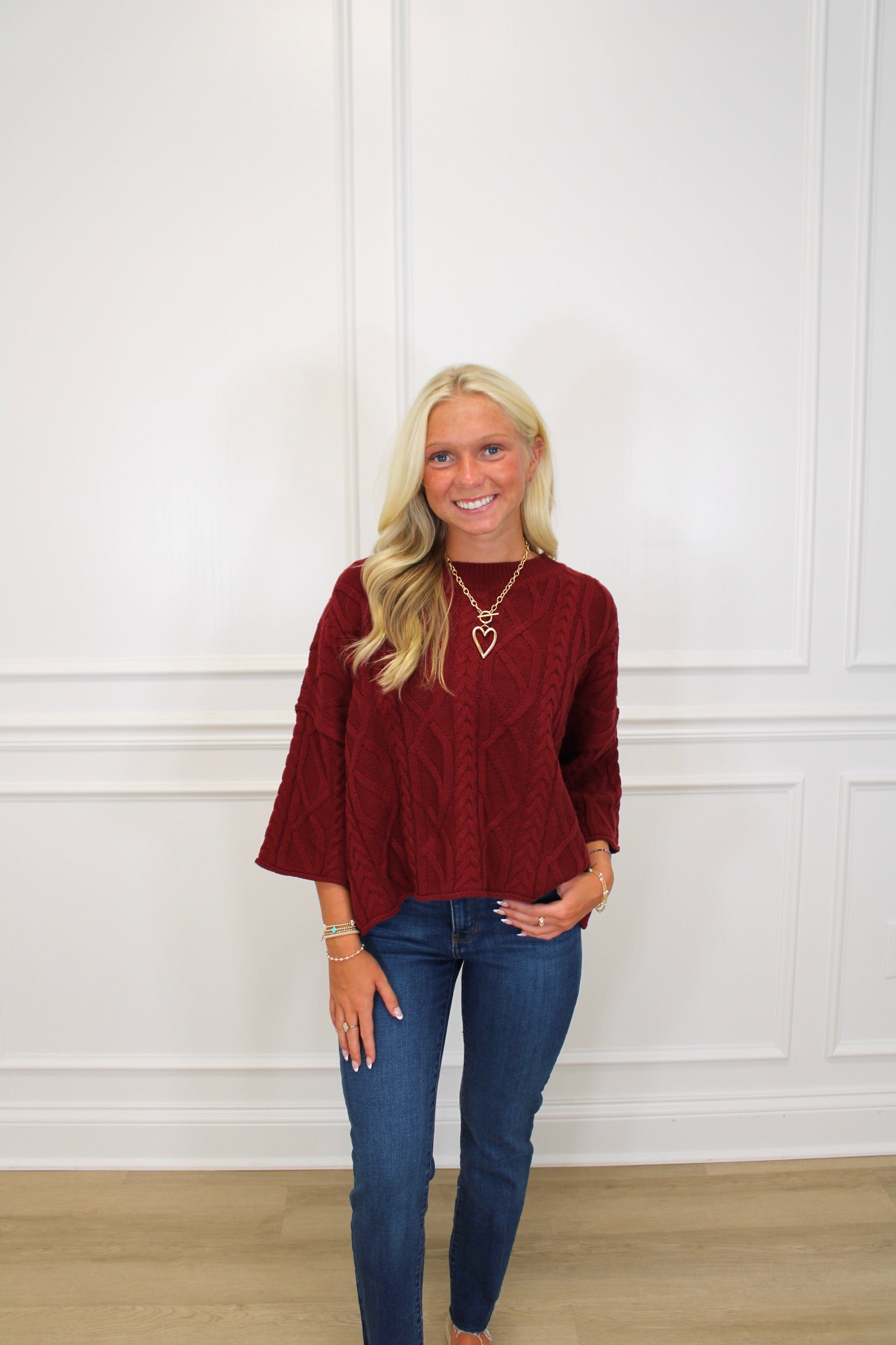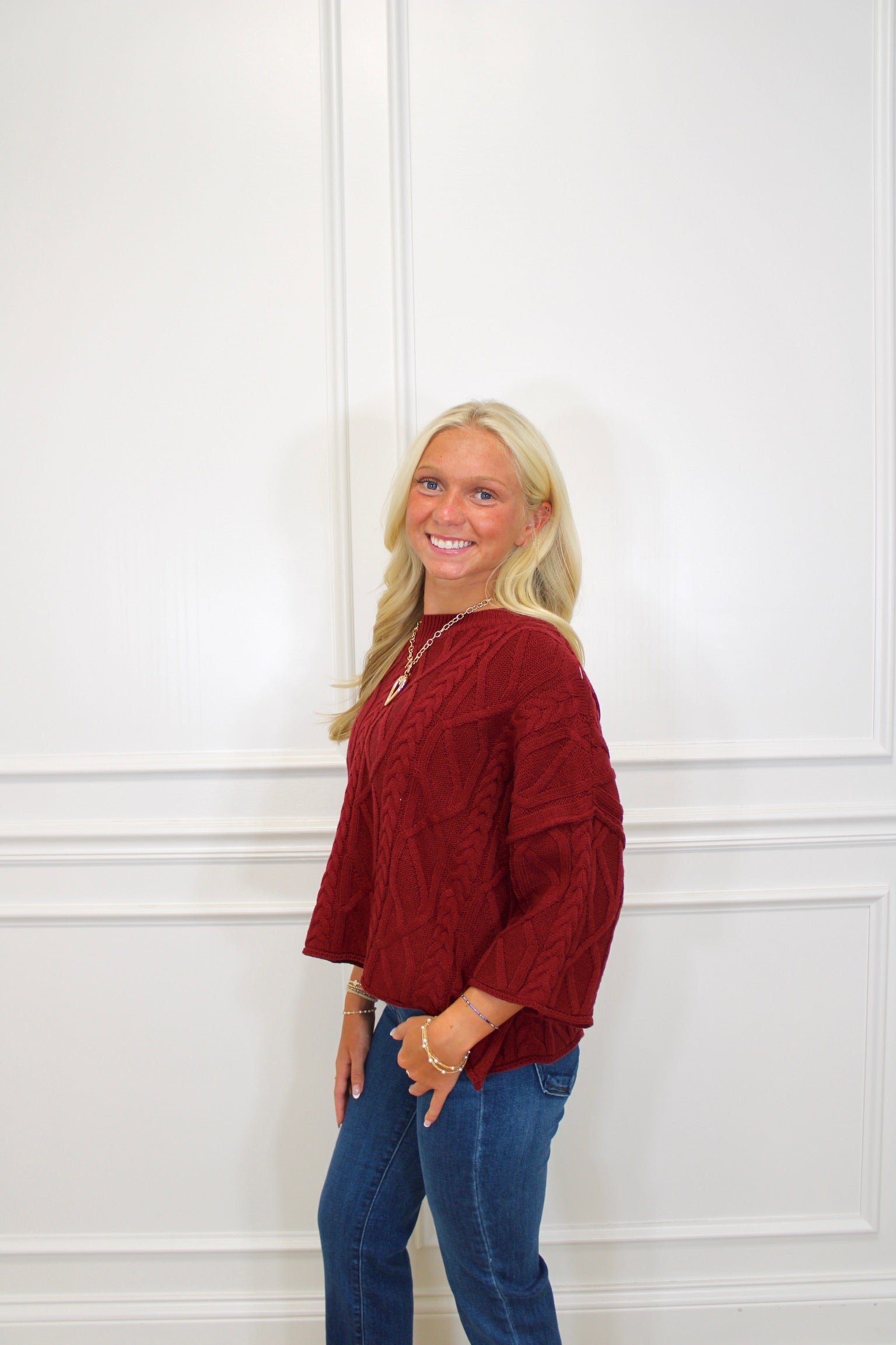 This cozy ¾ sleeve pullover is your new go-to for effortless style. Crafted from lightweight, solid sweater knit, it’s soft and breathable without being sheer. Perfect for layering or wearing on its own, this unlined top adds a playful touch to any outfit while keeping you comfy all day long.