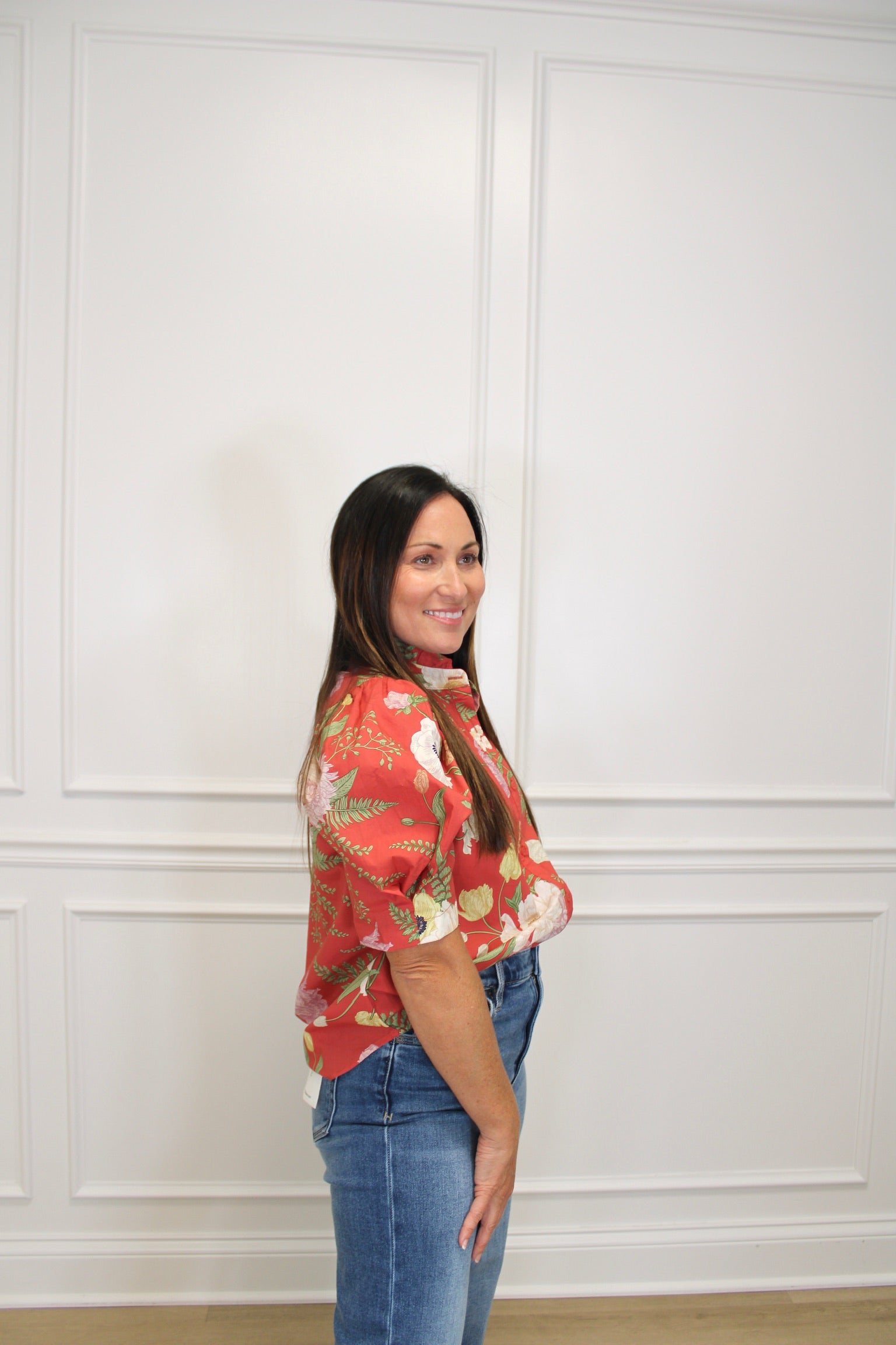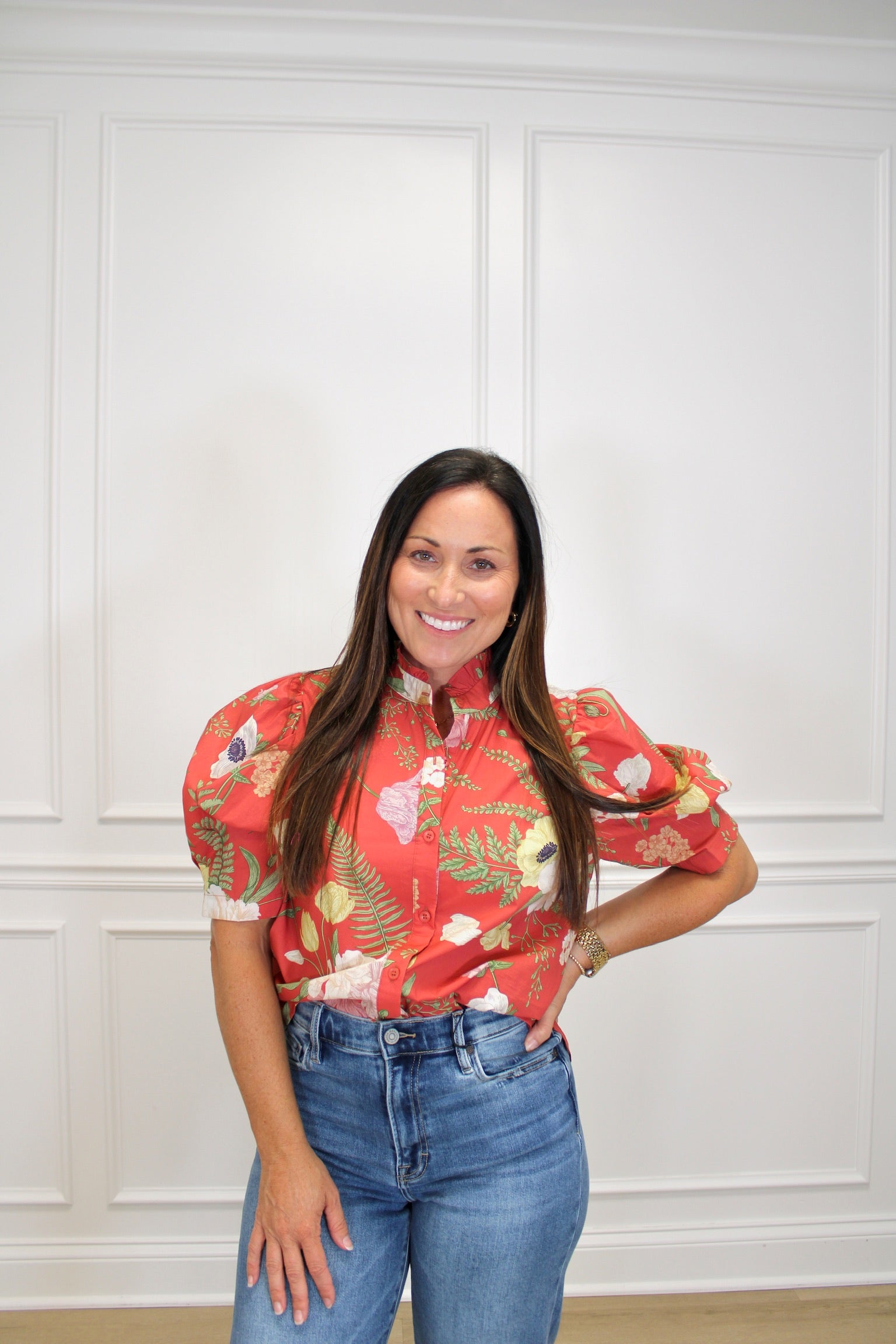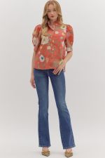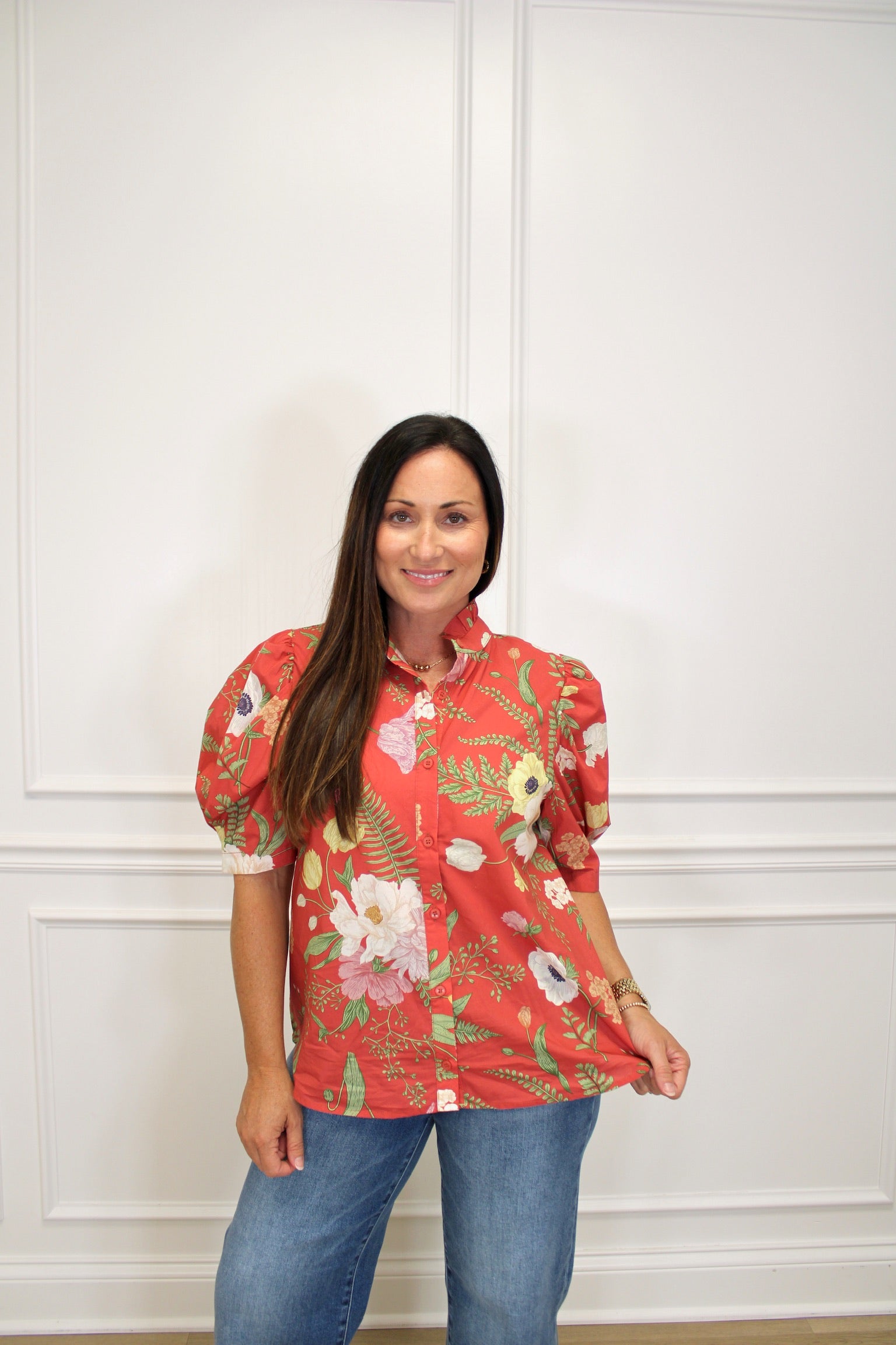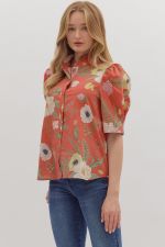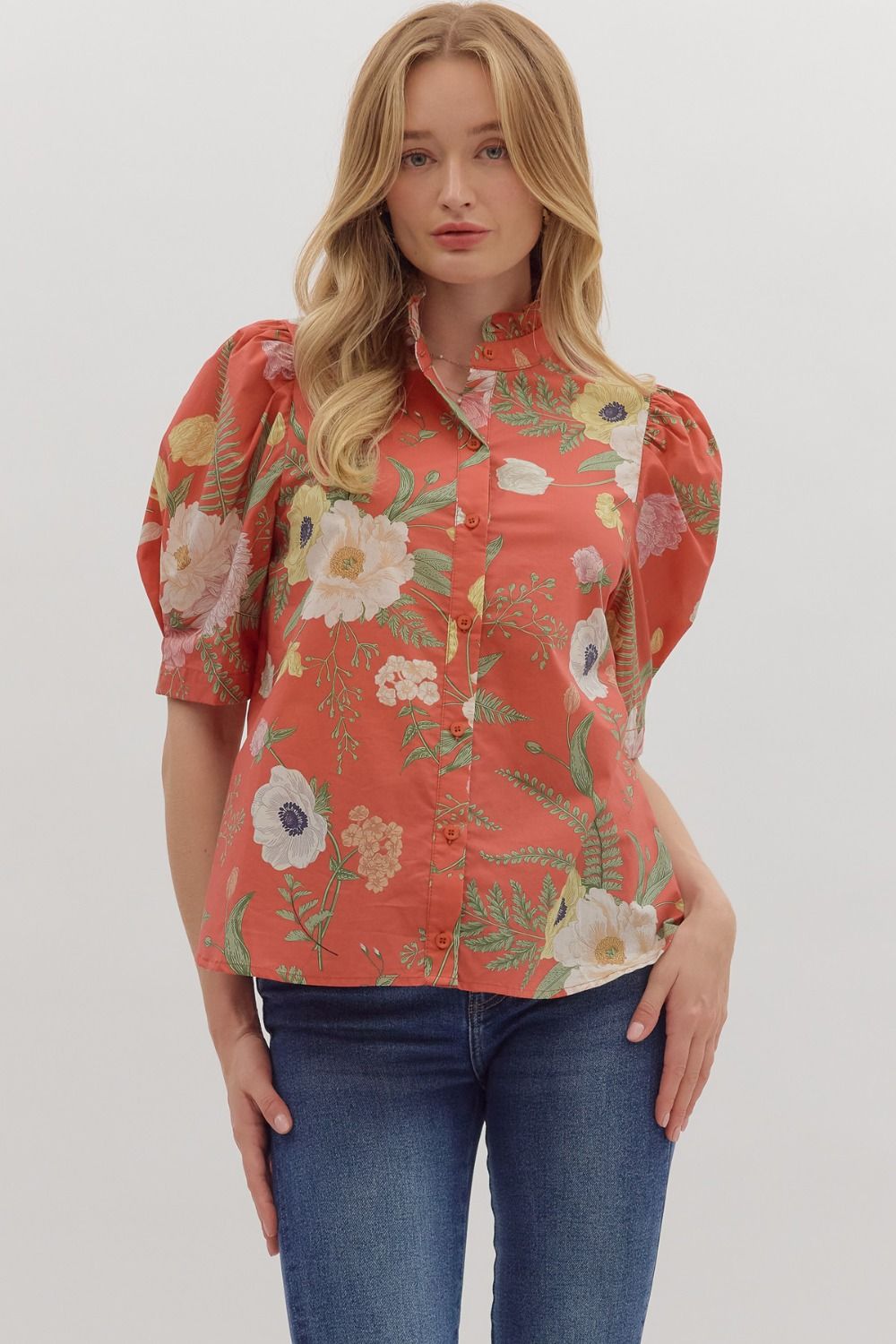 Brighten your wardrobe with the Sunbeam Floral Blouse in a charming dark peach hue. Featuring delicate puff sleeves and a classic button-front design, this blouse adds a flirty twist to any outfit. Perfect for sunny days or casual evenings, it’s a playful way to embrace floral style with ease and comfort.