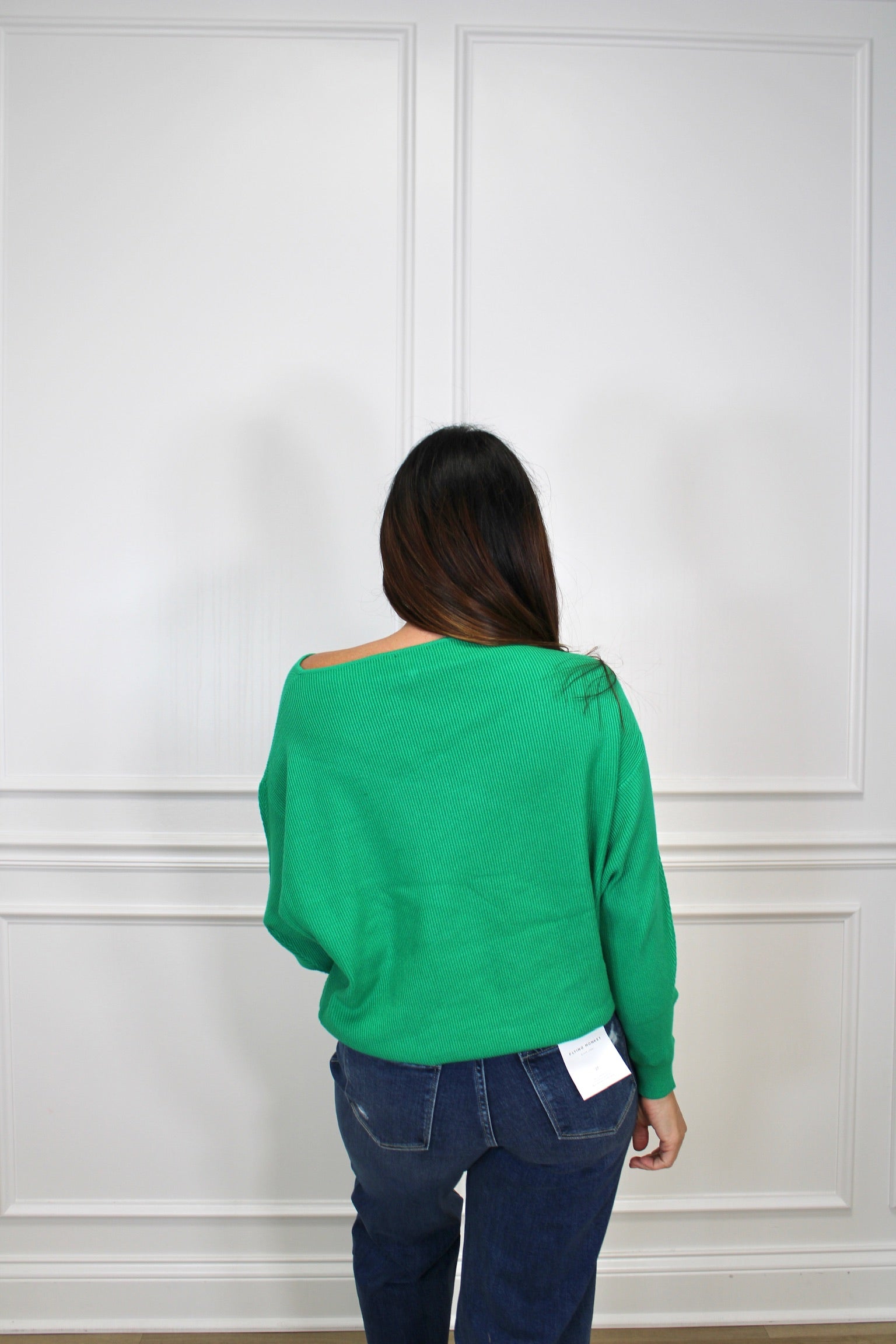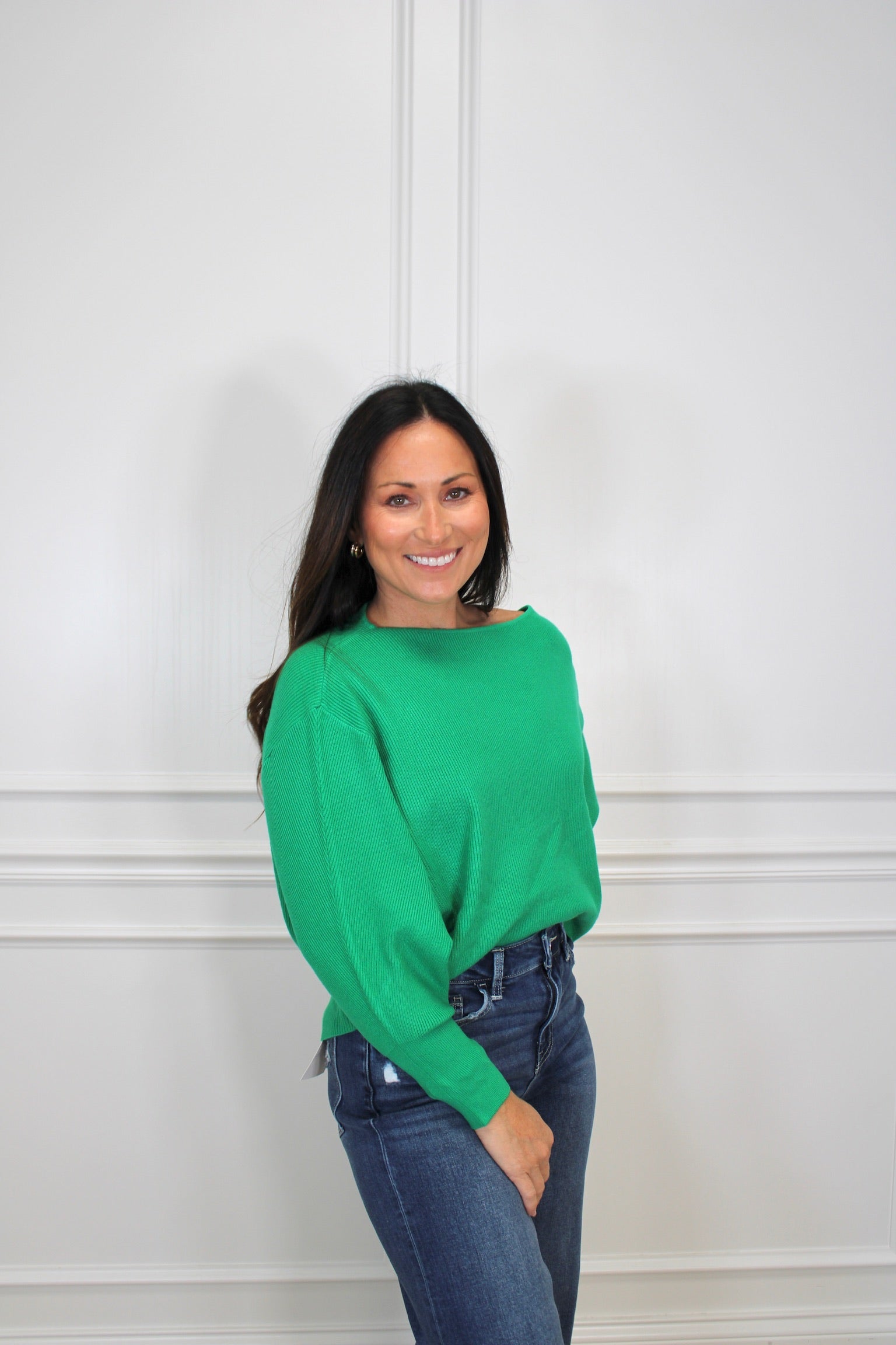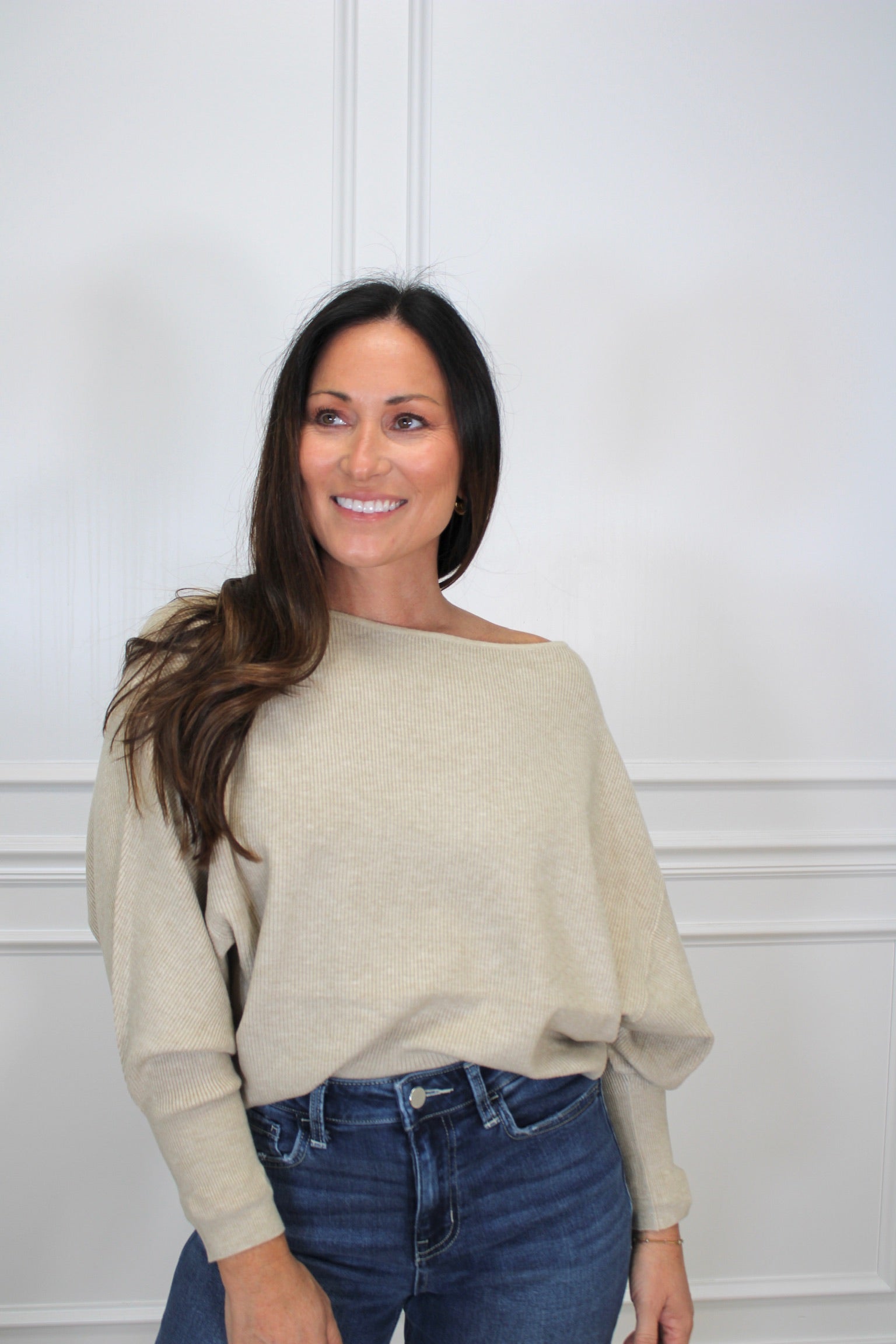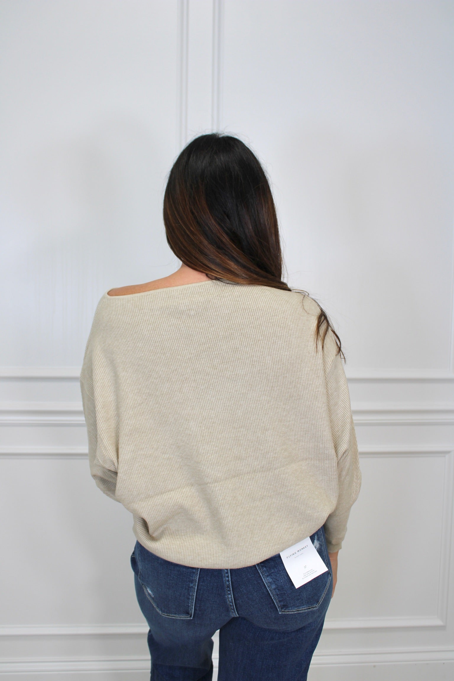 Loose fitted boat neck top in fine rib stitch with long dolman sleeves