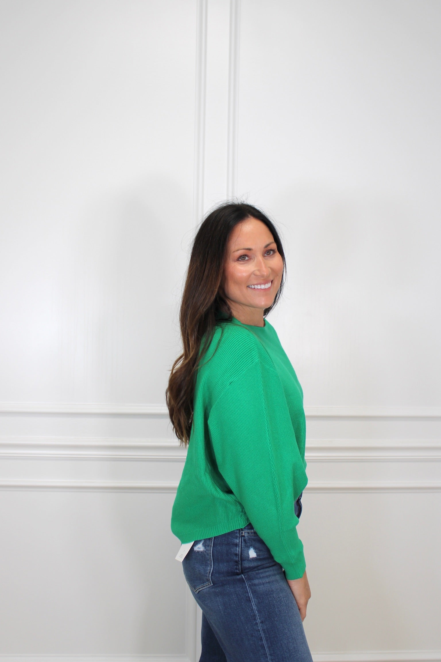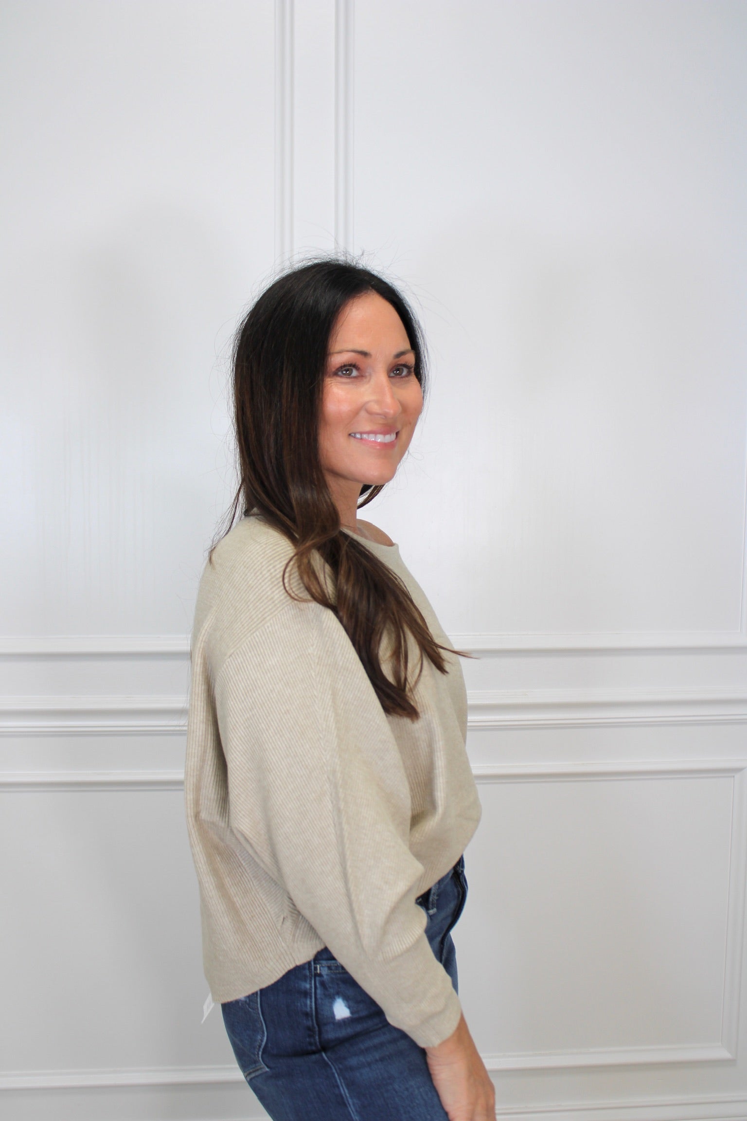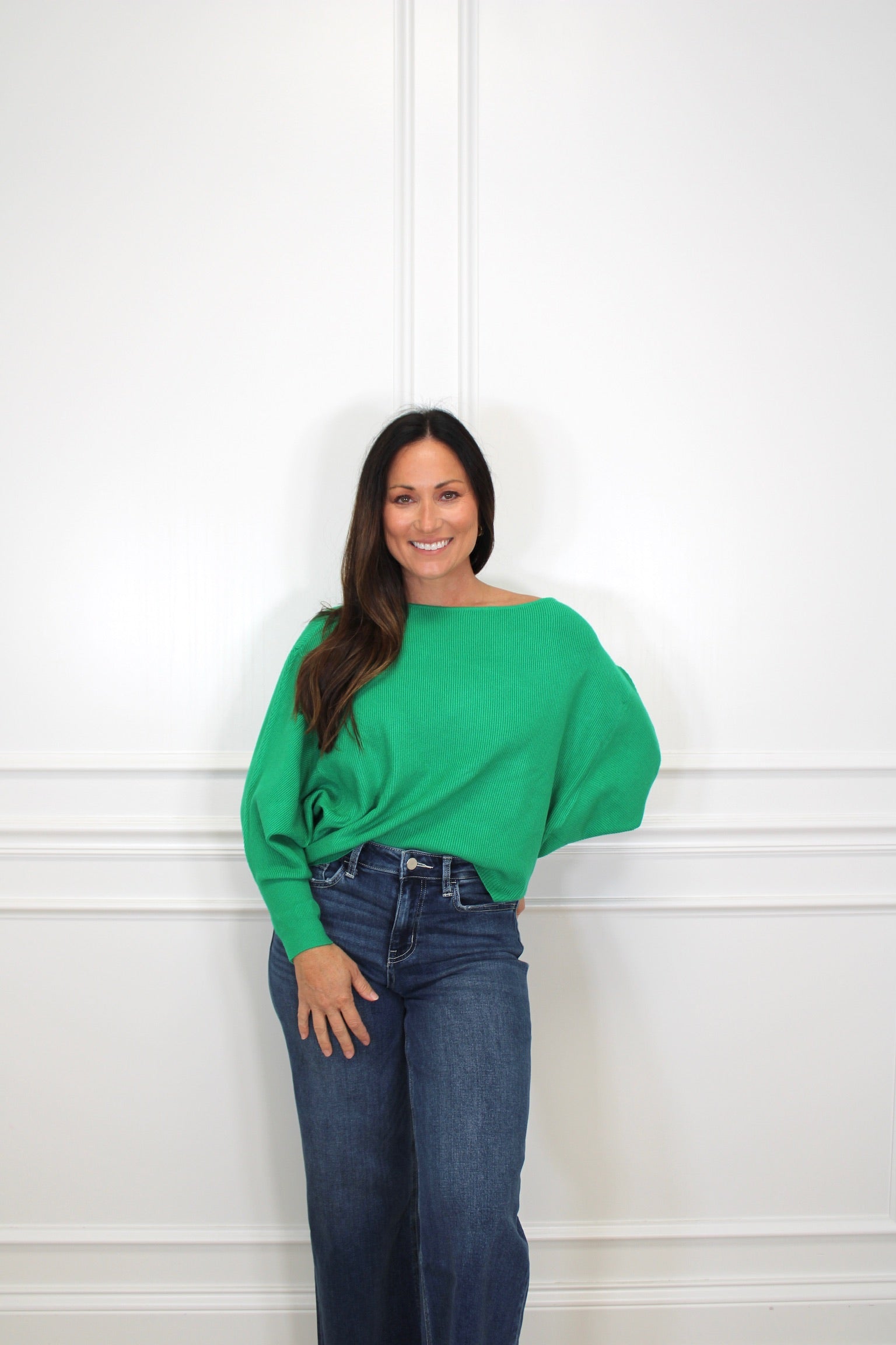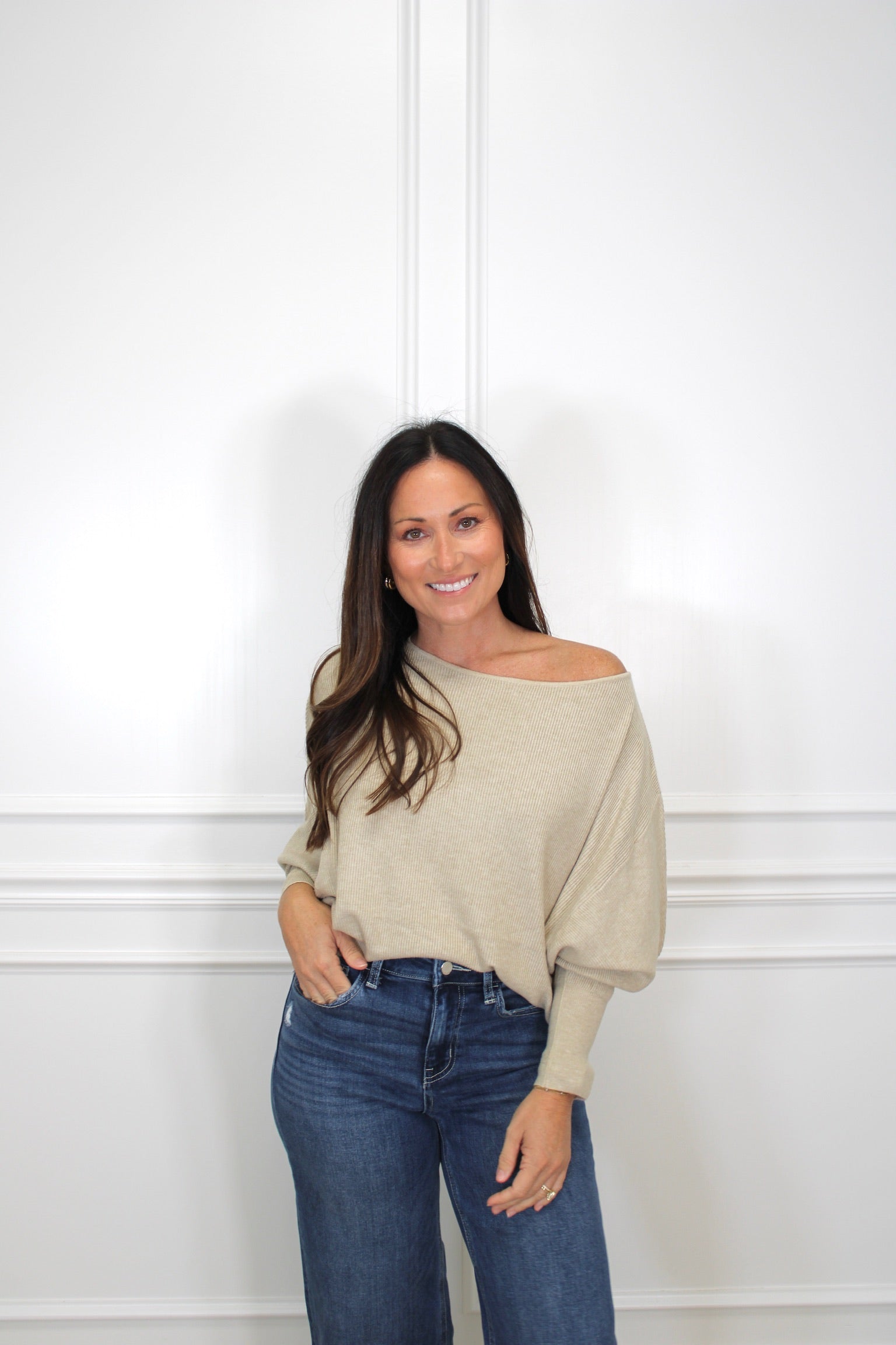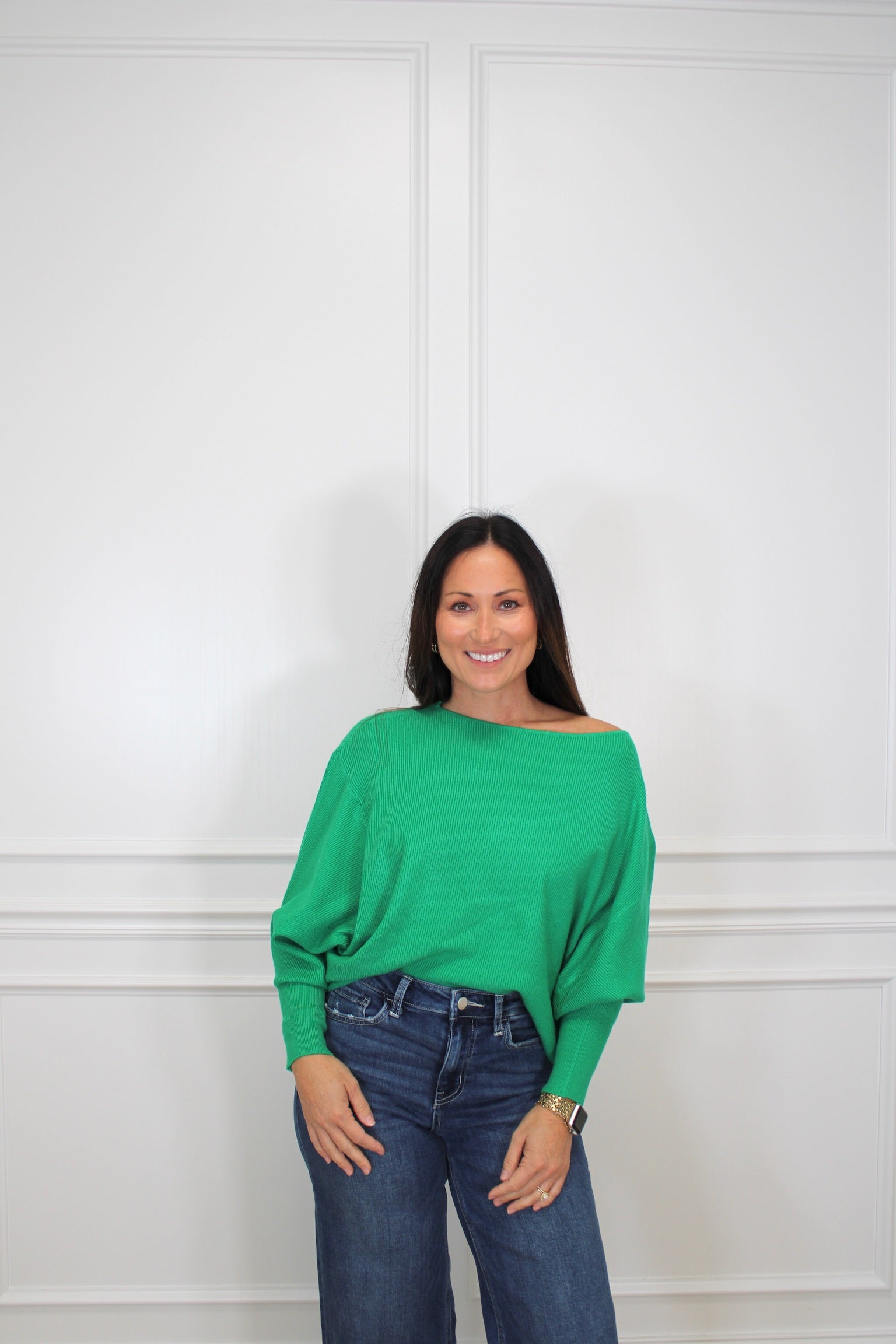 Loose fitted boat neck top in fine rib stitch with long dolman sleeves
