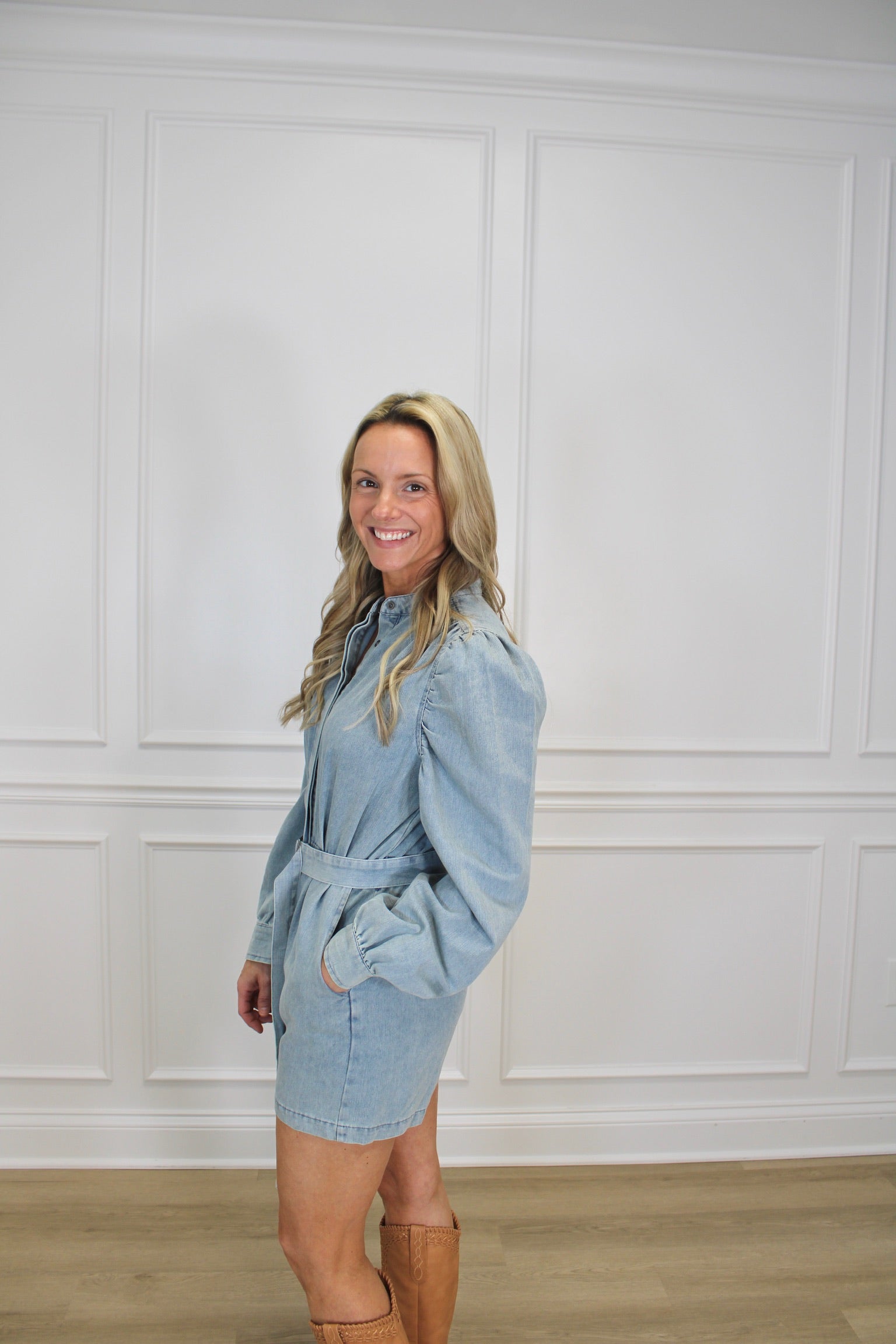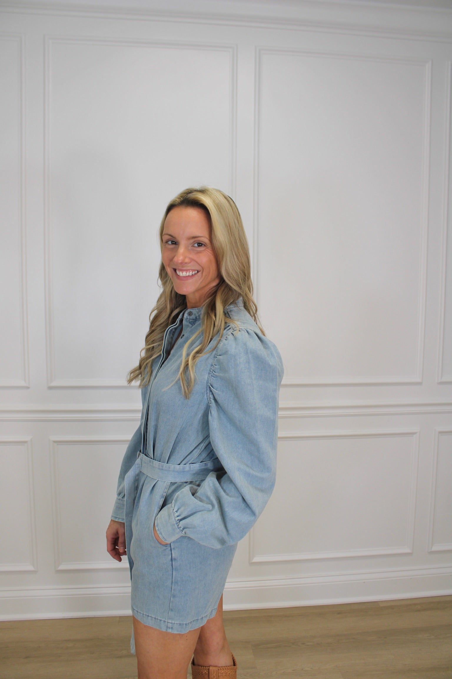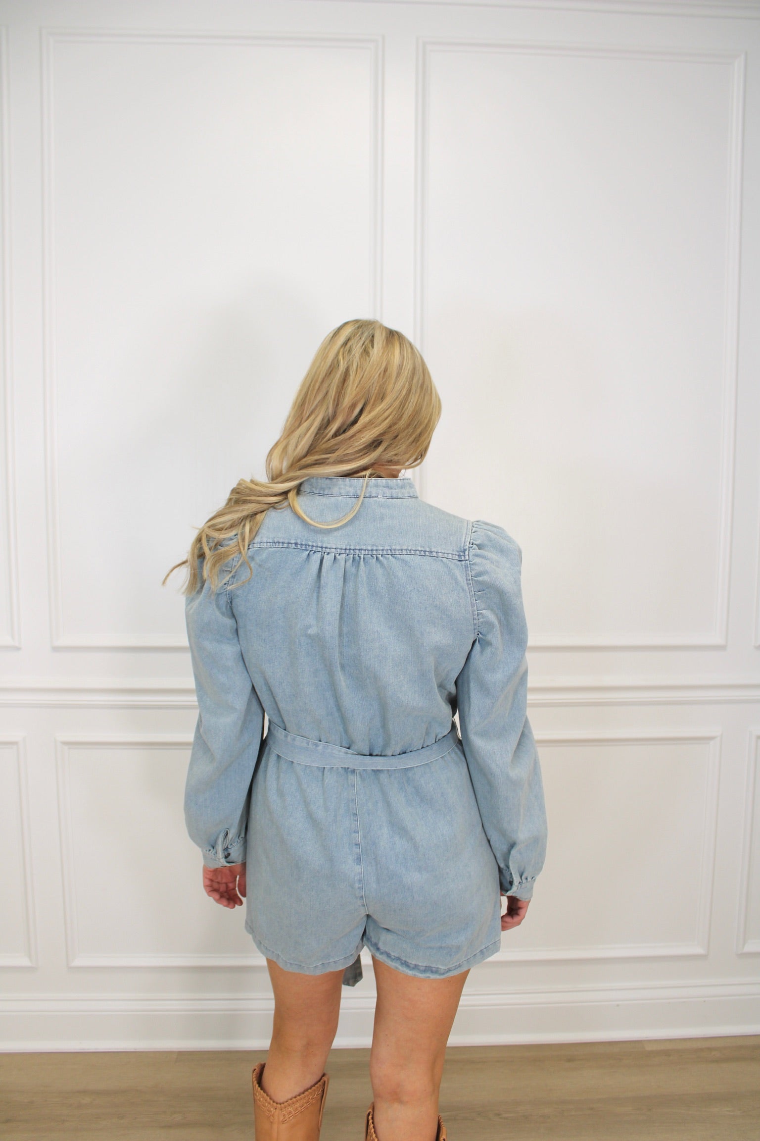 Step out in style with this playful ready-to-go denim romper, complete with a flattering belt and breezy sleeves. Perfect for sunny days or casual outings, it combines comfort and a fun, flirty vibe that makes getting dressed easy and effortless.