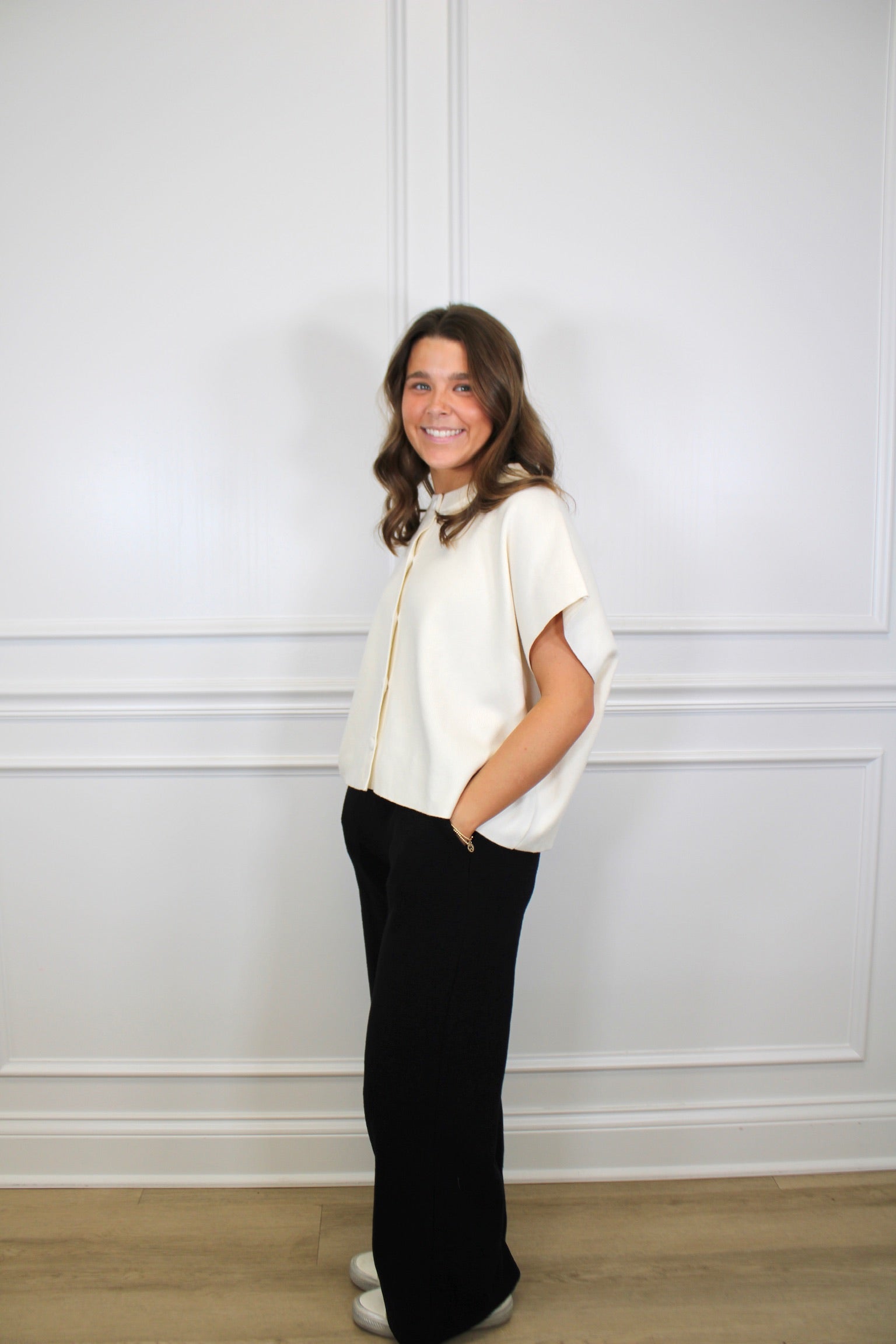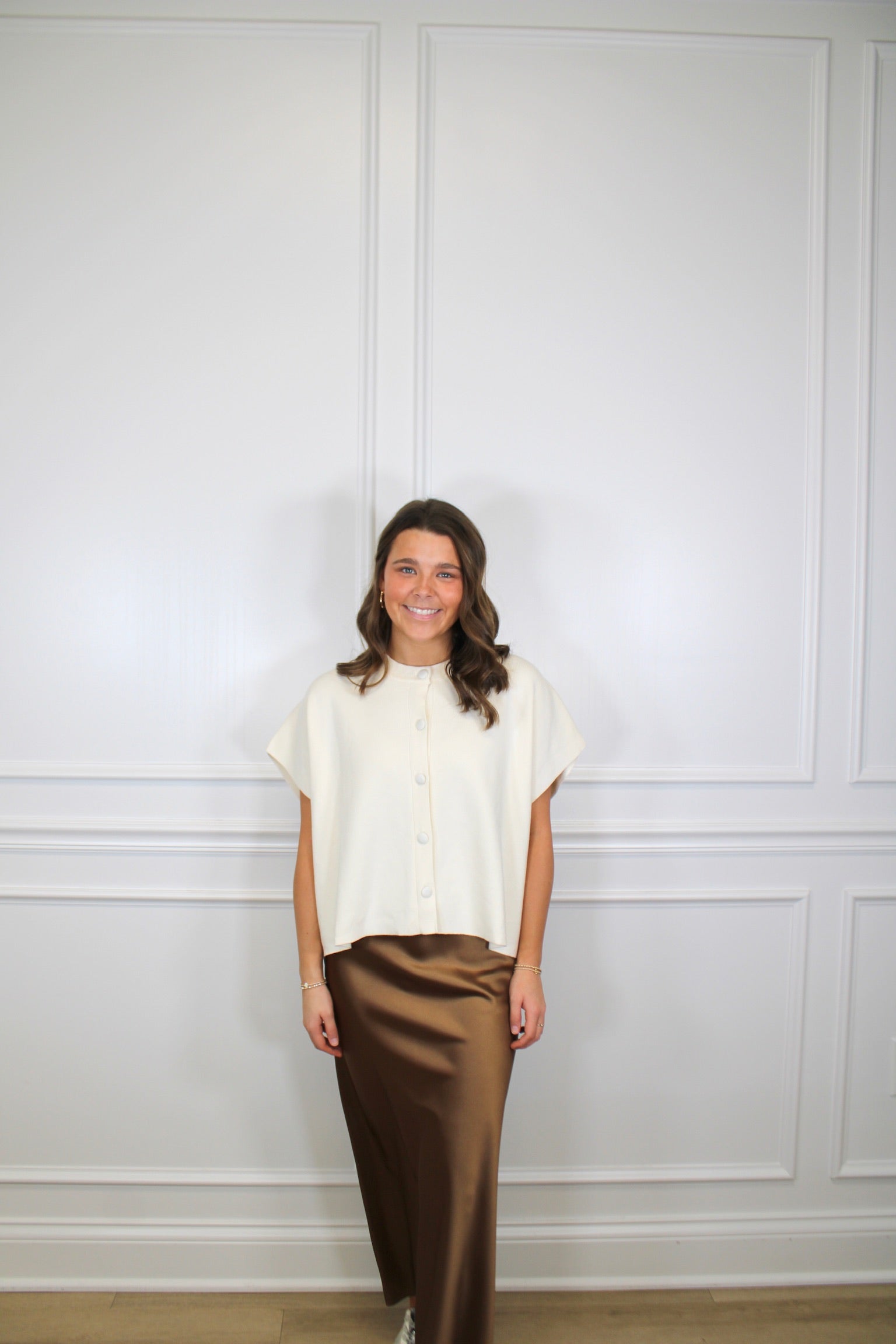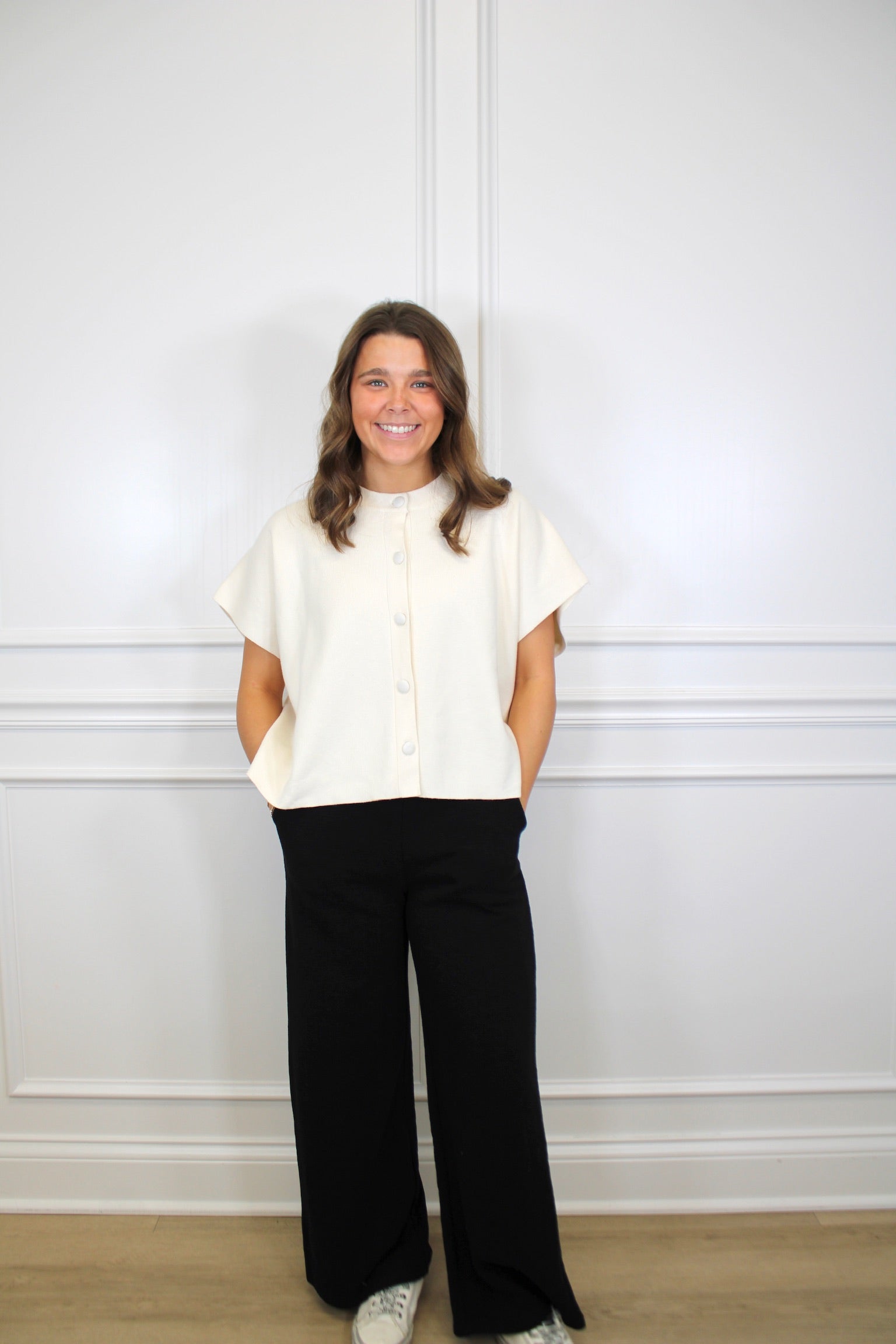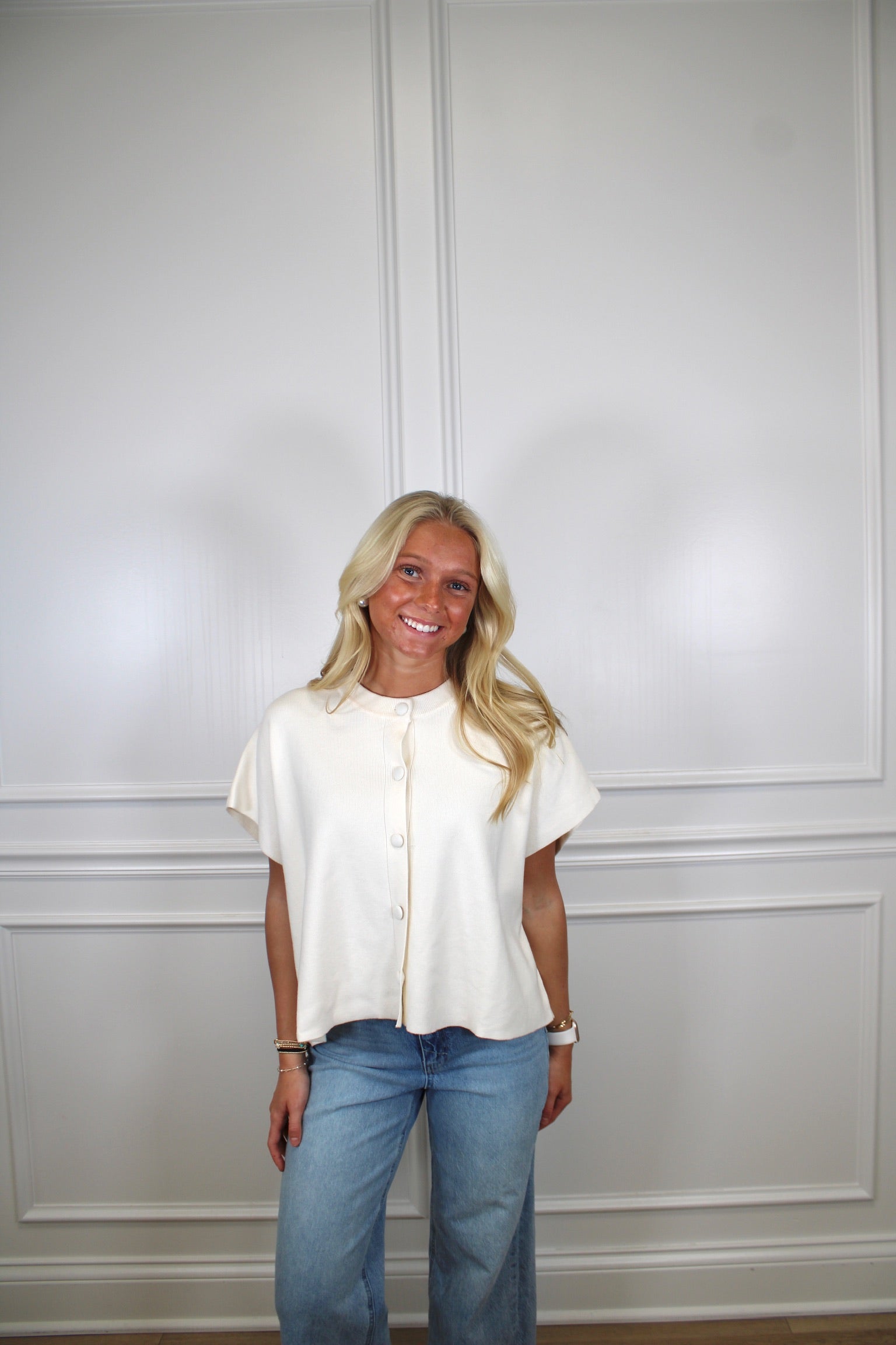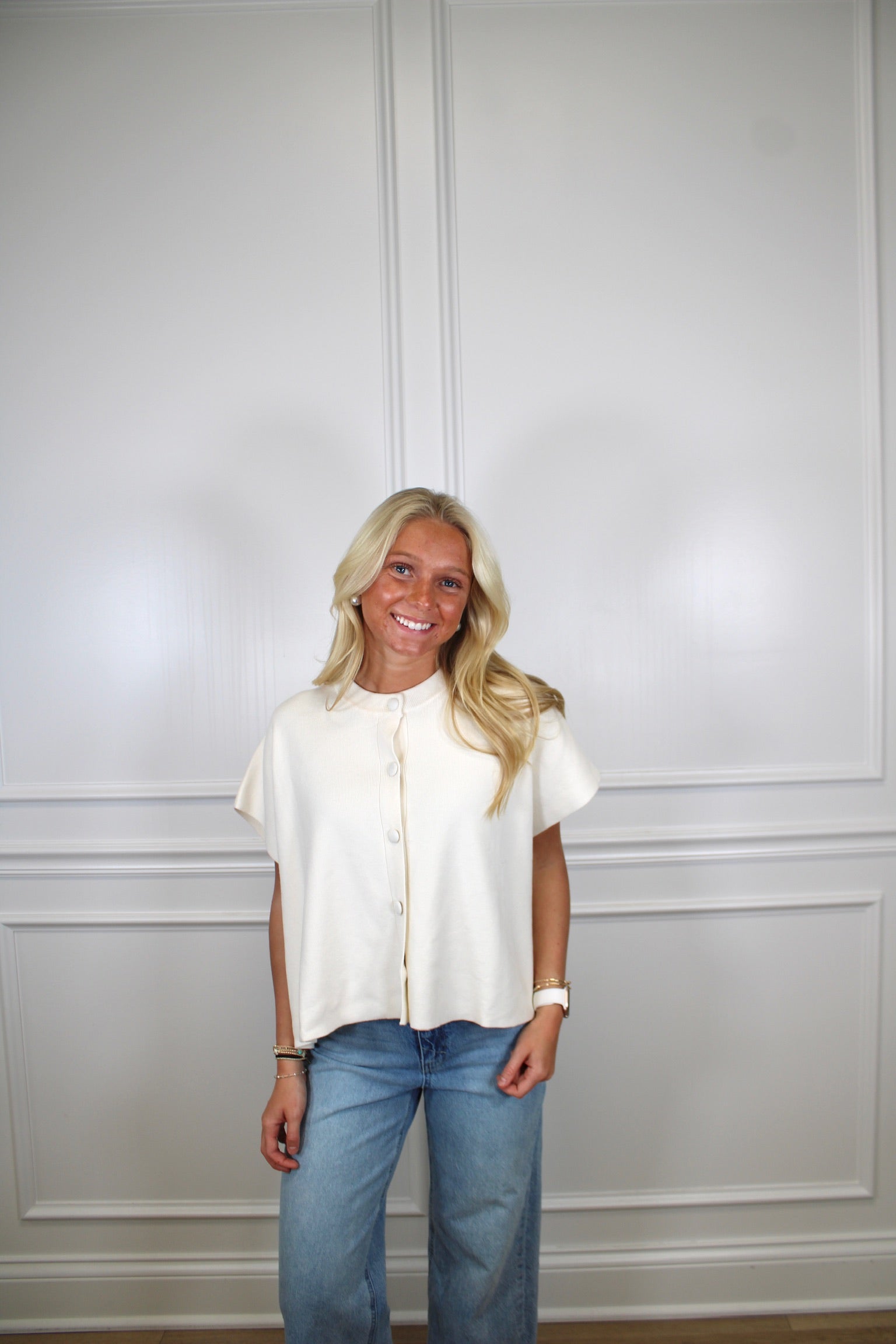 Layer up with effortless charm in this button-down cap sleeve sweater. The cropped sleeves add a modern twist, while the front buttons let you customize your look—button it up for polished elegance or leave it open for relaxed vibes. Soft, versatile, and ready to become your new favorite piece for any season. Perfect for pairing with everything in your closet.