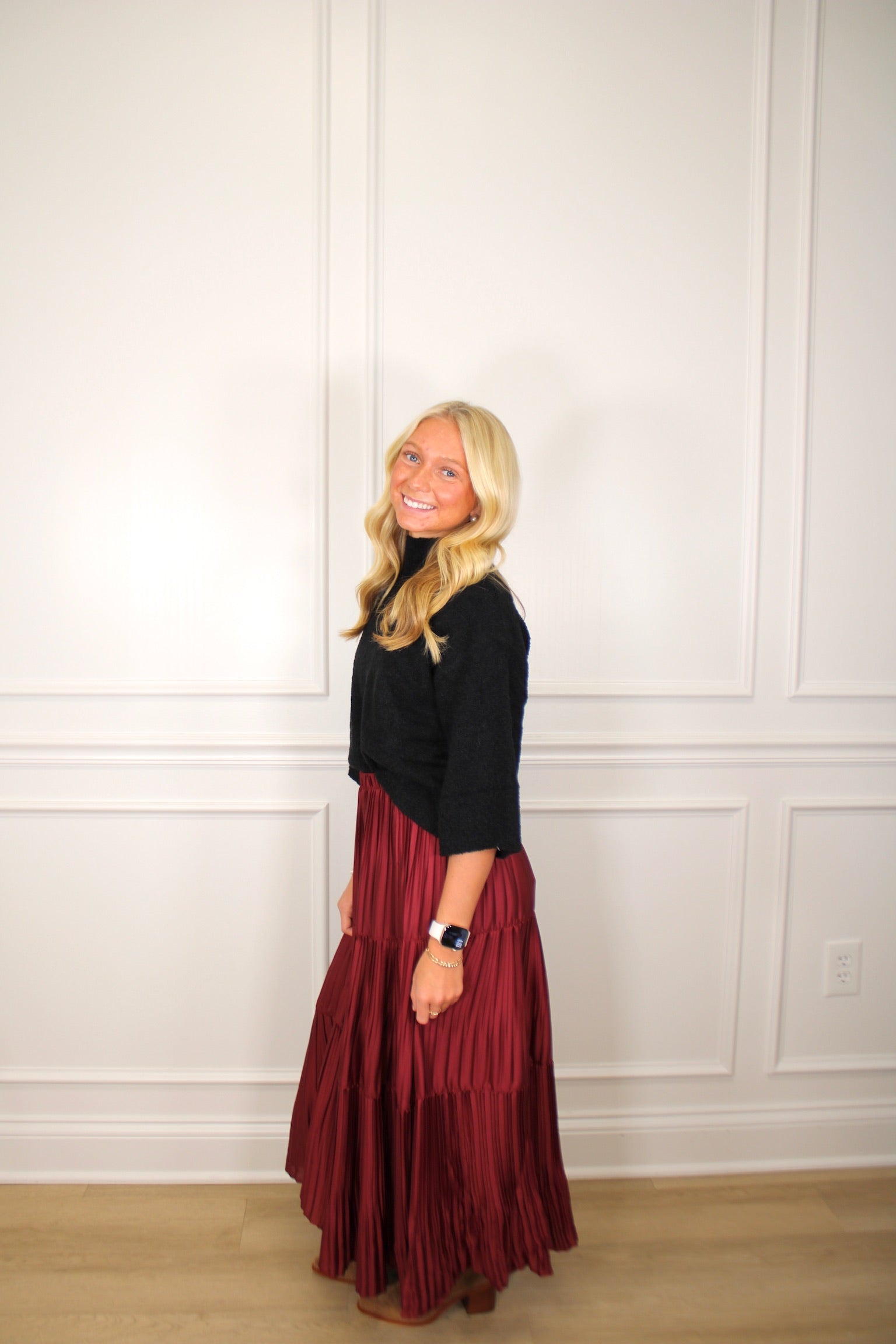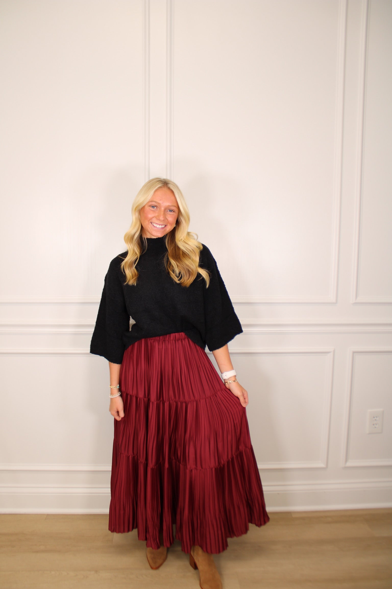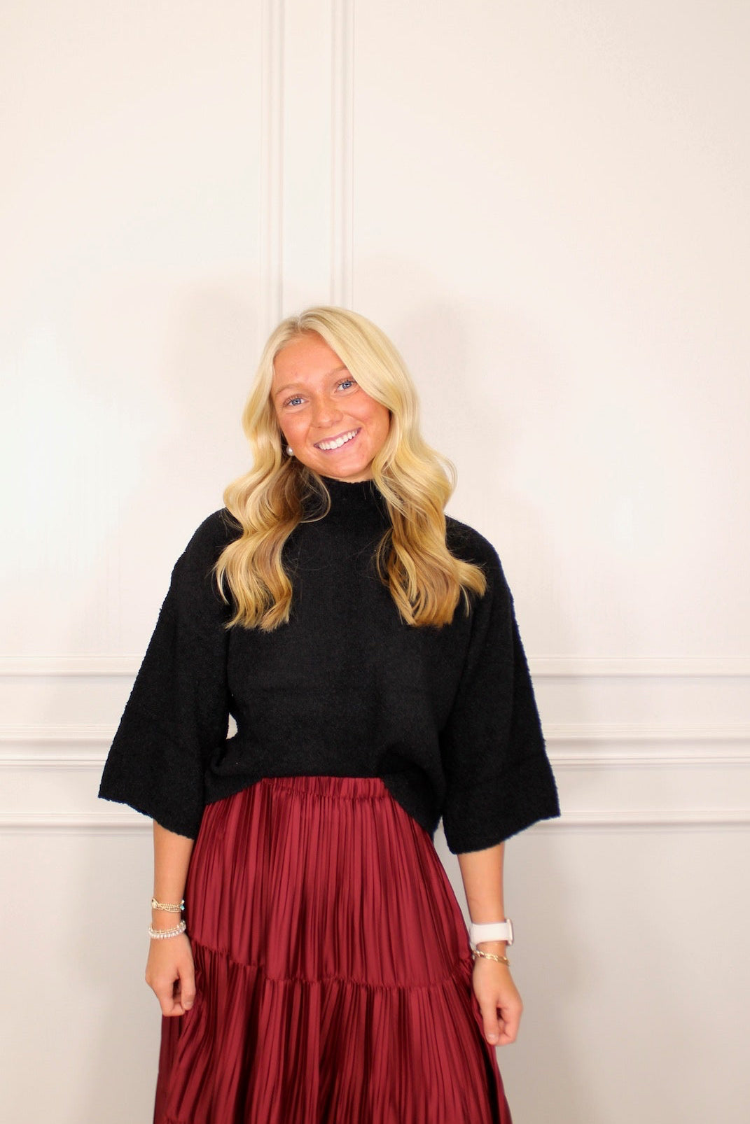 Cozy up in this charming boucle sweater knit top, featuring a chic 3/4 sleeve design and mock neck for effortless style. Crafted from a medium-weight knit fabric, it's perfectly structured without being sheer, making it ideal for layering or wearing solo. The unlined construction keeps things light and breathable, while the textured boucle weave adds visual interest to your everyday wardrobe. A playful staple that transitions seamlessly from casual coffee dates to weekend adventures.