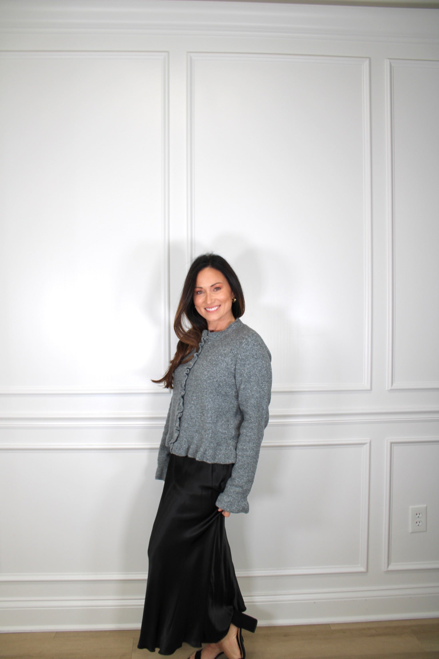 Add a touch of playfulness to your wardrobe with our French Grey Frill-Front Cardigan. This quirky and stylish piece features a delicate frill detail that effortlessly elevates any outfit. Stay cozy and on-trend with this unique and versatile cardigan!