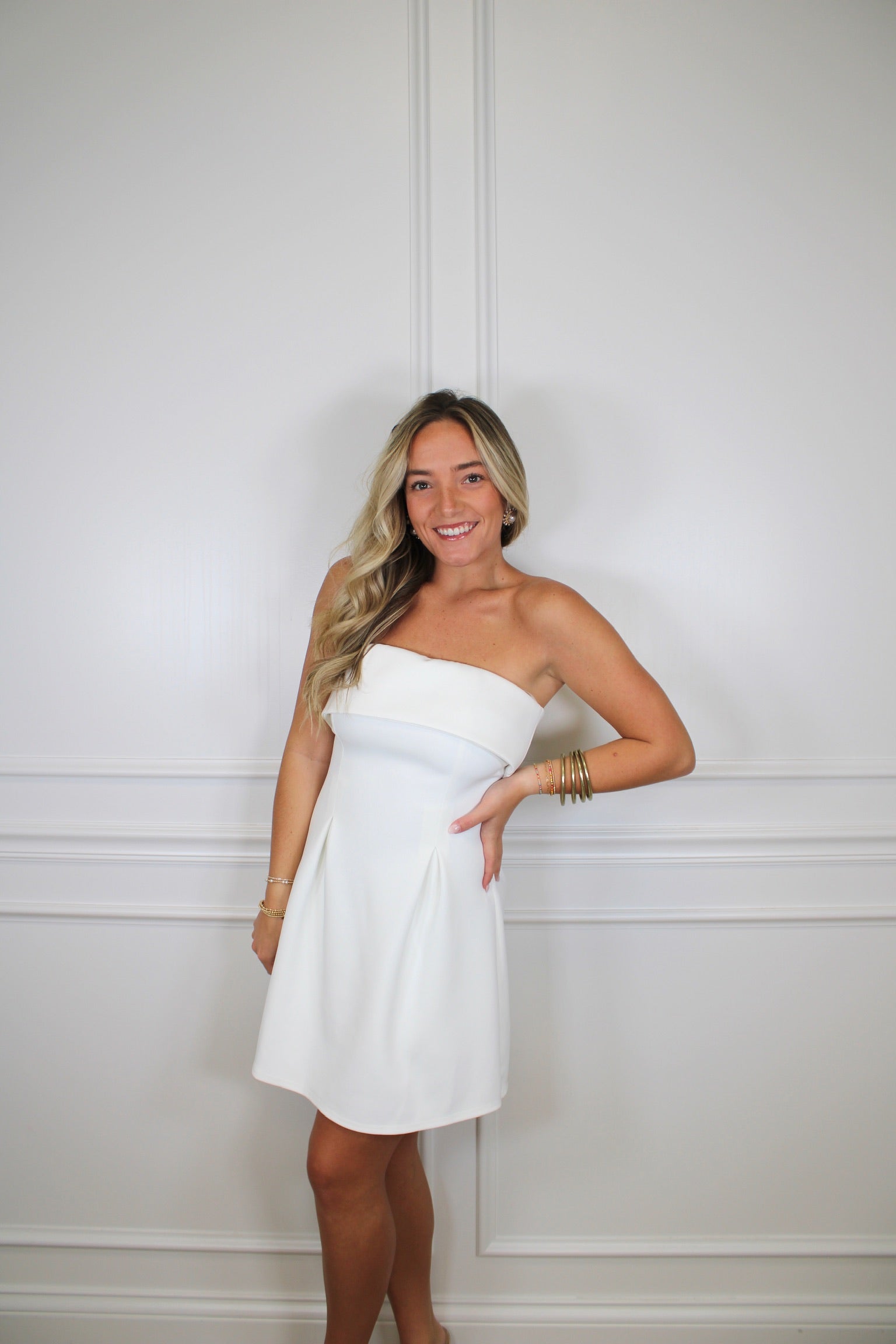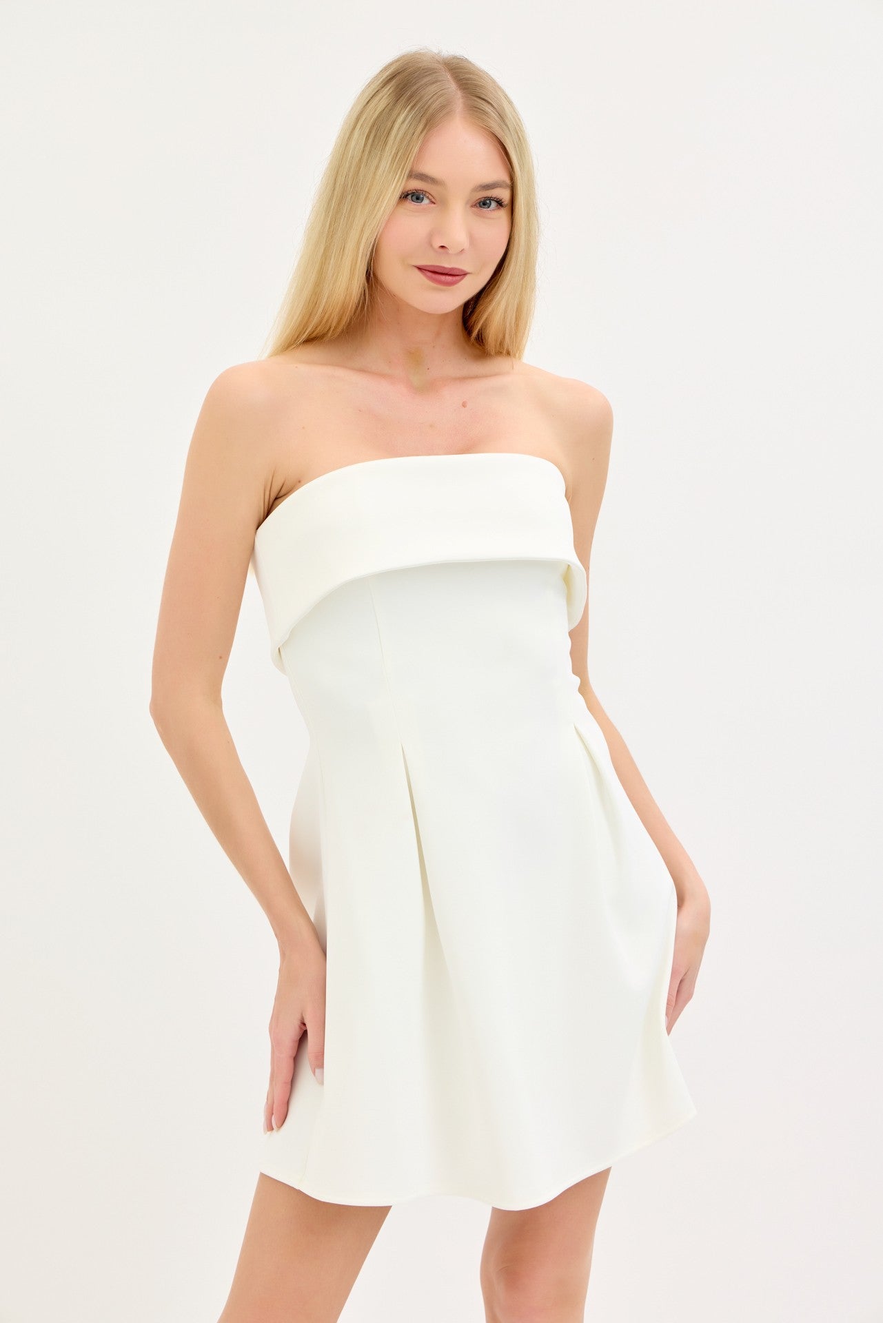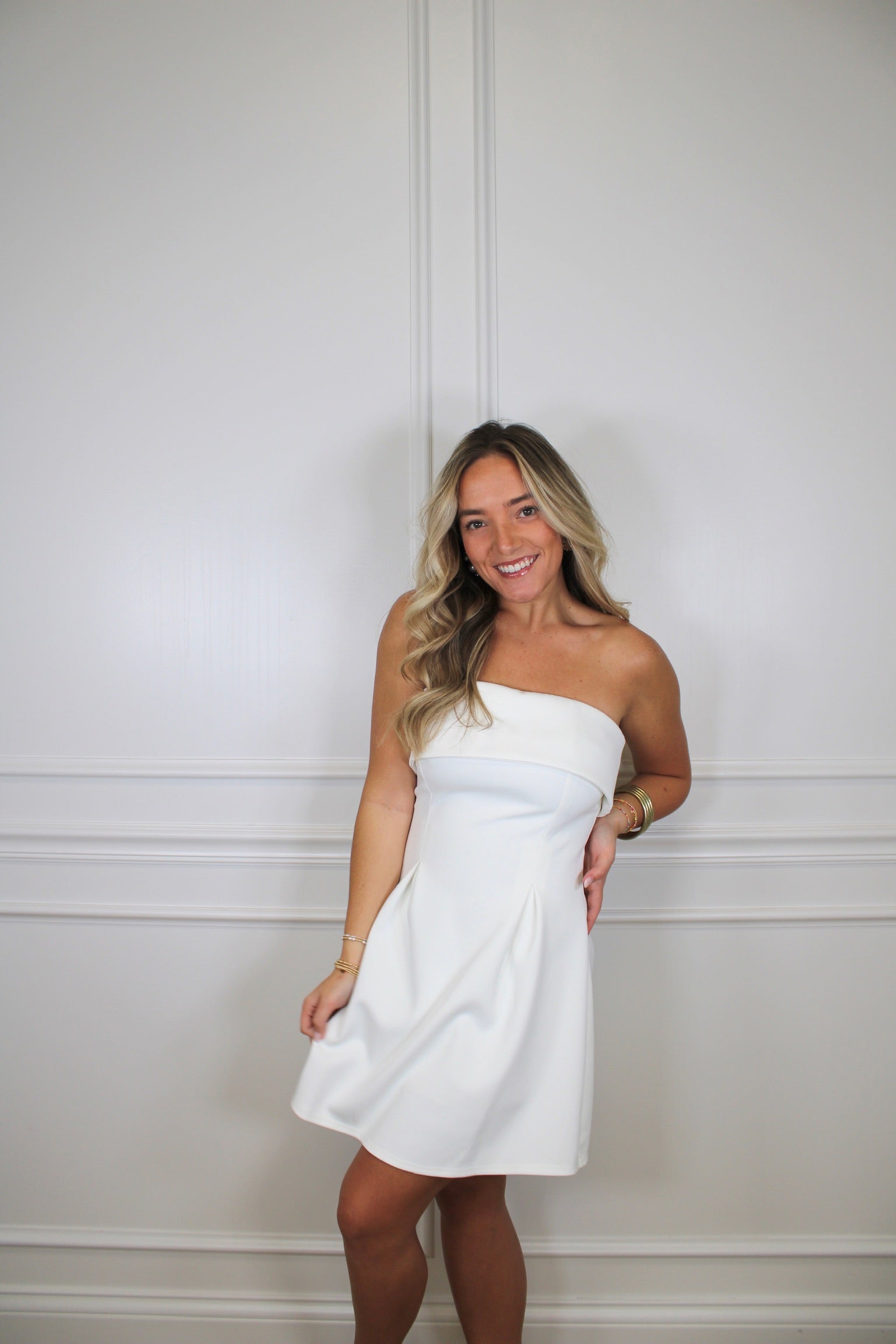 The Gracen Dress is your go-to pick for those "wow" moments! This strapless stunner features a flattering A-line silhouette crafted from sleek scuba material that holds its shape beautifully. Whether you're walking down the aisle, celebrating graduation day, or turning heads at any special occasion, this mini dress delivers effortless elegance with a fun, confident vibe. The structured fabric keeps you looking polished all day long, while the timeless design works for countless celebrations ahead.