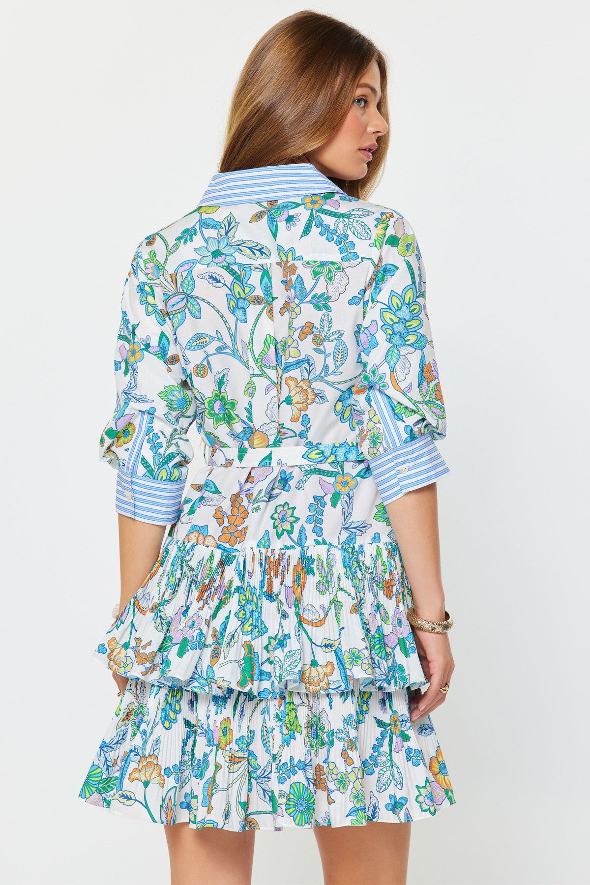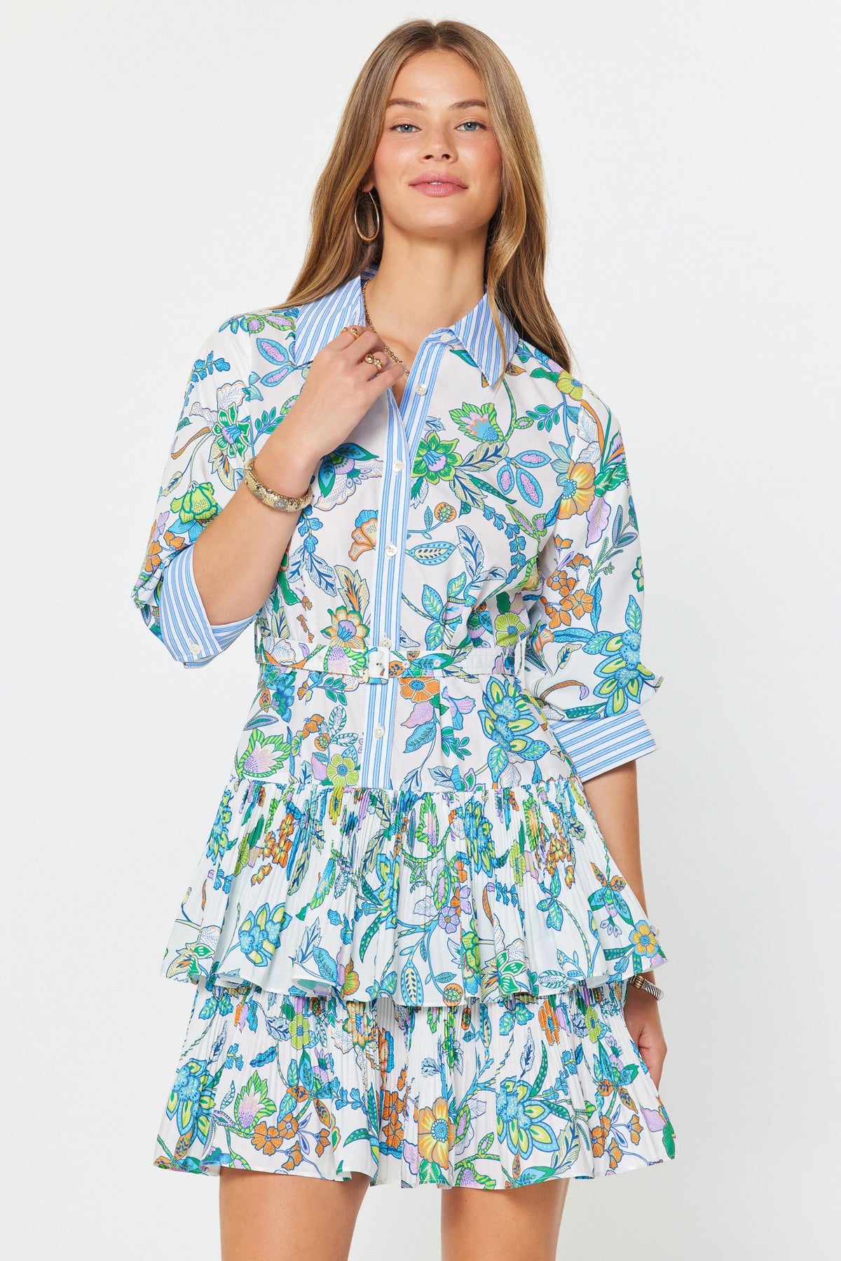 Elevate your wardrobe with this paisley-printed mini dress that combines timeless style with modern flair. The button-down front and three-quarter sleeves offer classic appeal, while the tiered ruffle skirt adds playful texture and movement. A coordinating waist belt defines your silhouette for an effortlessly put-together look. Ideal for brunch dates, casual outings, or layered styling throughout the seasons.