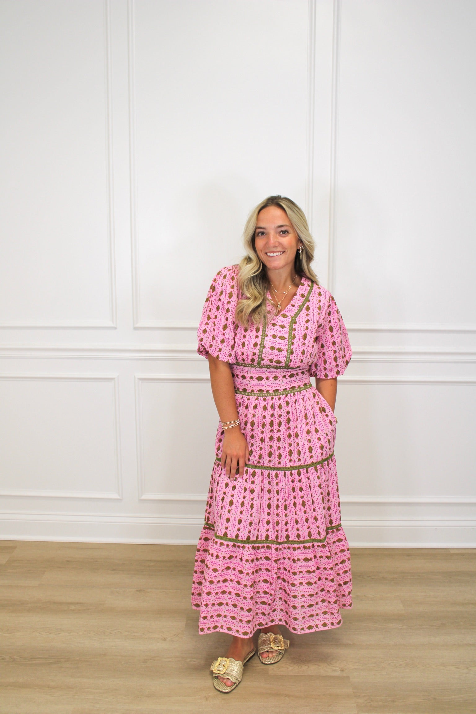 Step into a world of whimsy with the Dreaming of Dahlias Maxi. This pink dress, accented with lively green details, brings a playful burst of color and charm to your wardrobe. Its fun design makes it perfect for sunny days and joyful occasions, letting you express your vibrant spirit with every twirl.