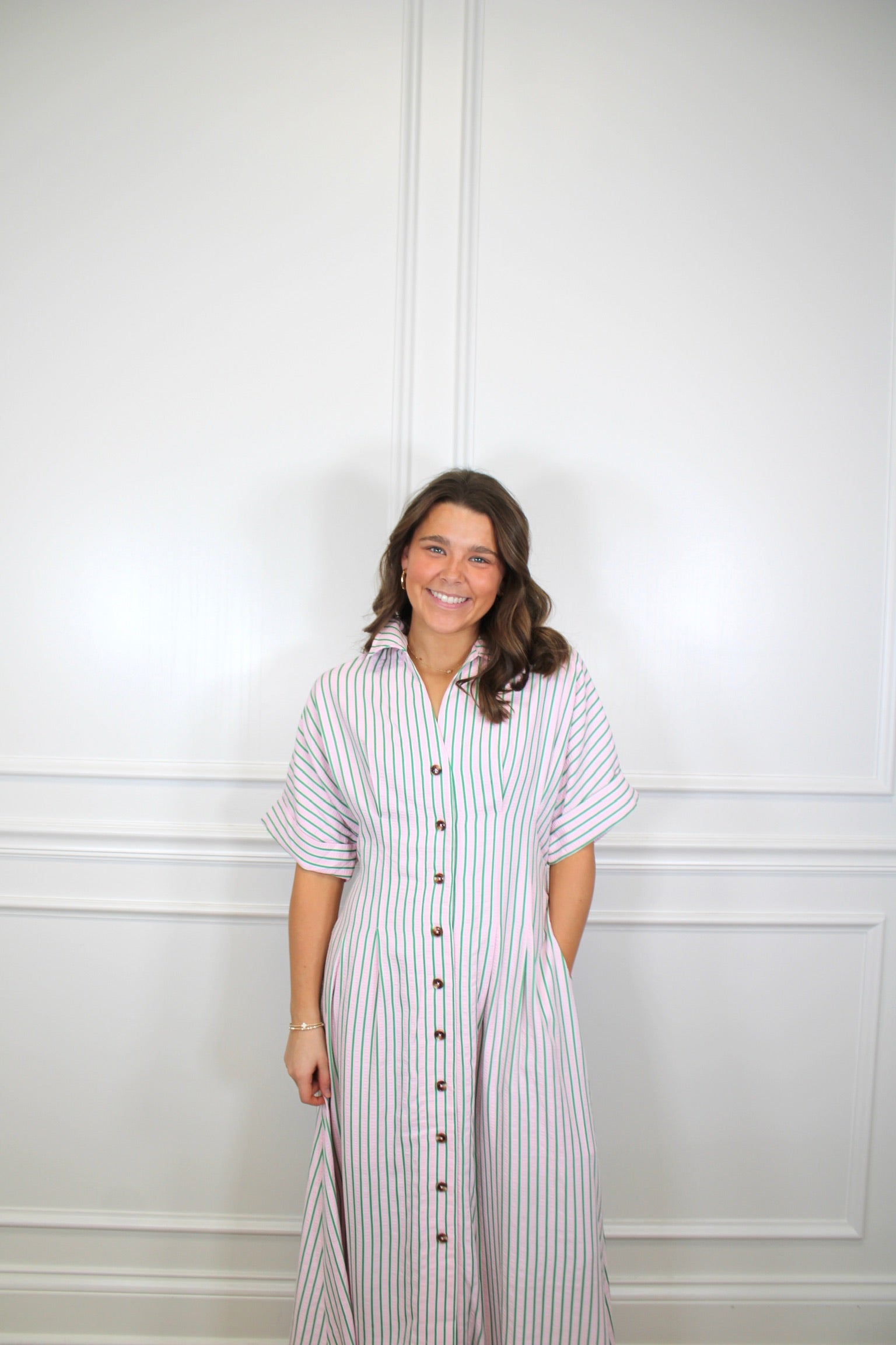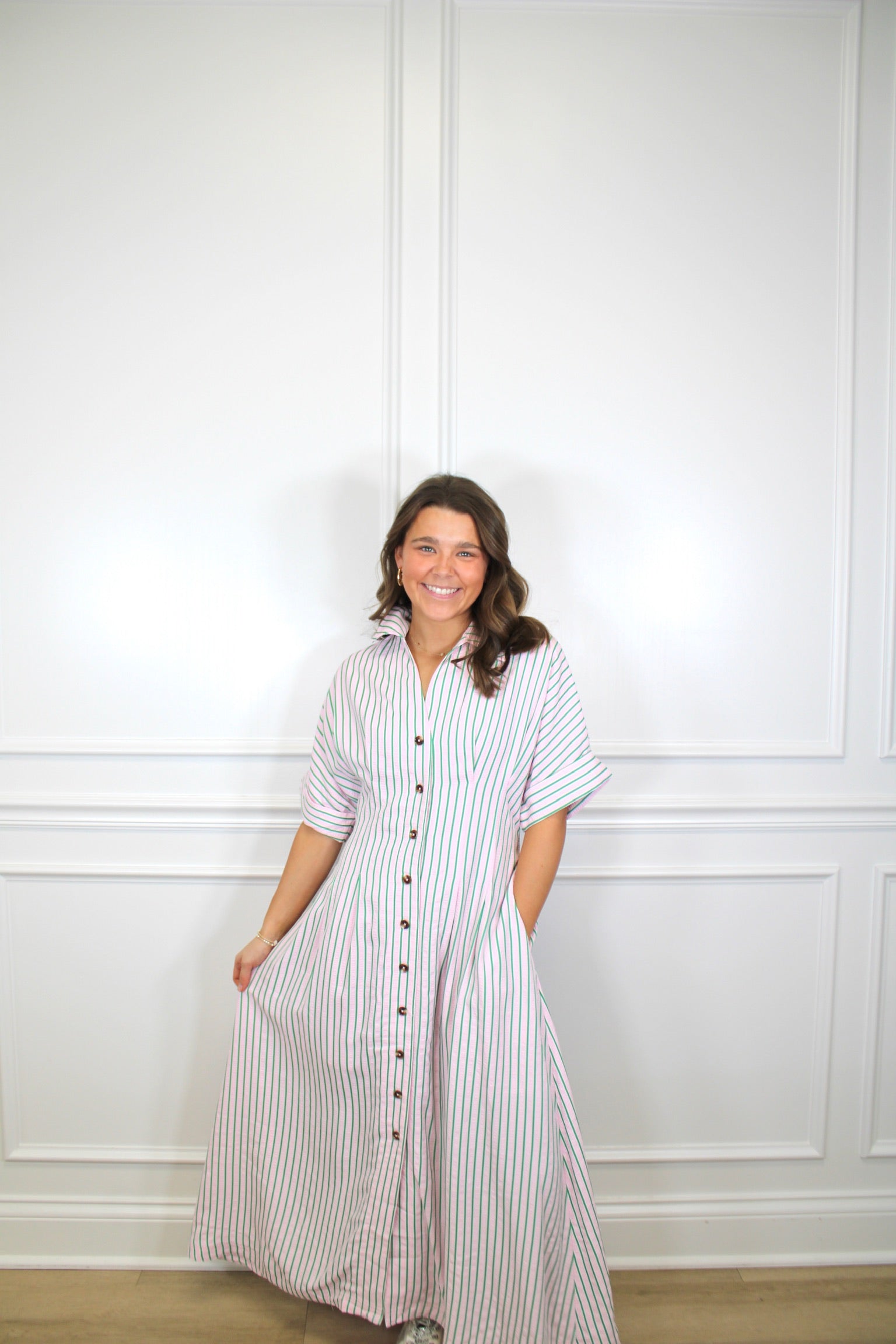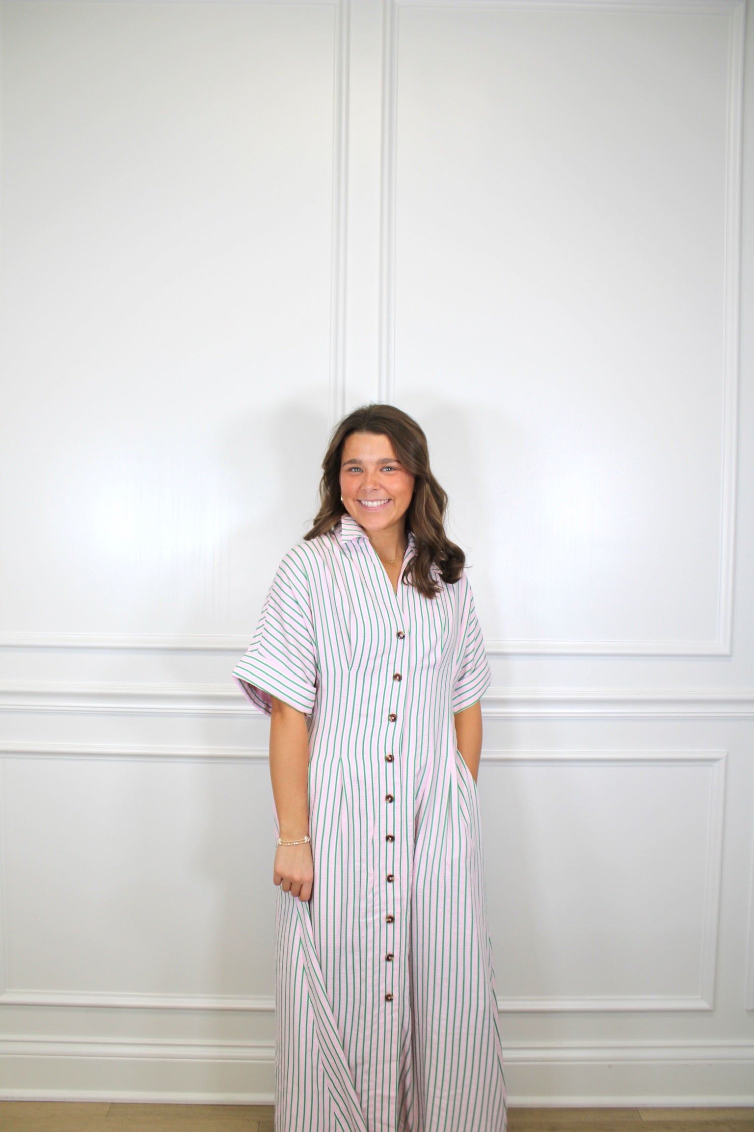 The Ellecia Midi is your go-to dress for effortless style! This charming short-sleeve button-down features a classic striped pattern that never goes out of style. The pleated synch waist cinches at just the right spot, creating a flattering silhouette that's both comfortable and chic. Perfect for everything from casual outings to weekend brunches—dress it up or down with ease!