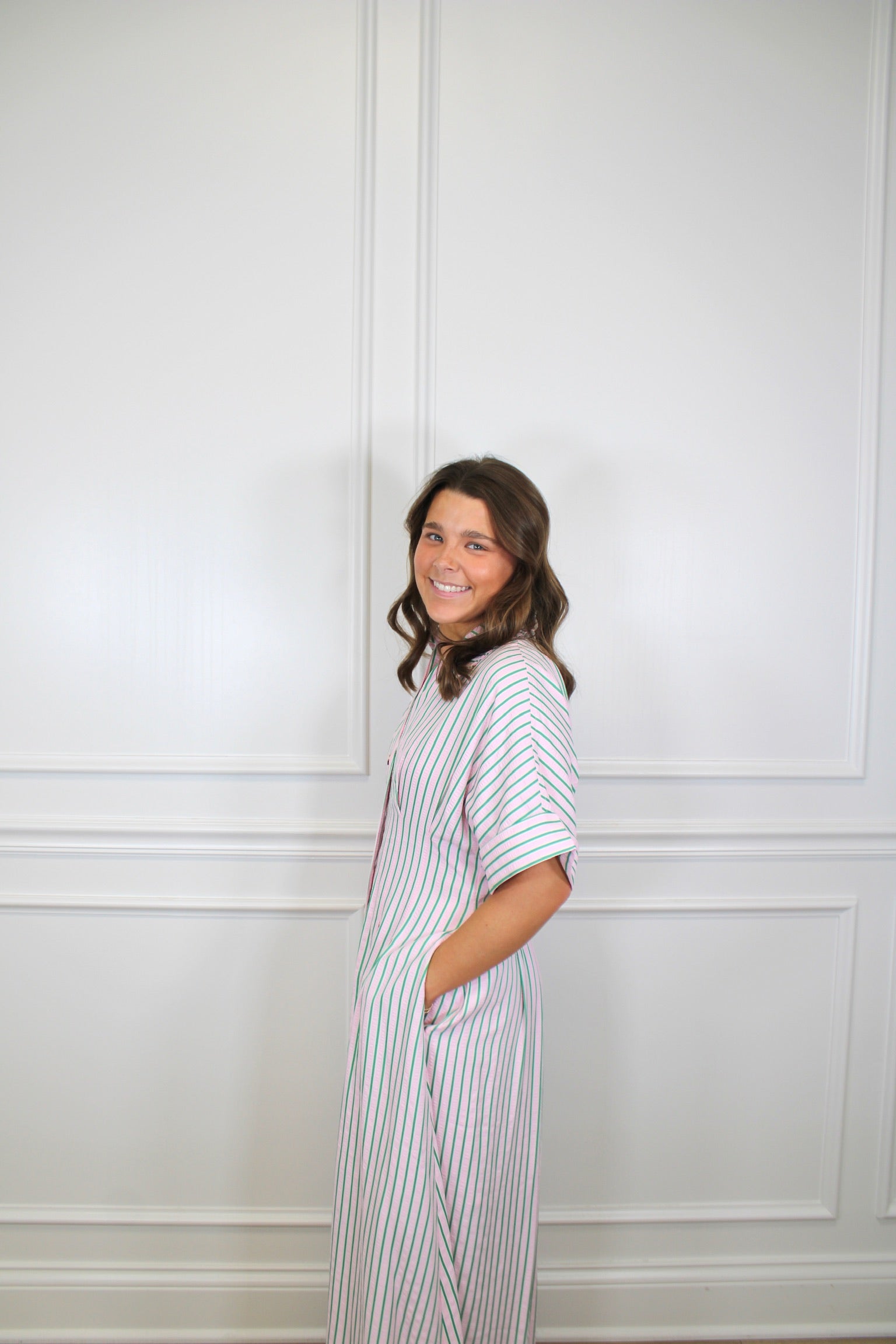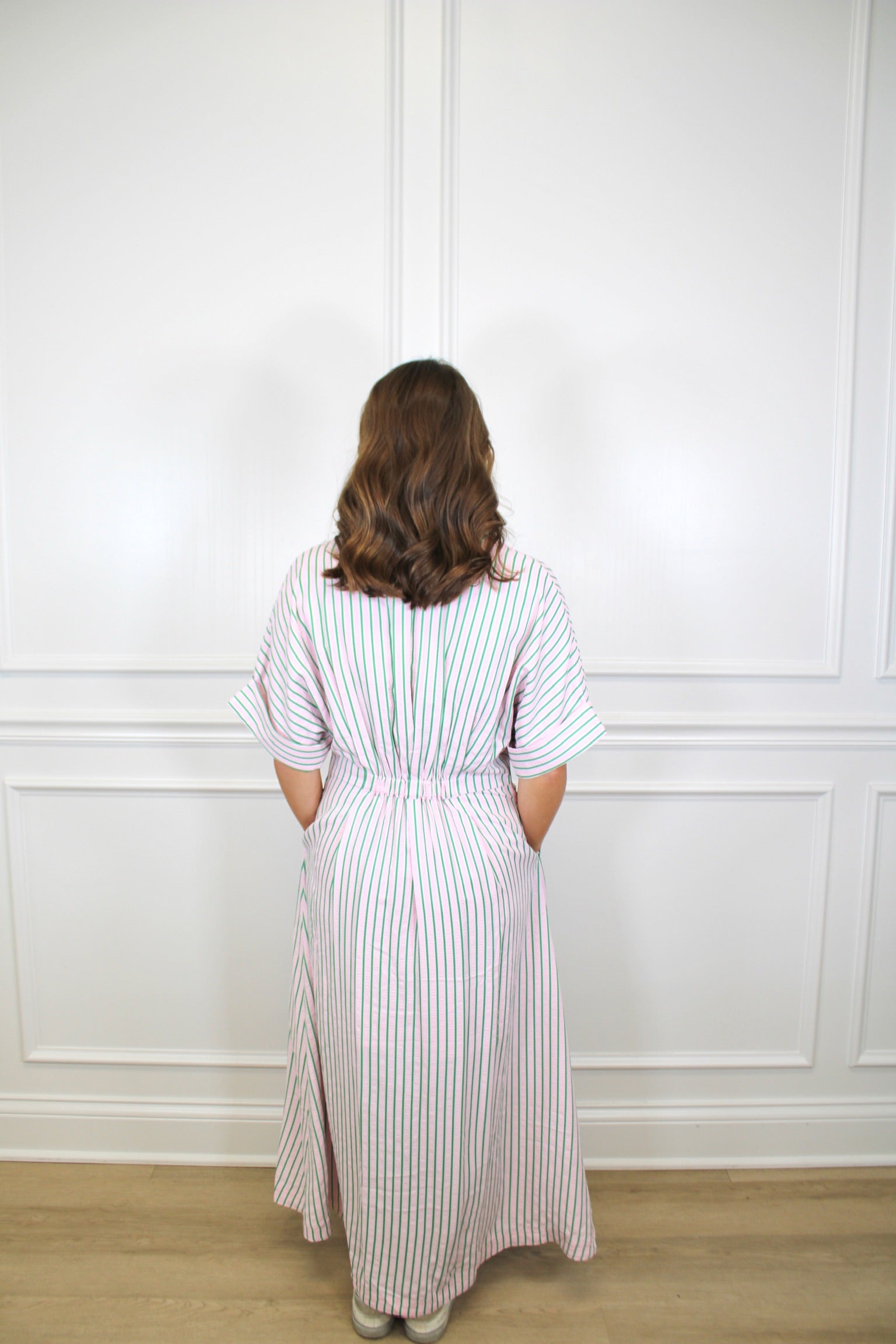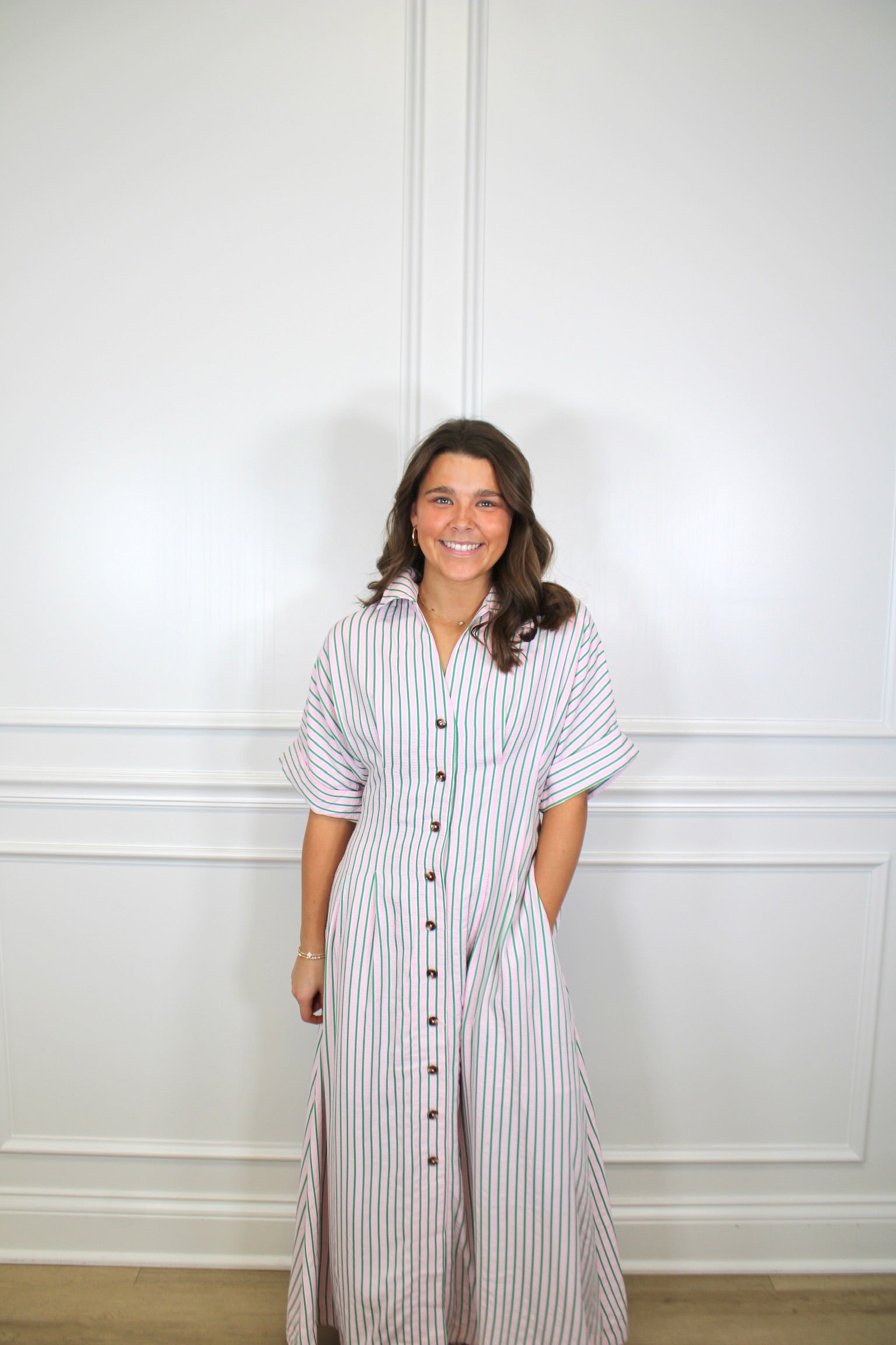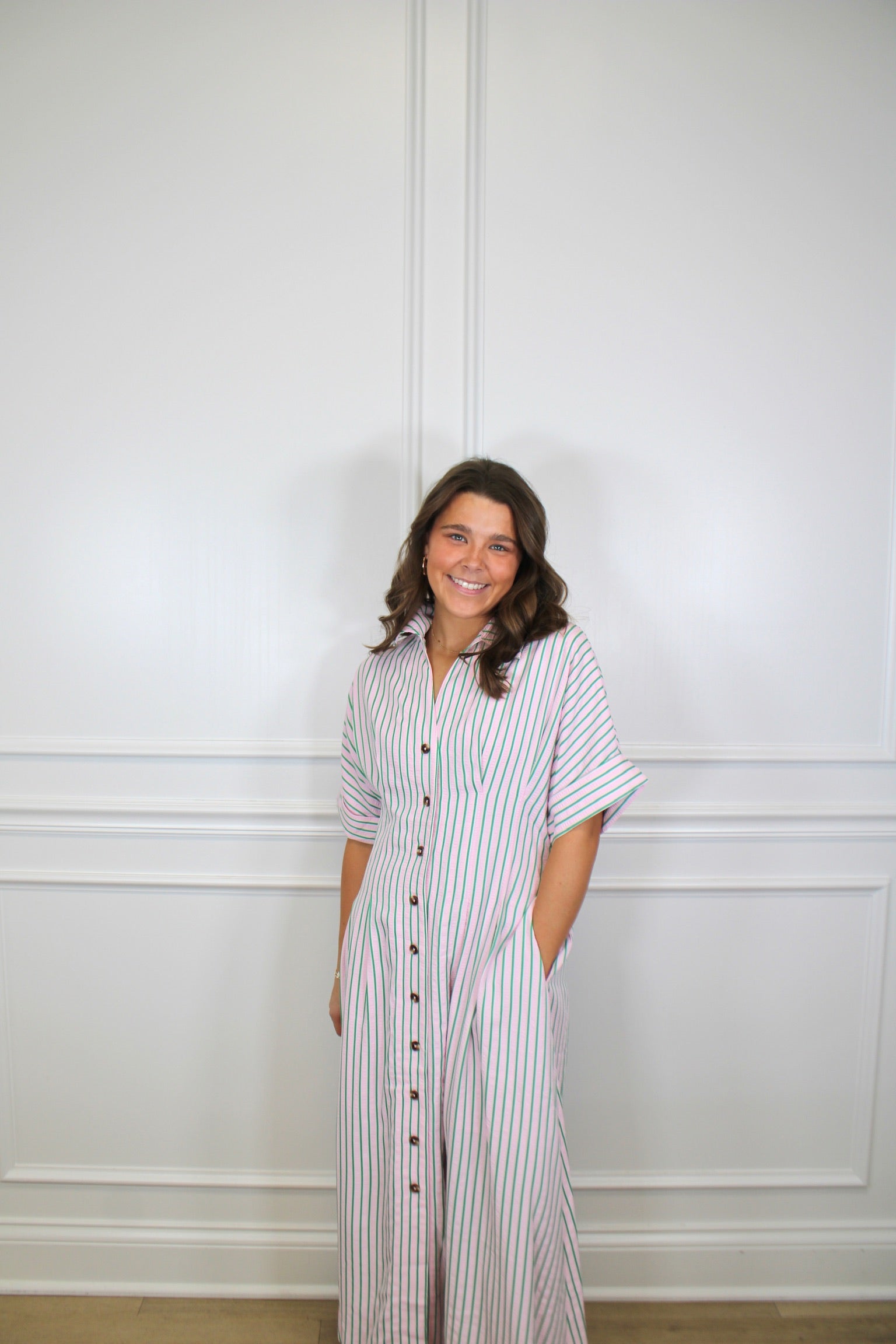 The Ellecia Midi is your go-to dress for effortless style! This charming short-sleeve button-down features a classic striped pattern that never goes out of style. The pleated synch waist cinches at just the right spot, creating a flattering silhouette that's both comfortable and chic. Perfect for everything from casual outings to weekend brunches—dress it up or down with ease!