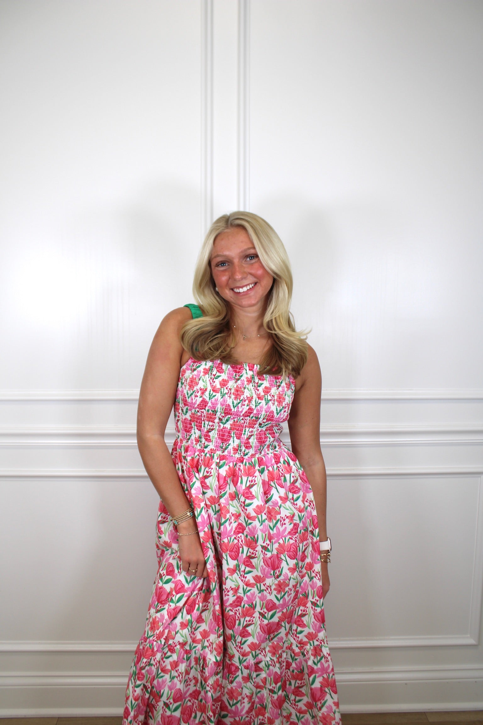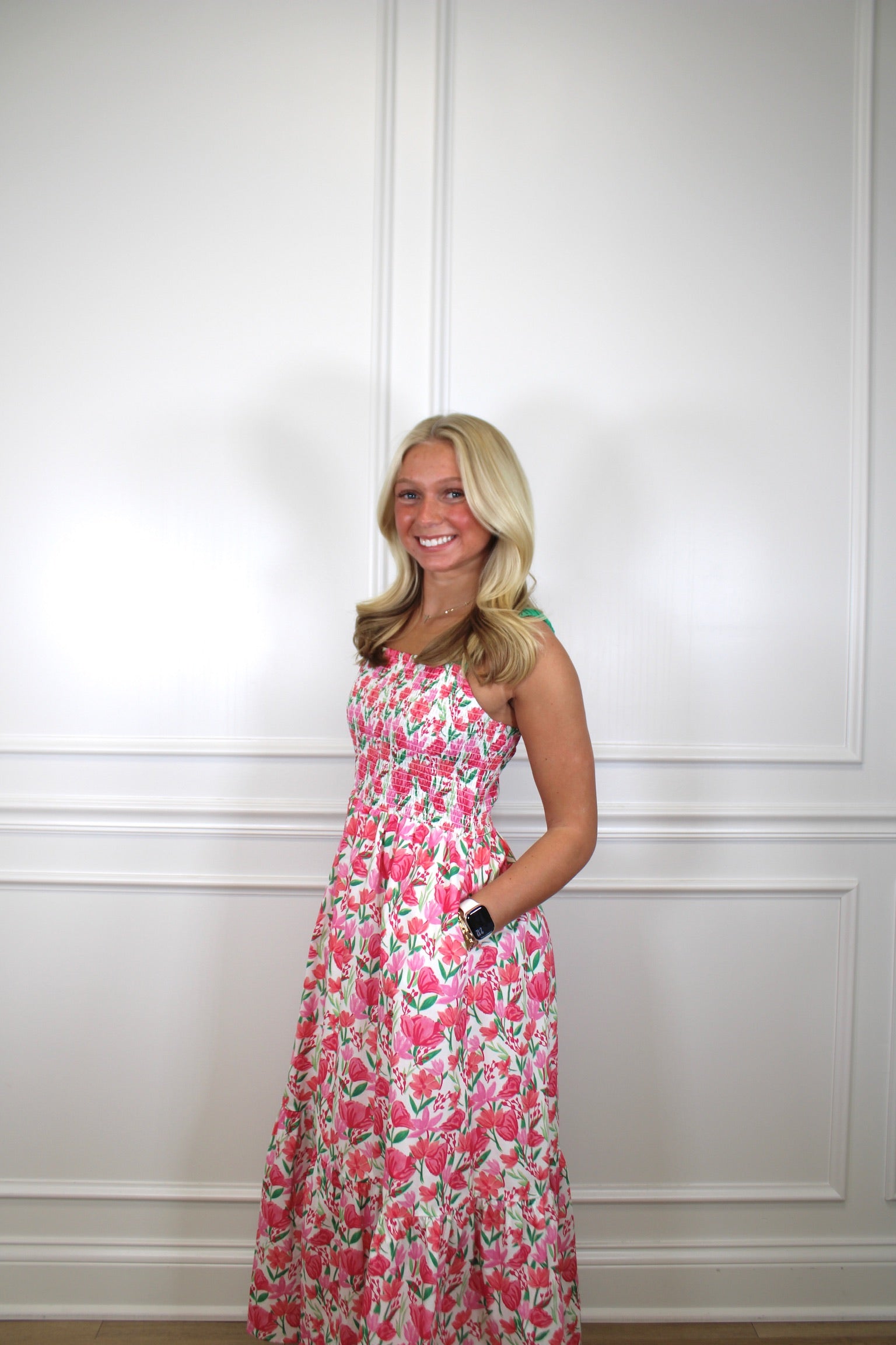 Twirl into springtime style with this charming maxi dress featuring a delicate floral print that celebrates nature's prettiest palette. The smocked bodice provides a flattering, comfortable fit that moves with you, while the tiered skirt adds playful dimension and effortless grace. Perfect for garden parties, picnics, or any occasion calling for a touch of whimsy and romance. Slip it on and let the blooms do the talking.